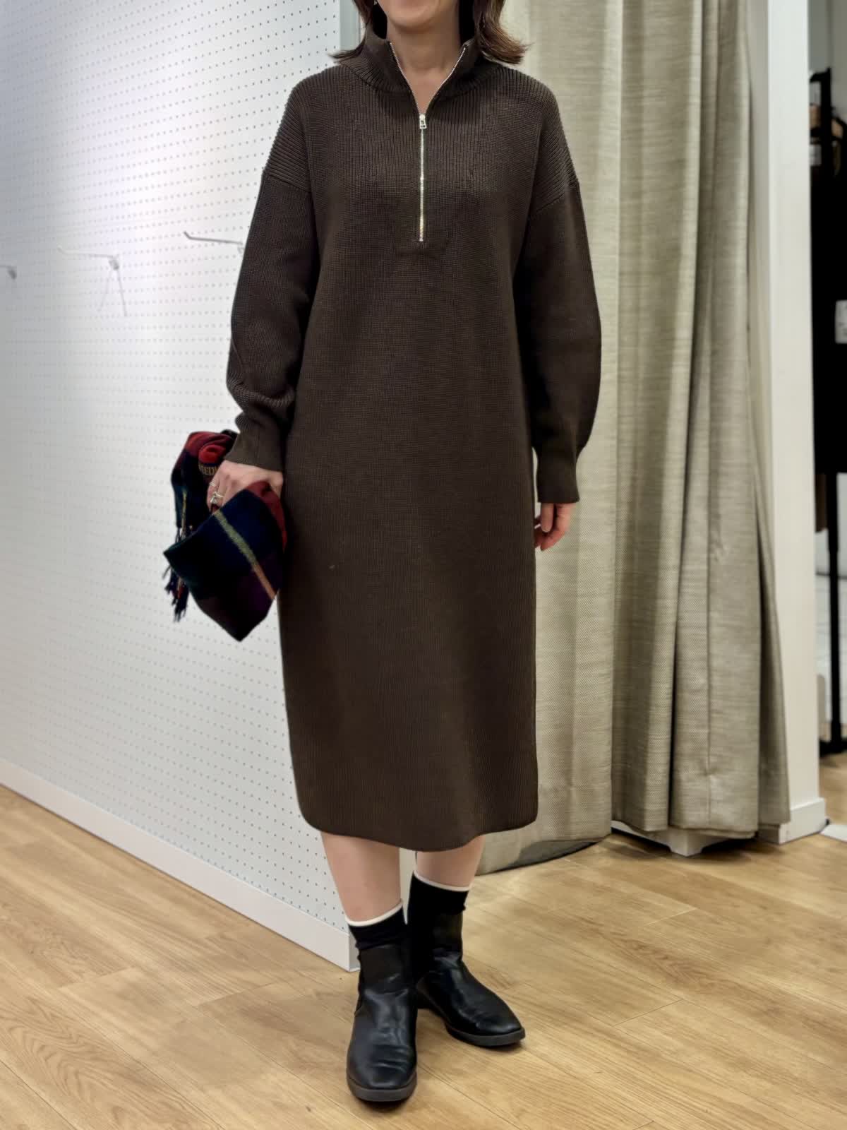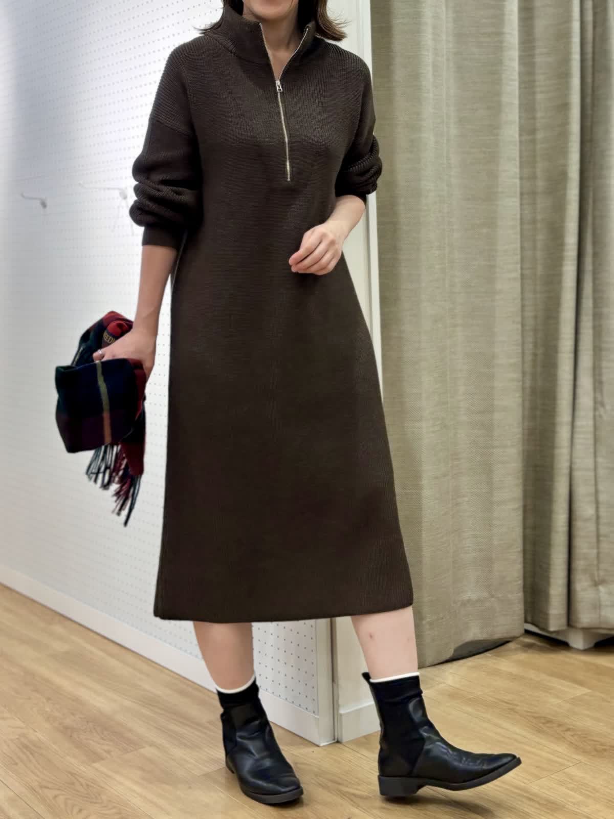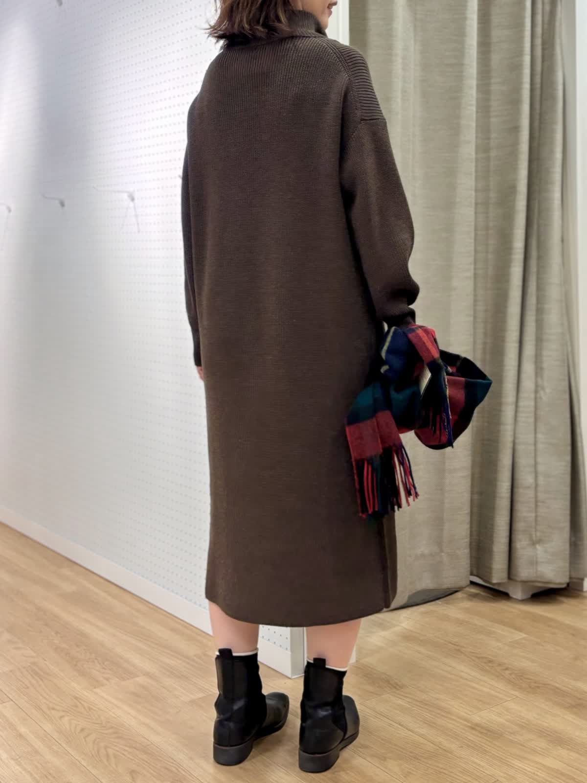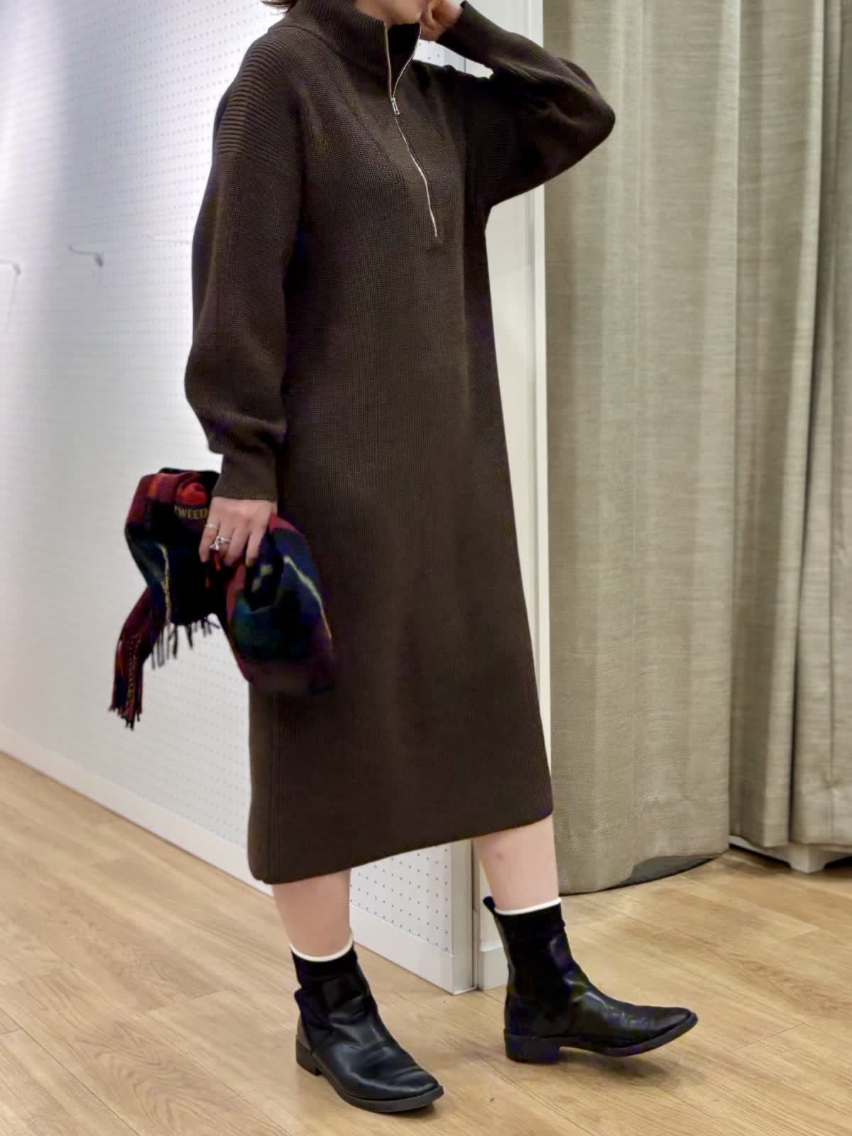 【着用カラー/サイズ】 ワンピース:ブラウン/フリー コート:ブラック/フリー 週末のリラックスお出掛けコーデ。快適にオシャレを楽しめるニットワンピースは1着あると万能です。特に年末年始に向けた移動が増える時期にあると安心です。ハーフジップだから首元の演出も楽しめます。程良い肉感で身体のラインも拾わず着られます。ヒップ丈のピーコートは非常に軽いです。丈が長すぎないのでジャケット感覚で羽織れて気楽です。