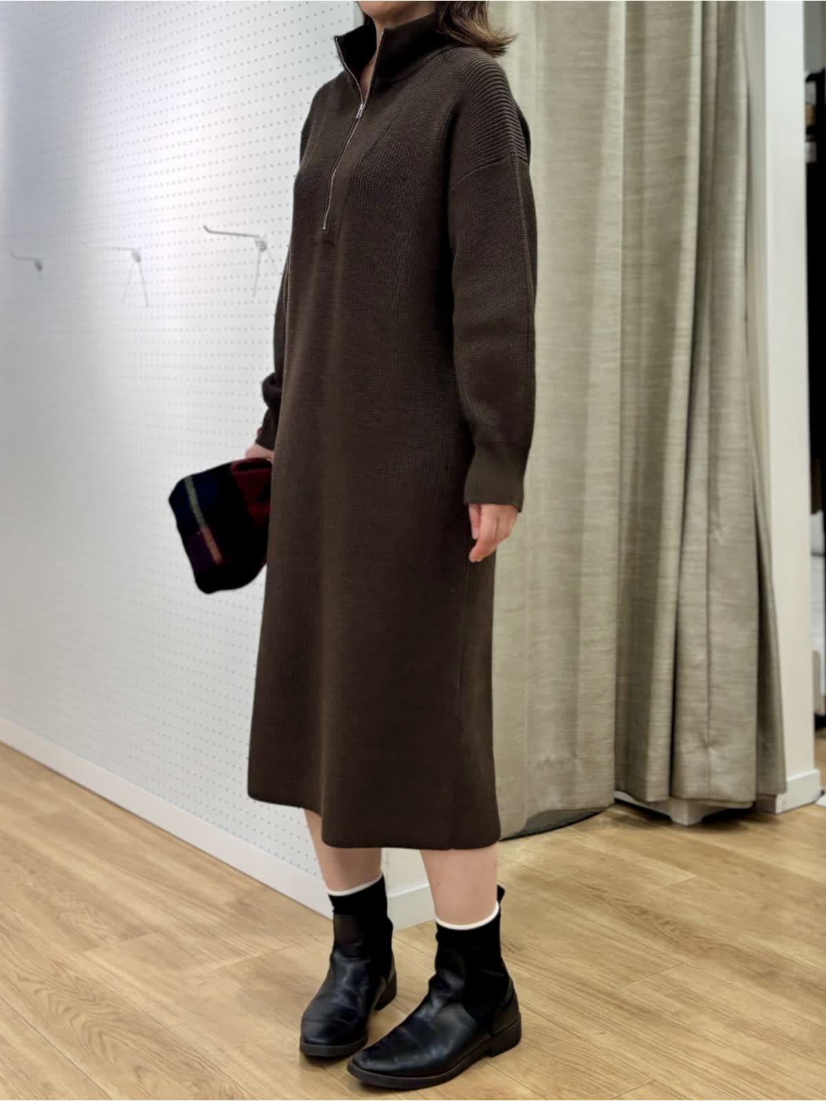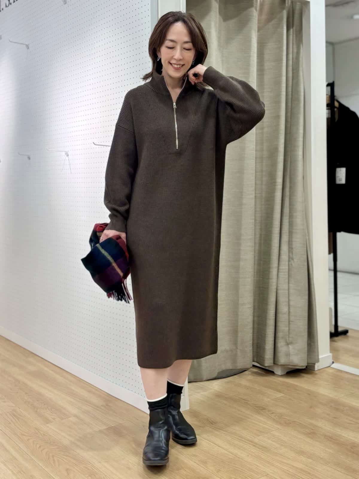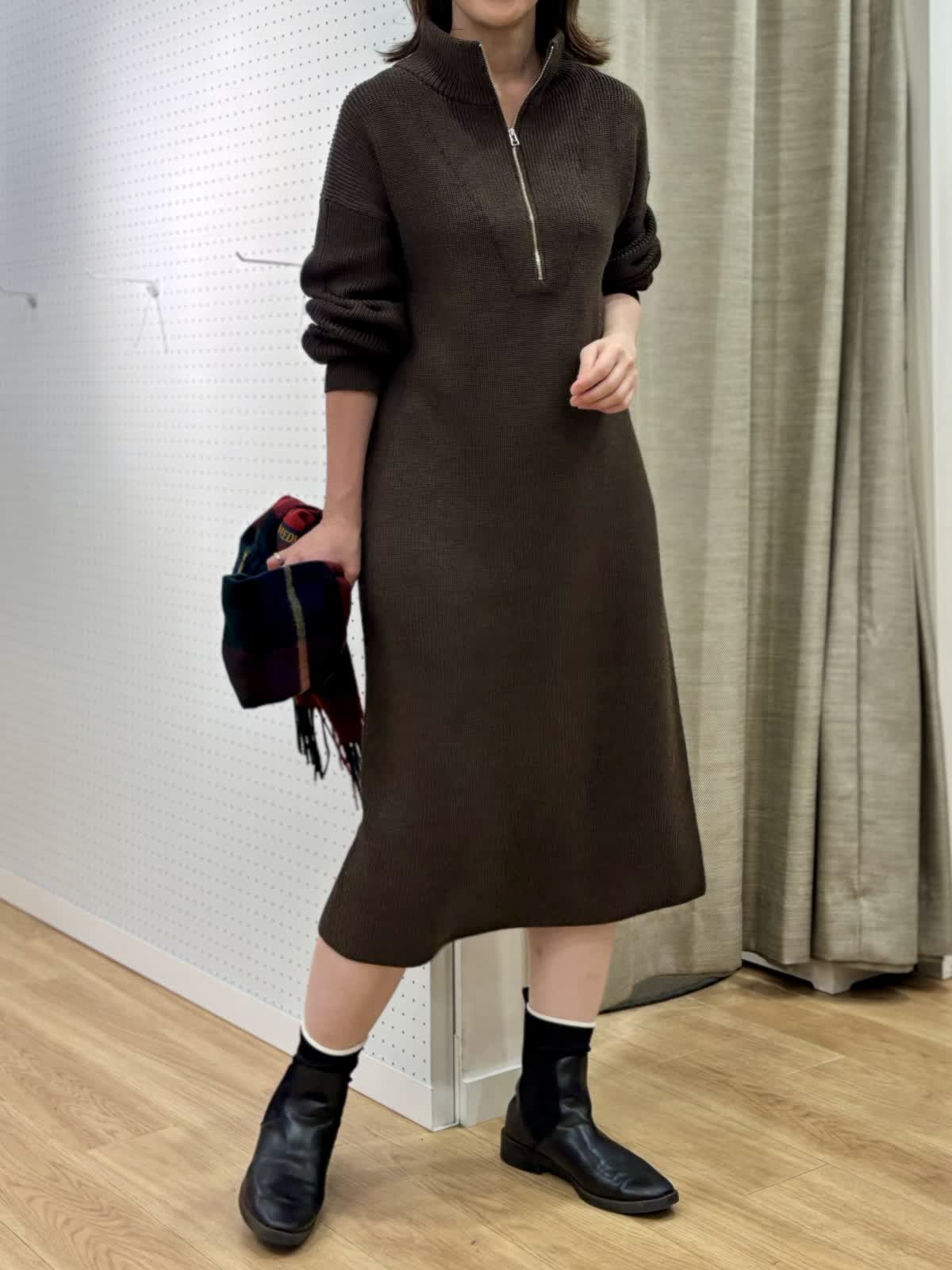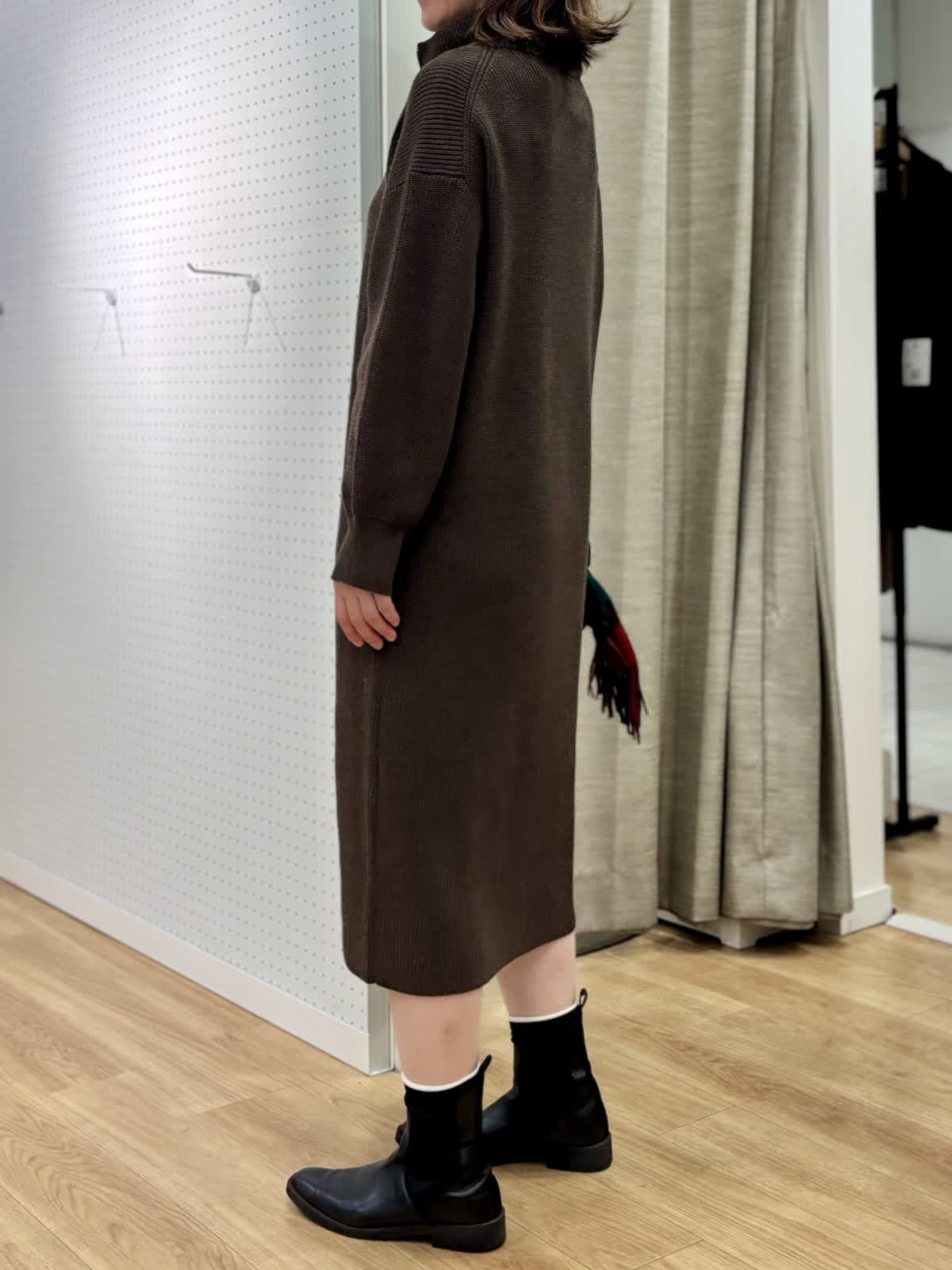 【着用カラー/サイズ】 ワンピース:ブラウン/フリー コート:ブラック/フリー 週末のリラックスお出掛けコーデ。快適にオシャレを楽しめるニットワンピースは1着あると万能です。特に年末年始に向けた移動が増える時期にあると安心です。ハーフジップだから首元の演出も楽しめます。程良い肉感で身体のラインも拾わず着られます。ヒップ丈のピーコートは非常に軽いです。丈が長すぎないのでジャケット感覚で羽織れて気楽です。