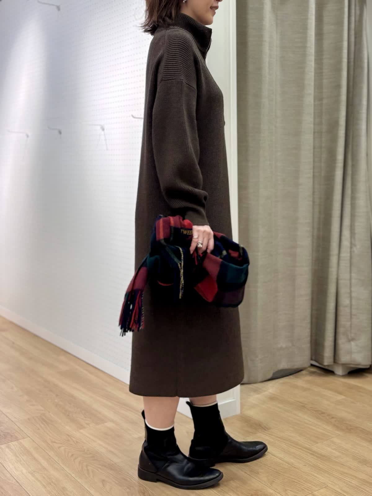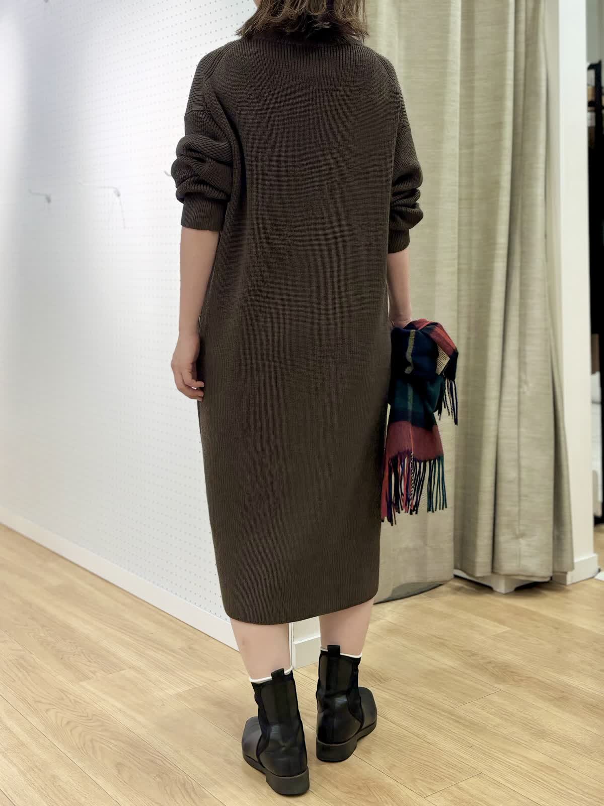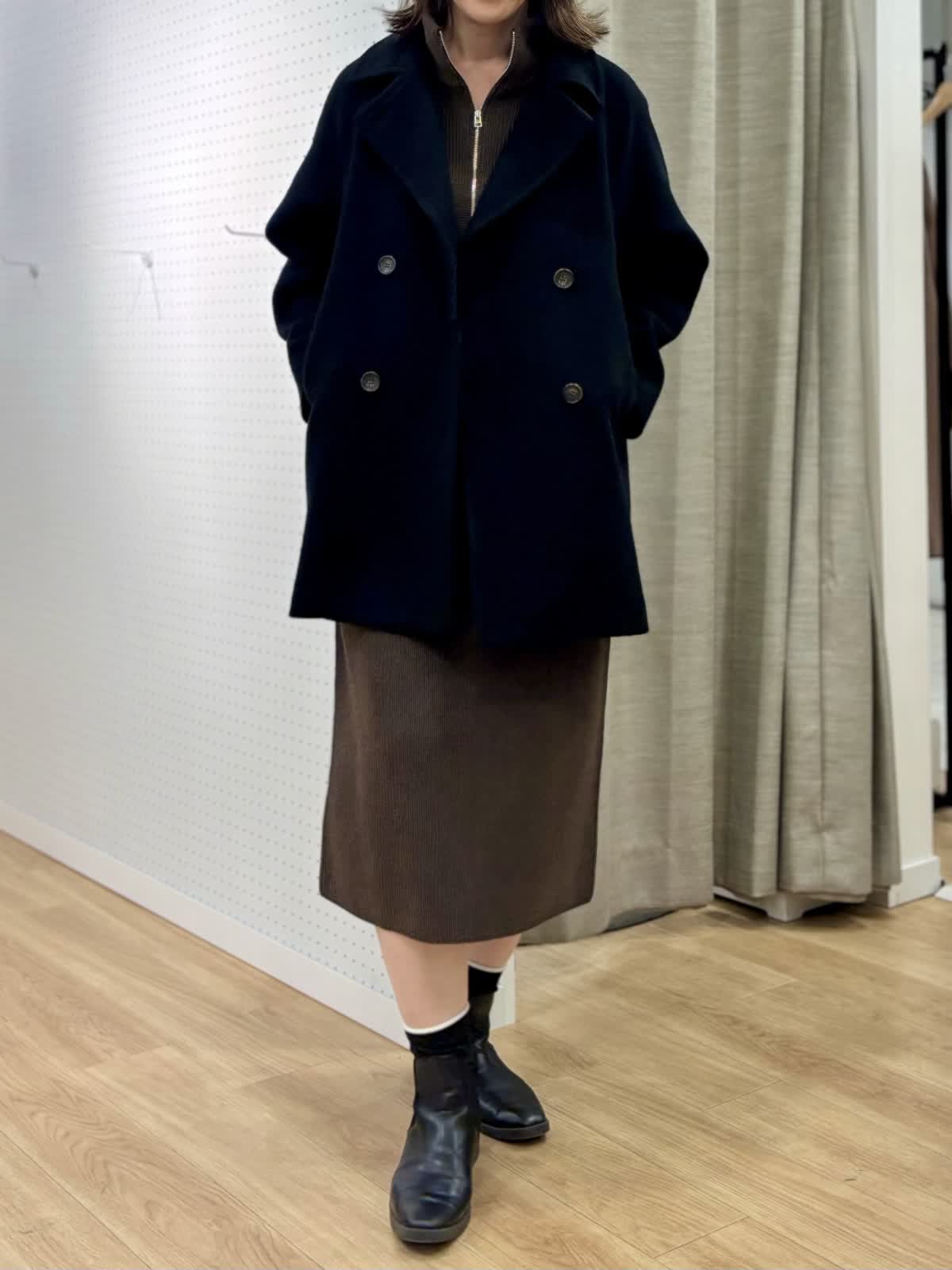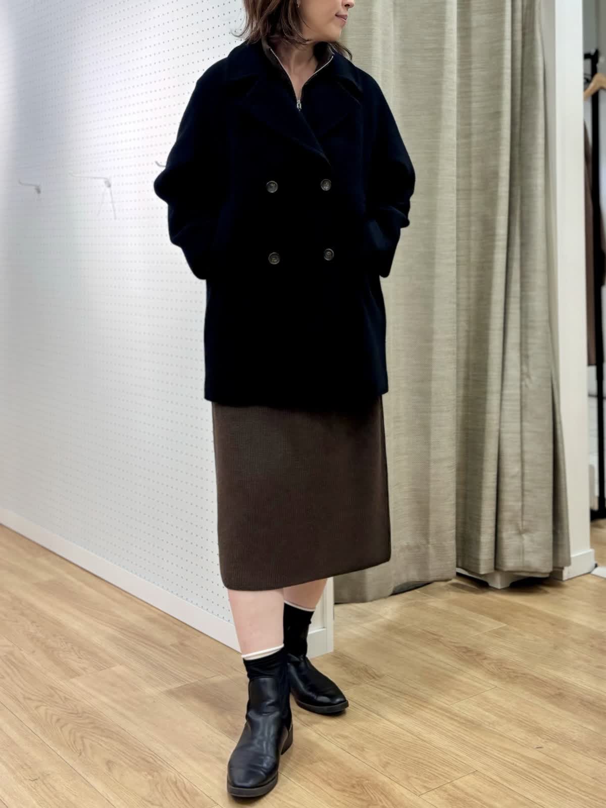 【着用カラー/サイズ】 ワンピース:ブラウン/フリー コート:ブラック/フリー 週末のリラックスお出掛けコーデ。快適にオシャレを楽しめるニットワンピースは1着あると万能です。特に年末年始に向けた移動が増える時期にあると安心です。ハーフジップだから首元の演出も楽しめます。程良い肉感で身体のラインも拾わず着られます。ヒップ丈のピーコートは非常に軽いです。丈が長すぎないのでジャケット感覚で羽織れて気楽です。