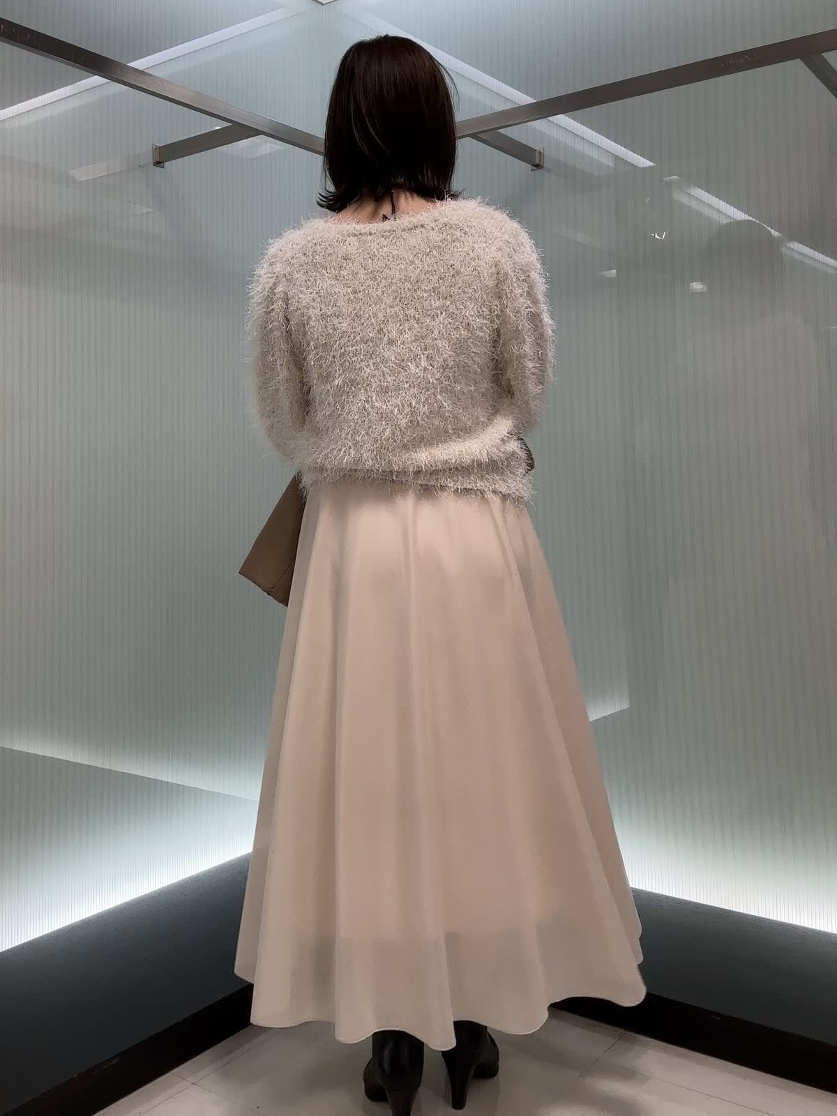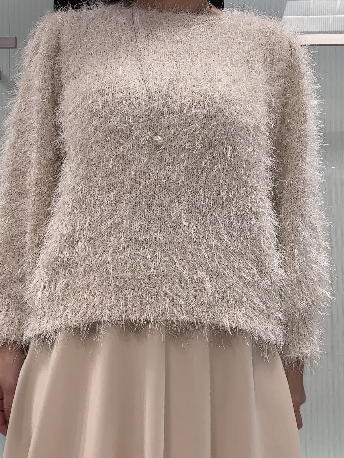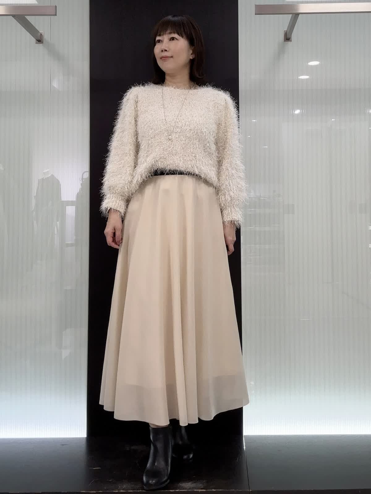【着用サイズ】全て9号 【着用カラー】ニット:オフホワイト スカート:アイボリー ふわふわなシャギーニットとスカートの華やかなシーンに映えるお出かけコーデ。ニットは、ふわっとした袖がフェミニンなデザインでラメのキラキラ感と、シャギーの素材感が上品で、1枚で着映えするニット。スカートは、ウエストゴム仕様で、楽な履き心地と、フレアシルエットが美しいデザイン。裾のシアー感が軽く着こなせる素材感です。