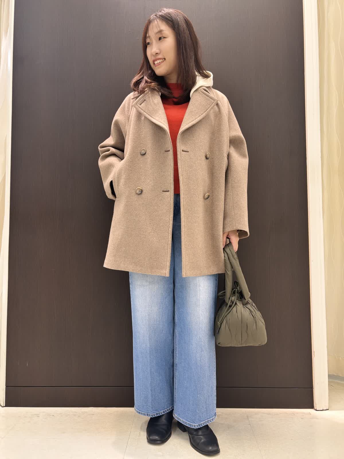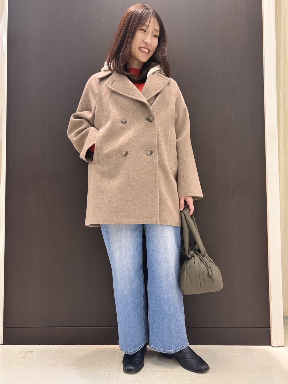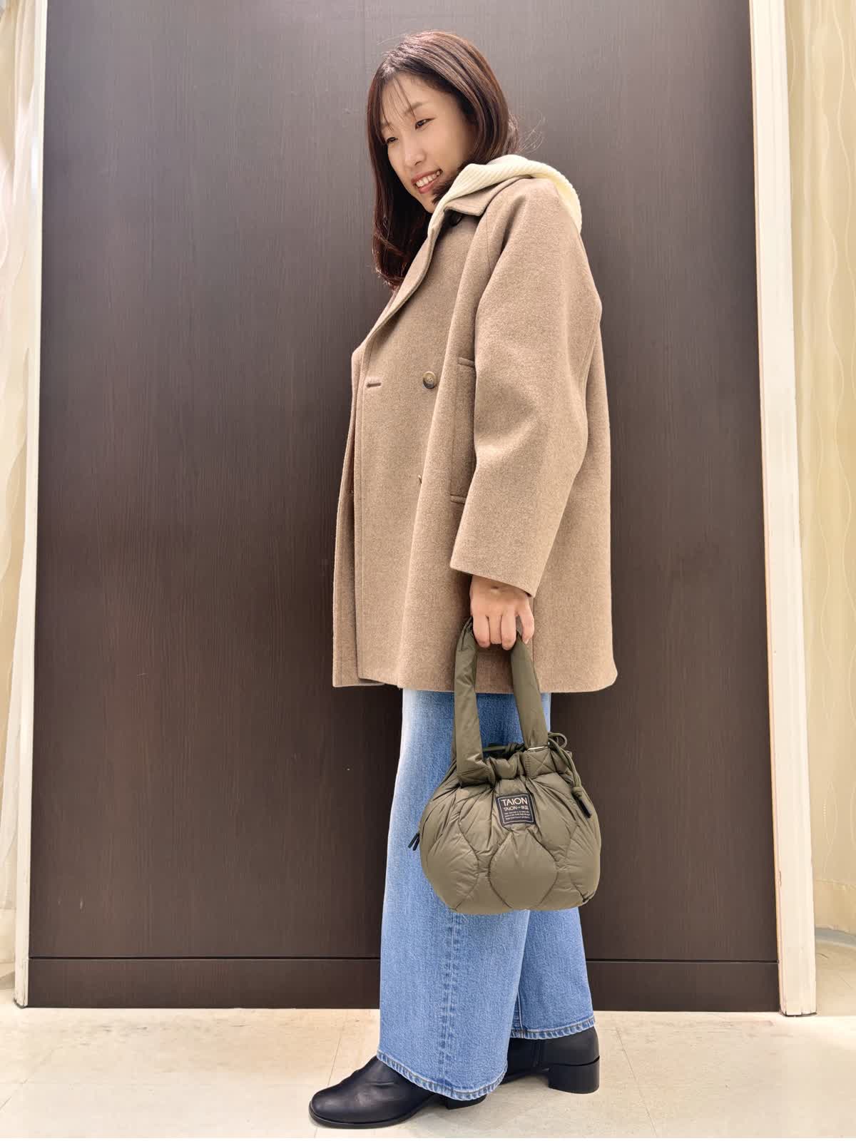 【着用カラー】コート:モカチャ ニット:シュイロ パンツ:ブルー マフラー:オフホワイト バッグ:カーキ