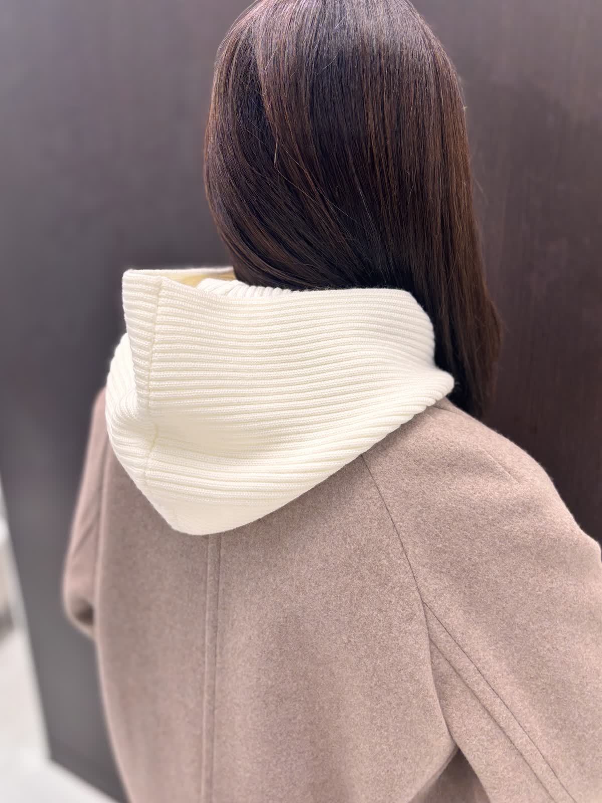 シュイロのニットがポイントのコーデ。Pコートはパンツスタイルにピッタリの着丈で何より軽くて暖かいので動きやすいです。ミドル丈なので腰までしっかりカバーできます。中をしっかり着込めるサイズ感でゆったりしています。フード見えさせることも出来るマフラーはちょこっと見せるだけでオシャレ見えしますし、寒ければぐるっと巻いてマフラーにも◎