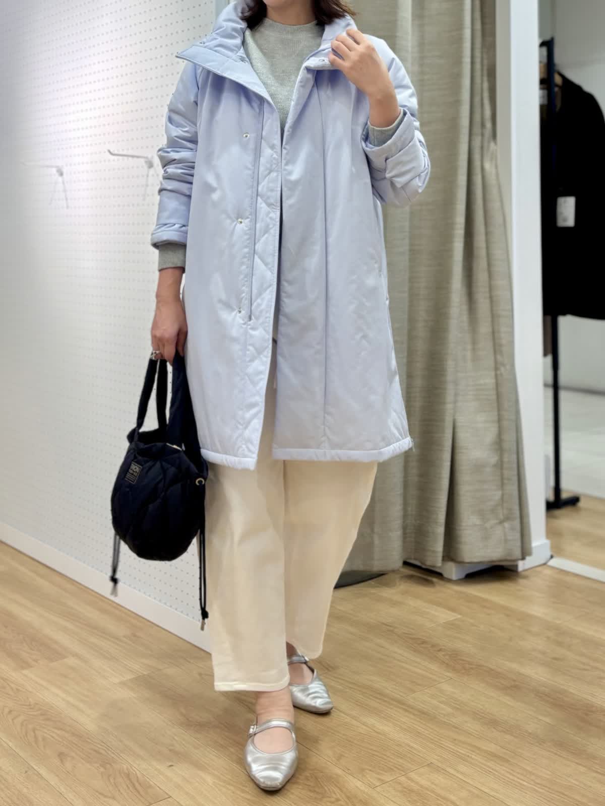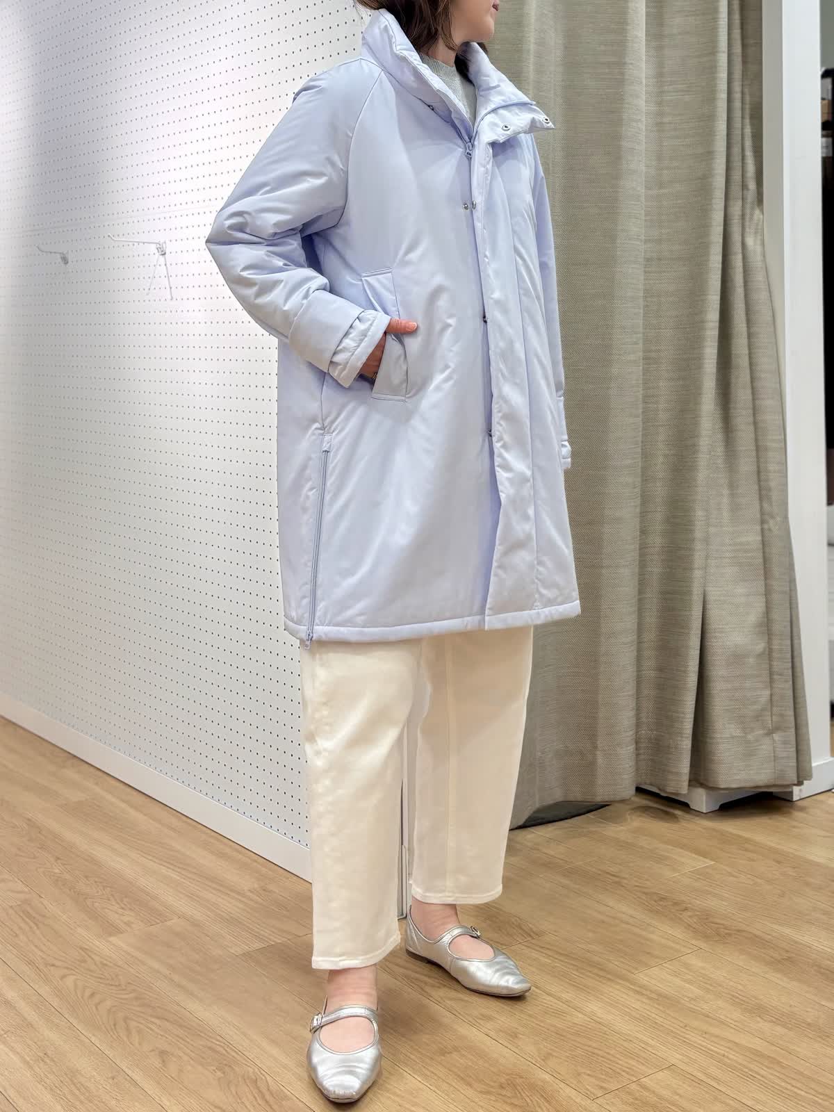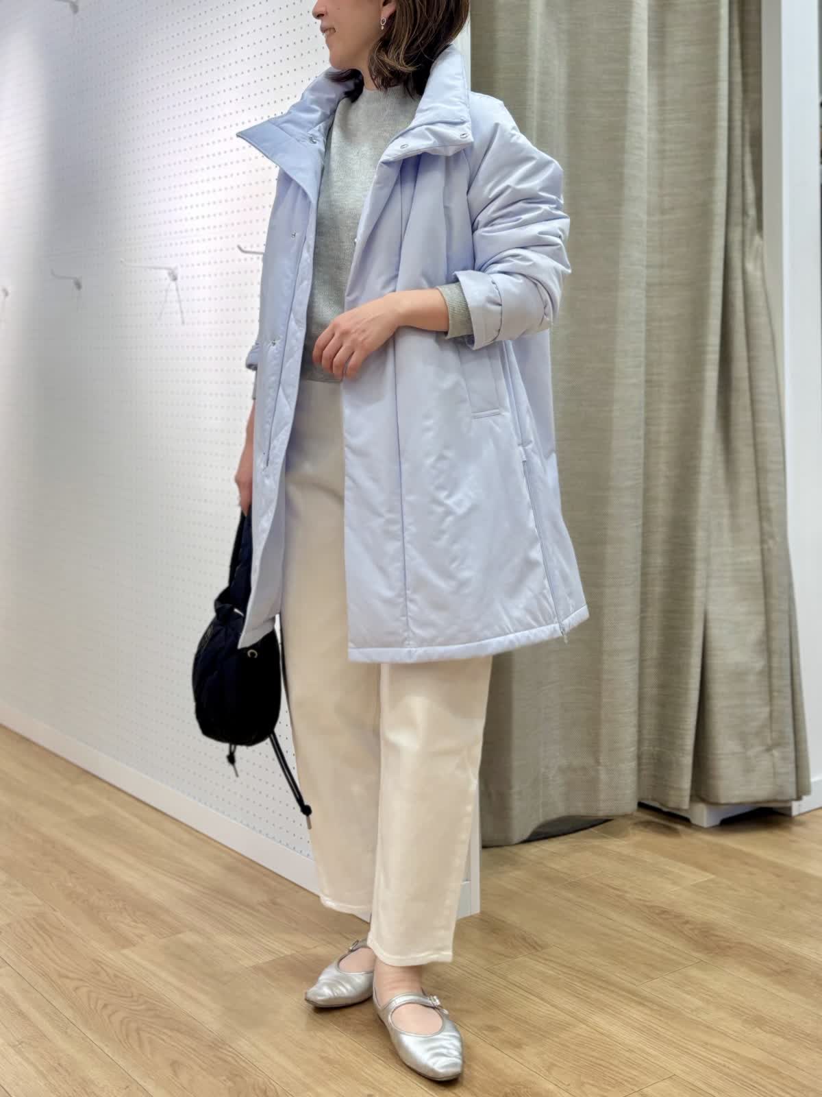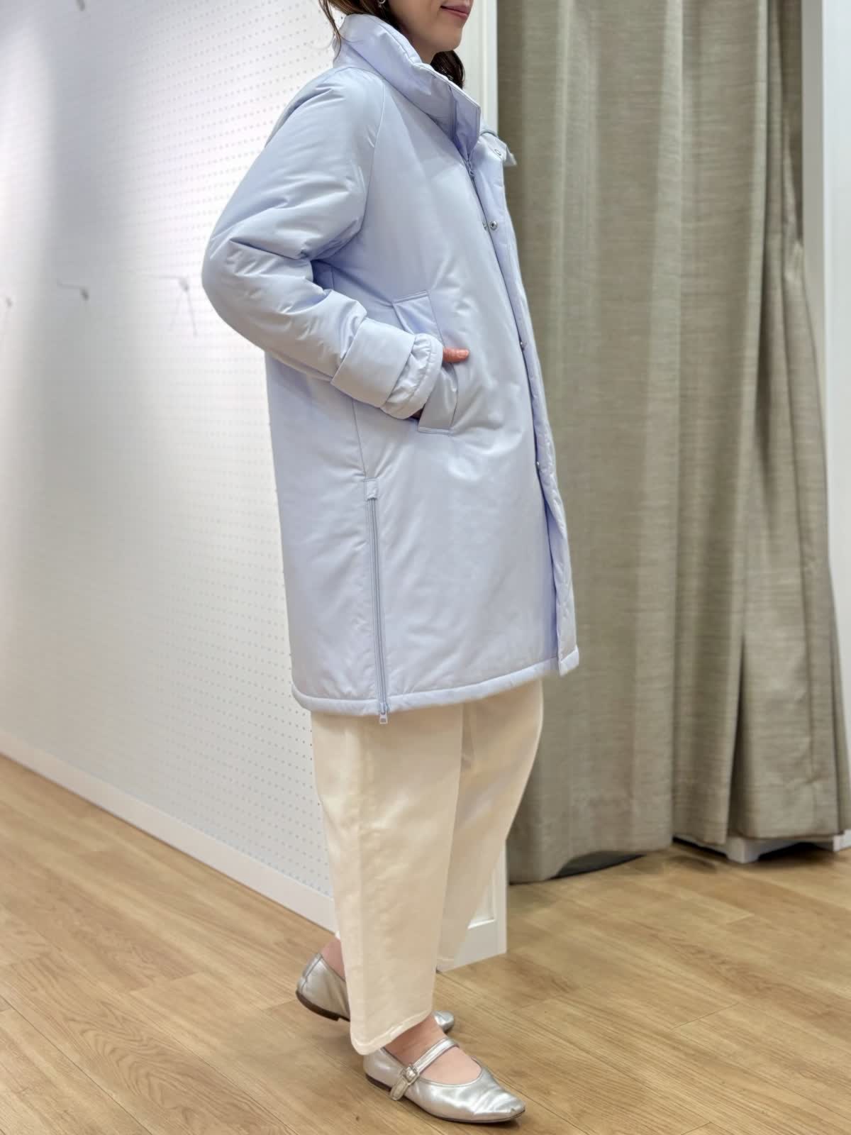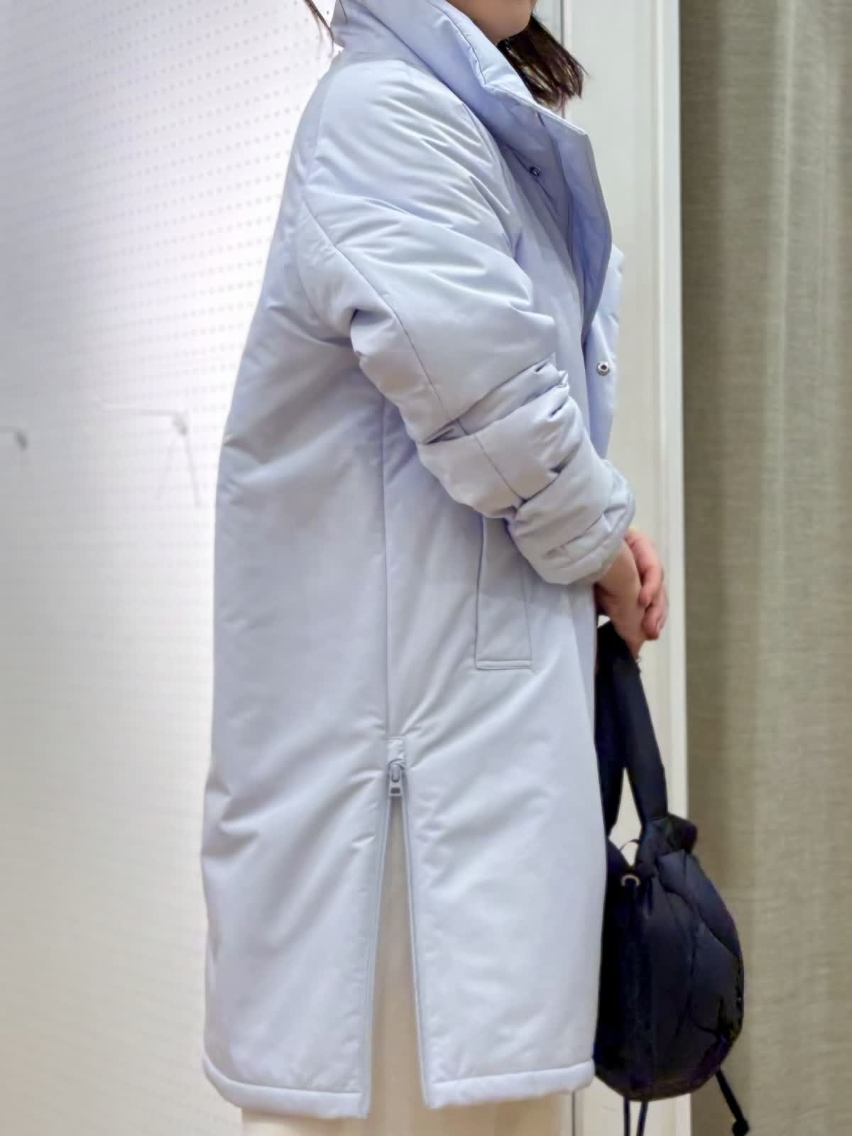 【着用カラー/サイズ】 コート:サックス/フリー ニット:グレー/フリー パンツ:ホワイト/11号 休日のリラックスコーデ。寒空に映えるペールトーンのブルーのコートは中綿で軽くて暖かいです。単調になりがちなシンプルコートも拘りのある細かいディテールでワンランク上の着こなしに。裾サイドのジップは足元を動かしやすくレイヤードが楽しめます。スエット風ニットは厚手過ぎない素材感がアウター下合わせにぴったりです。