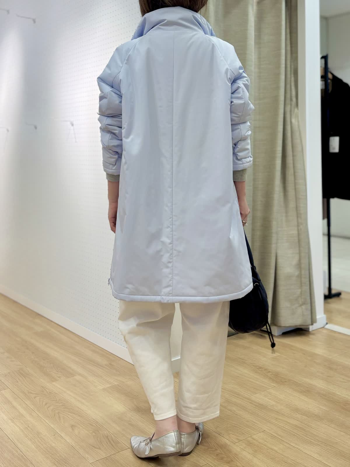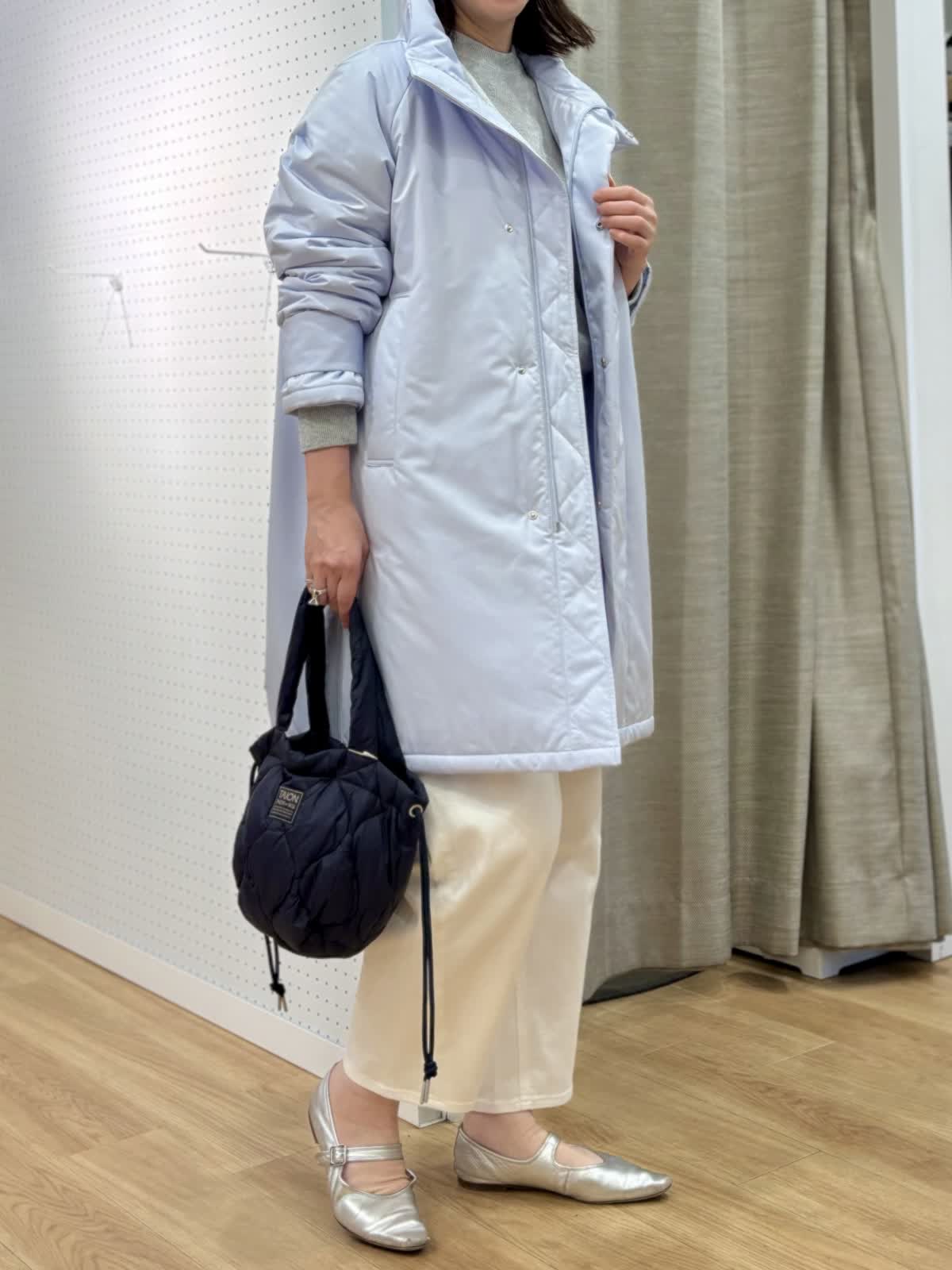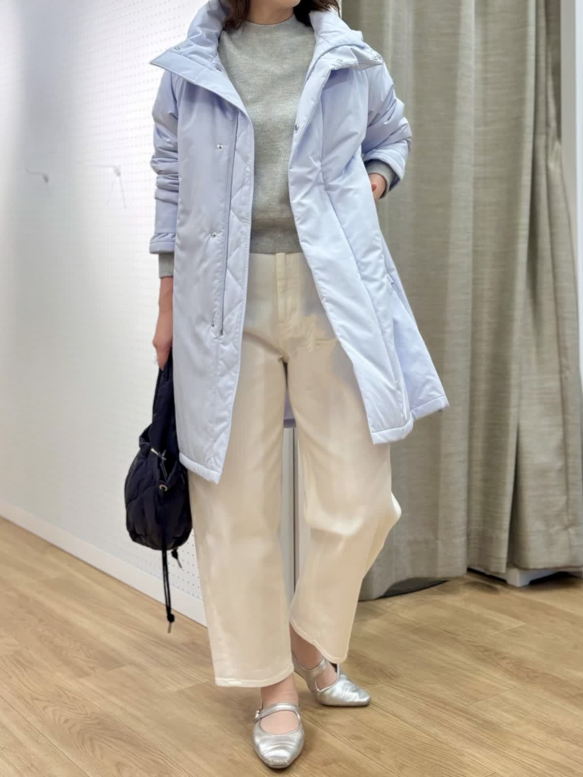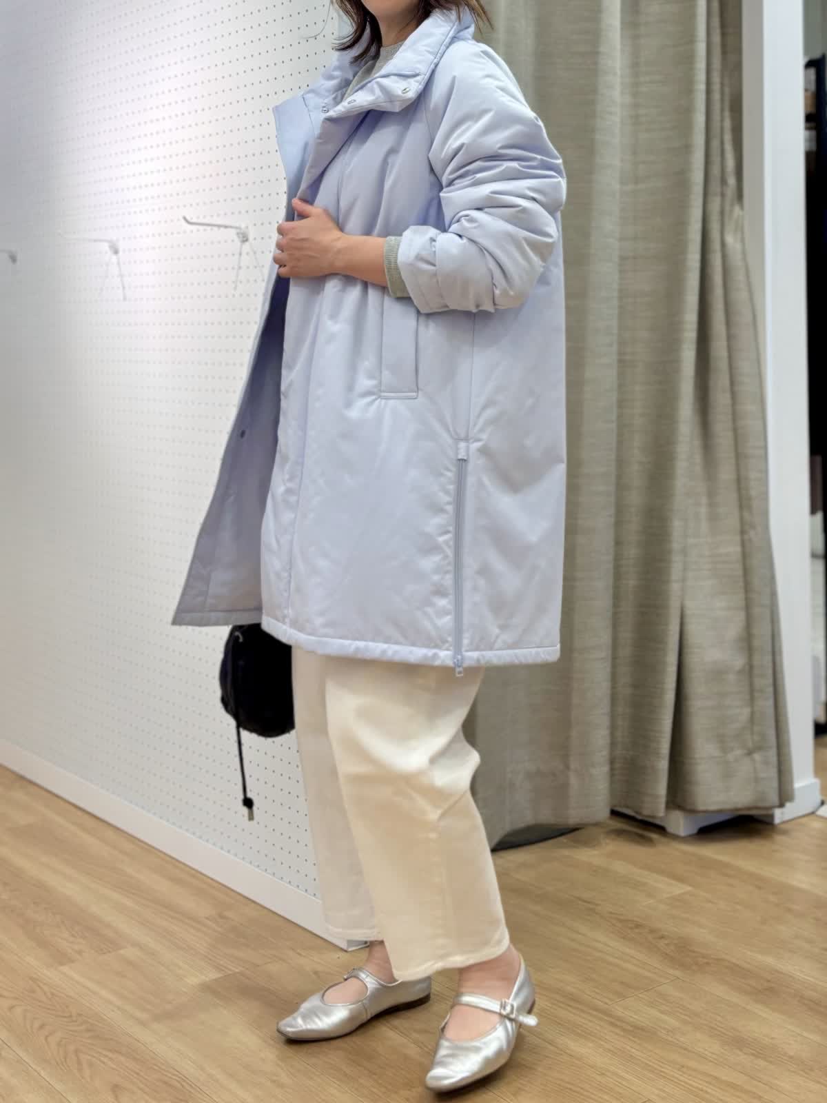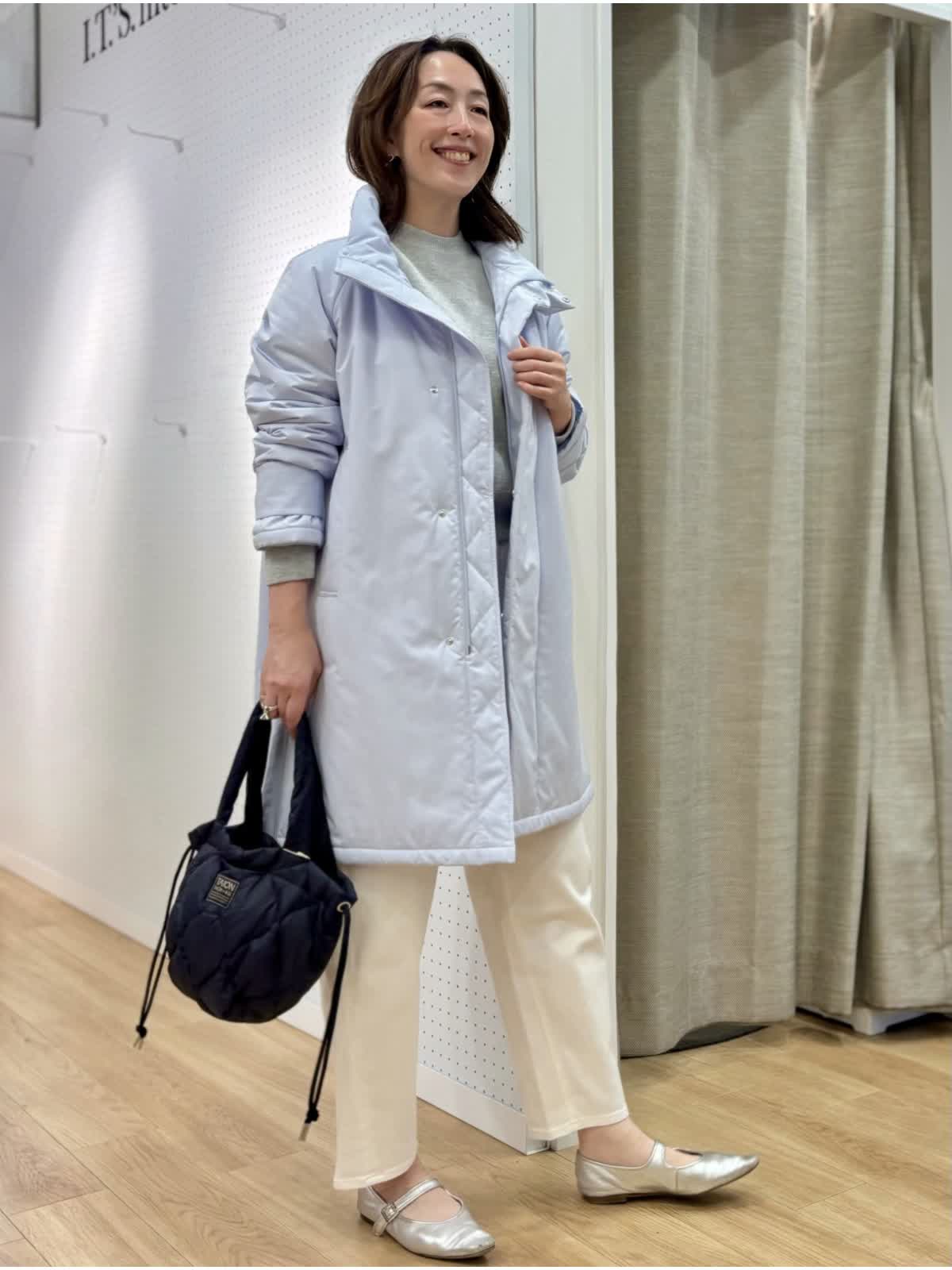 【着用カラー/サイズ】 コート:サックス/フリー ニット:グレー/フリー パンツ:ホワイト/11号 休日のリラックスコーデ。寒空に映えるペールトーンのブルーのコートは中綿で軽くて暖かいです。単調になりがちなシンプルコートも拘りのある細かいディテールでワンランク上の着こなしに。裾サイドのジップは足元を動かしやすくレイヤードが楽しめます。スエット風ニットは厚手過ぎない素材感がアウター下合わせにぴったりです。