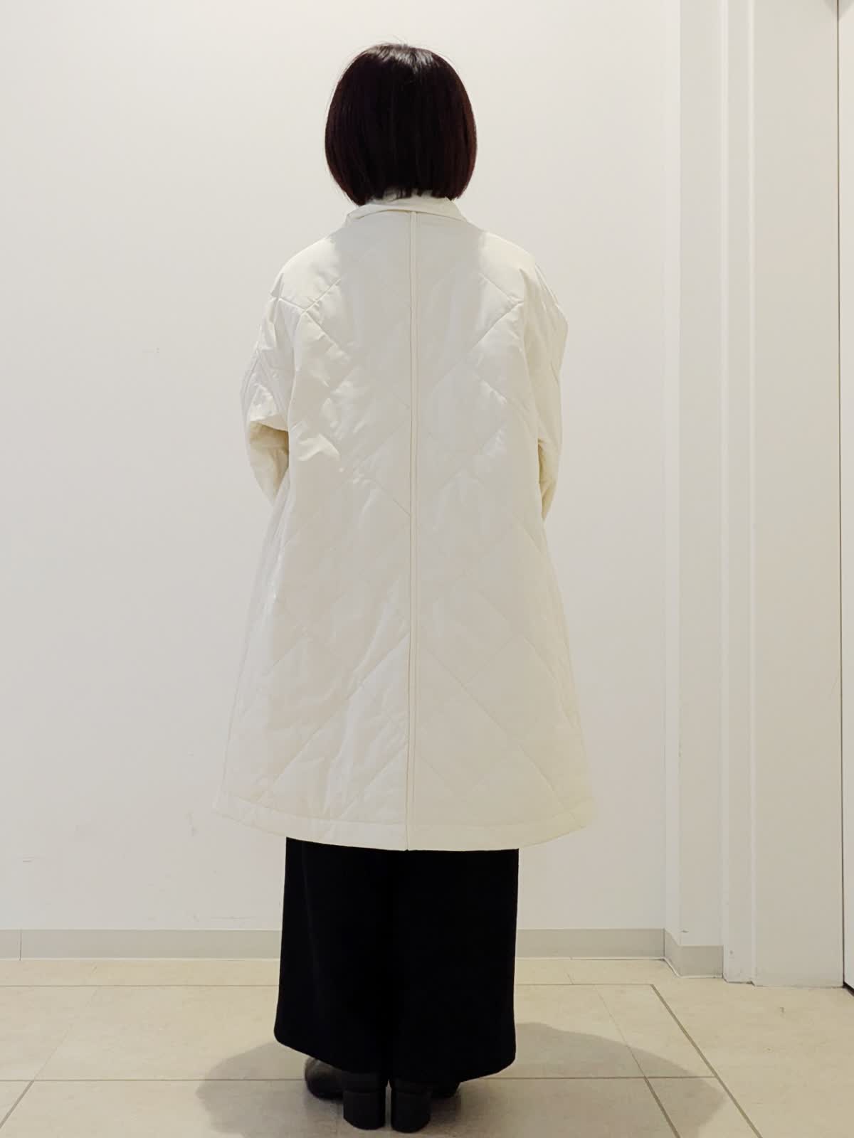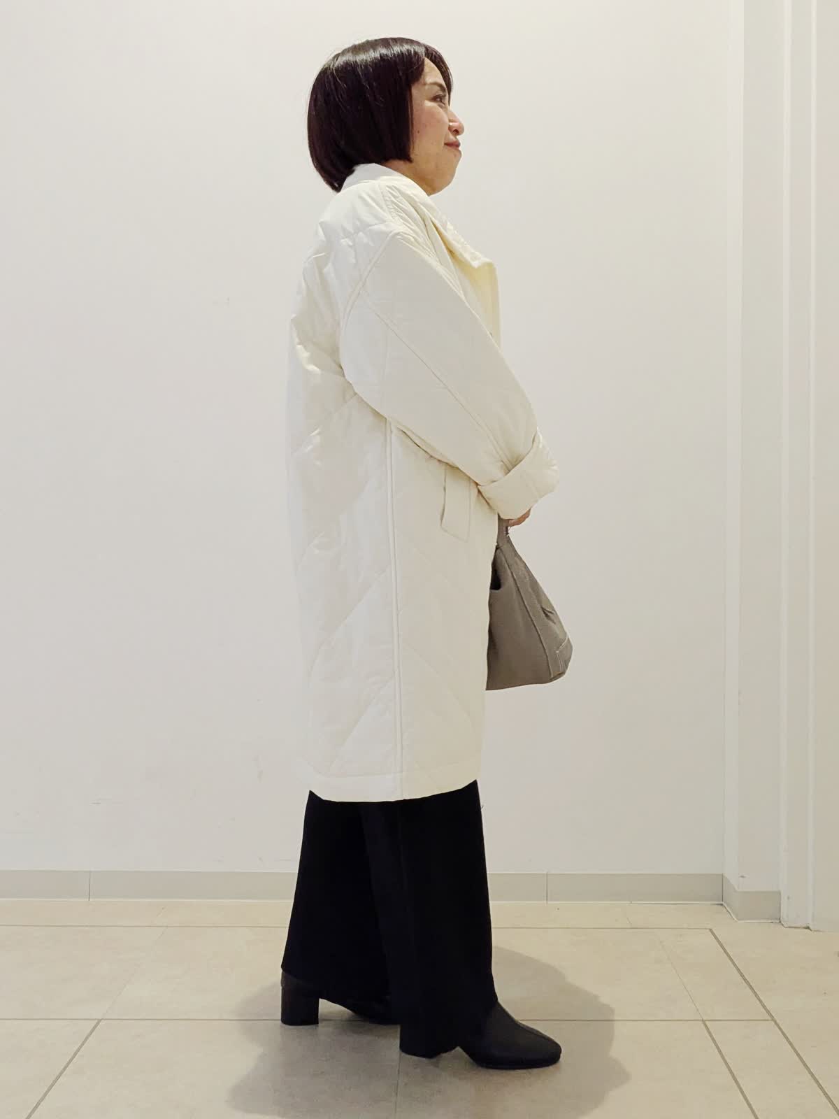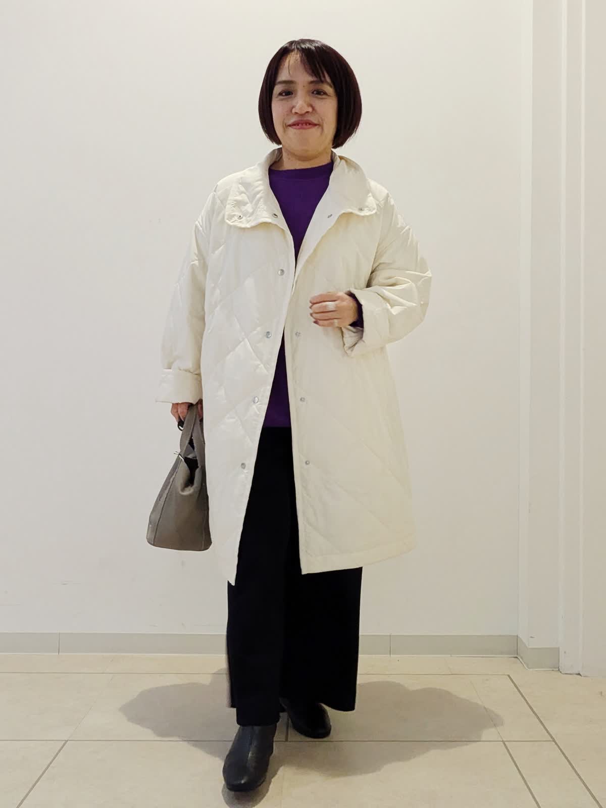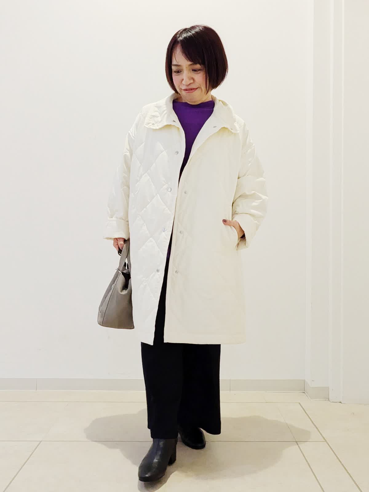 【着用サイズ】コート:フリー ニット:フリー パンツ:7号【着用カラー】コート:オフホワイト ニット:パープル パンツ:ネイビー 冬の通勤コーデです。 コートは中綿キルティング仕様でスタンドカラーがポイント。非常にゆったりしたシルエットで袖口は折り返し可能です。カジュアルになりすぎない雰囲気なのでキレイめにもまとまります。冬の白色はやはりかわいいですよね!