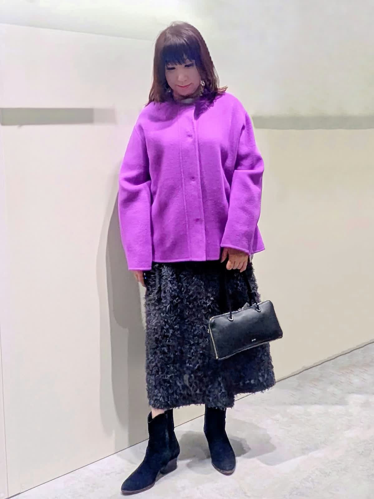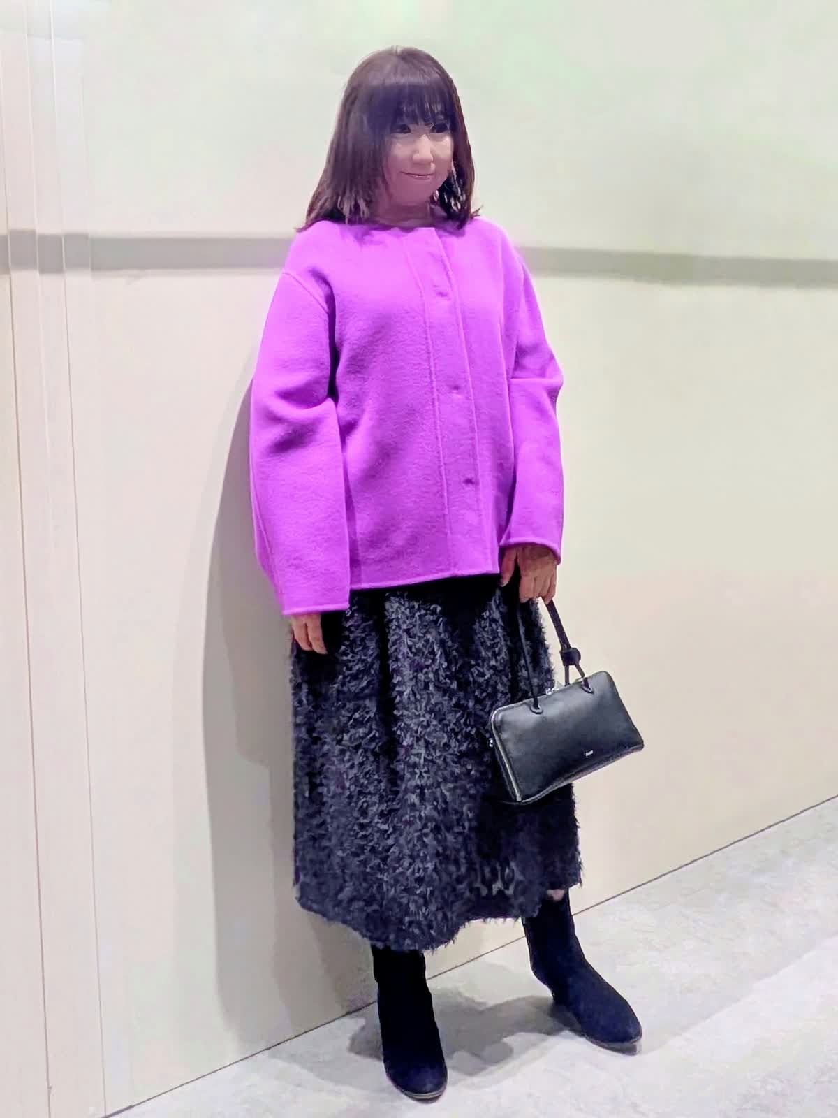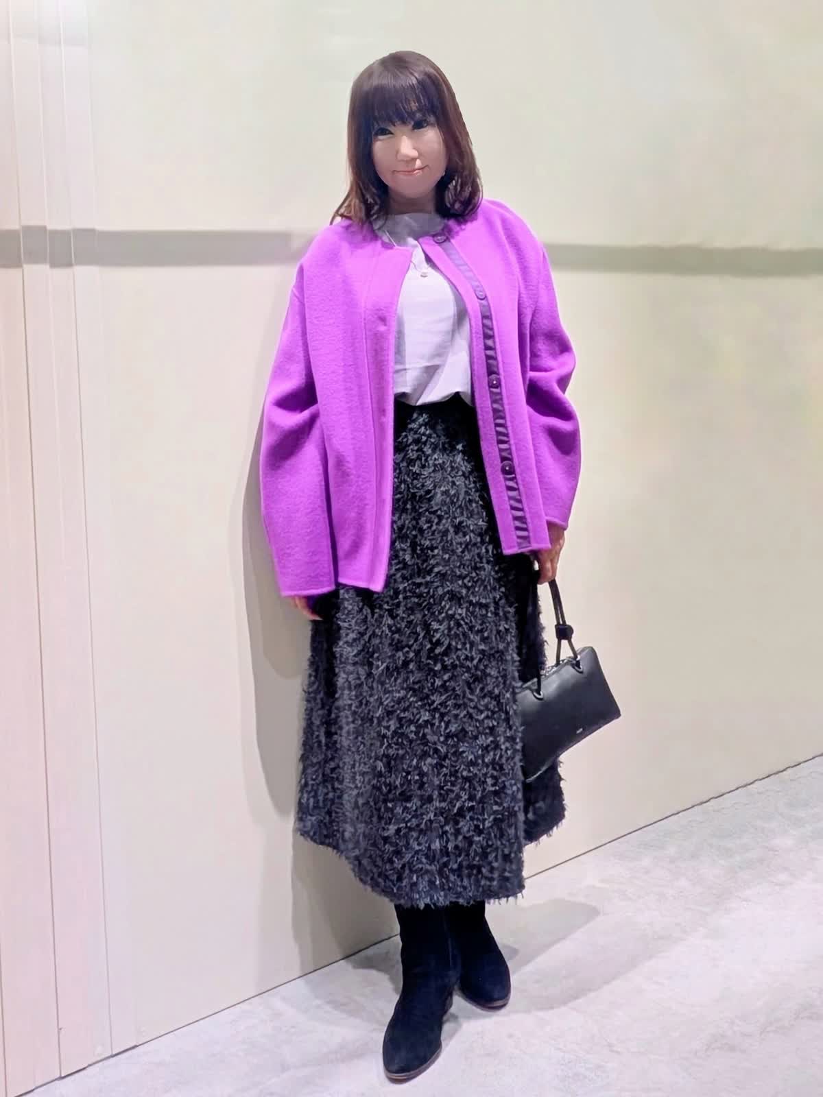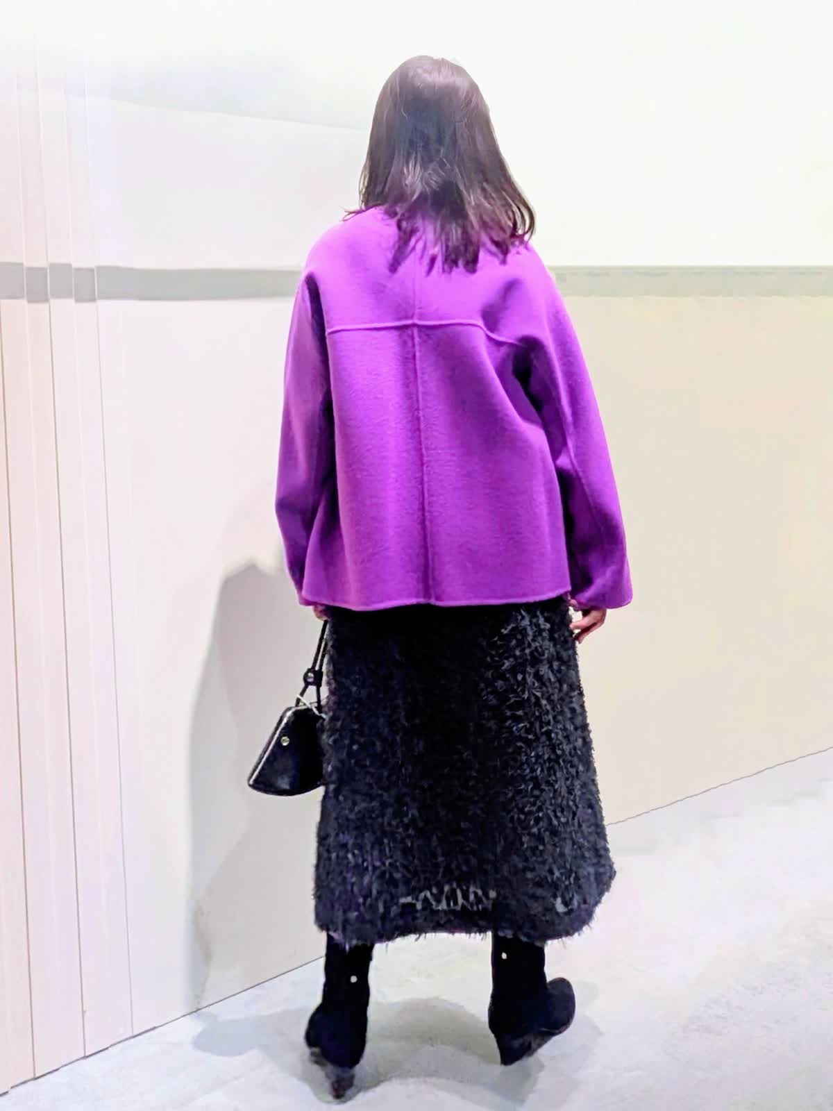 【着用サイズ】プルオーバー:フリー コート、スカート:9号【着用カラー】コート:パープル プルオーバー:ラベンダー スカート:チャコールグレー パープルコーディネート 高級感のあるウールを二重織りにしたリバーコートは、前開き部分のグログランテープが上品なアクセントに…ヒップが隠れる丈感は、ボトムを選ばず幅広いスタイリングに合わせて頂けます。ドルマンスリーブのプルオーバーは、ストレッチ性がありさらっとした清涼感もある素材で着心地も良いです。フリンジ仕様のカットジャガードのスカートは、ややストレートなフレアシルエットで、上品な印象です。ウエスト後ろゴム仕様で、快適なはき心地でサテンテープのファスナーの引手がアクセントに…存在感のあるスタイリングのアクセントになる1枚です。