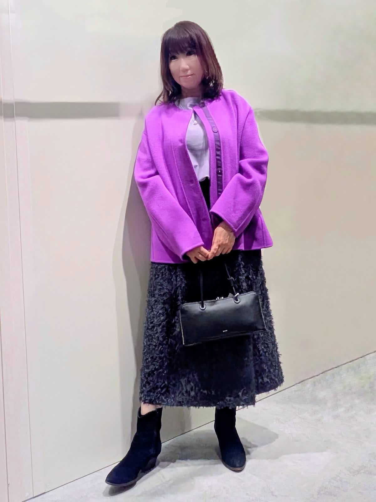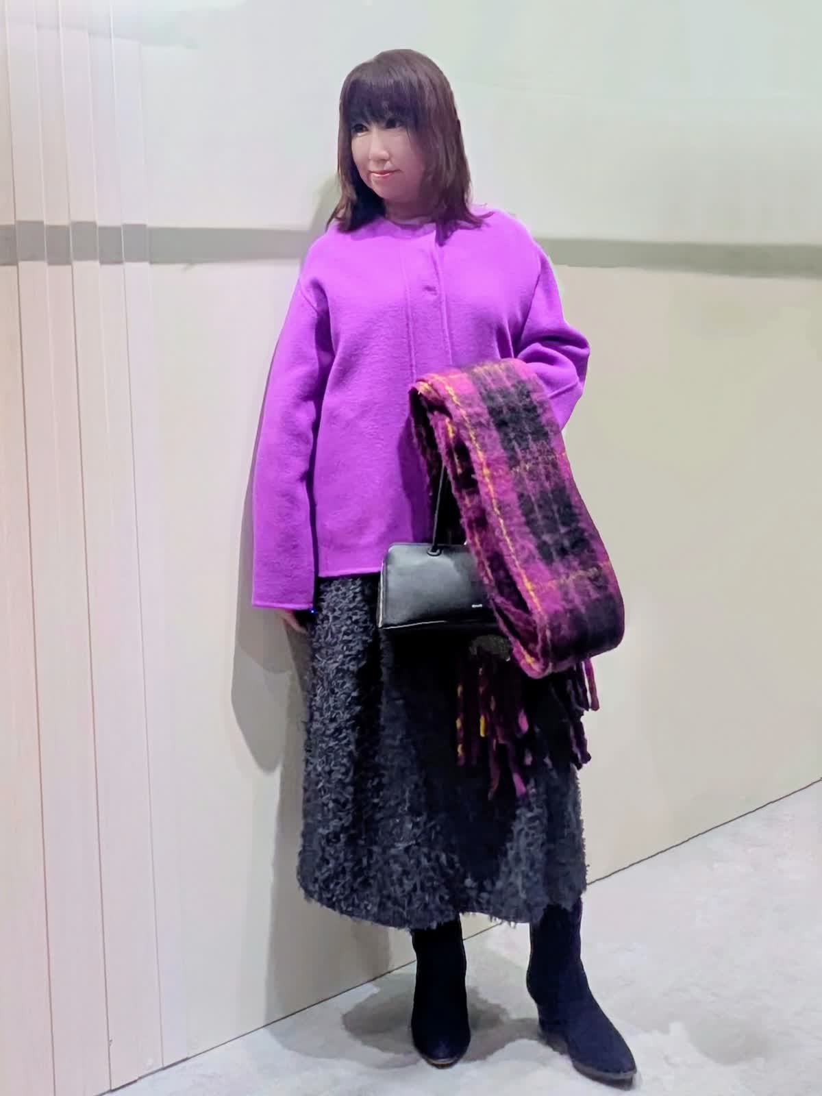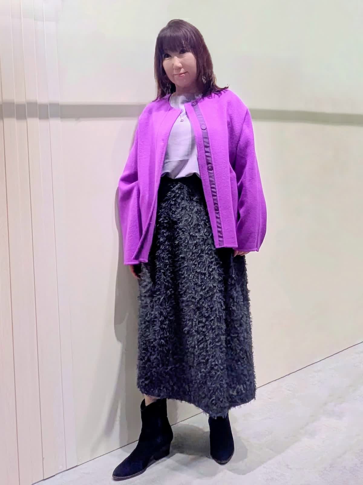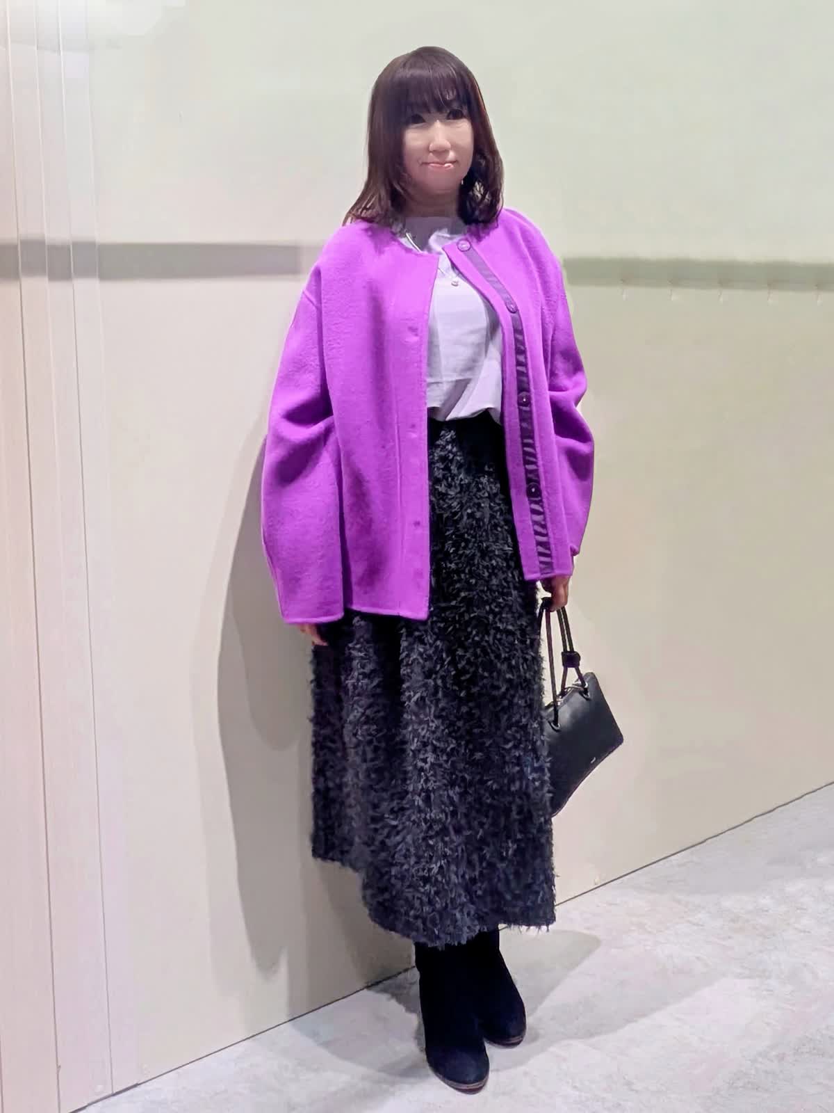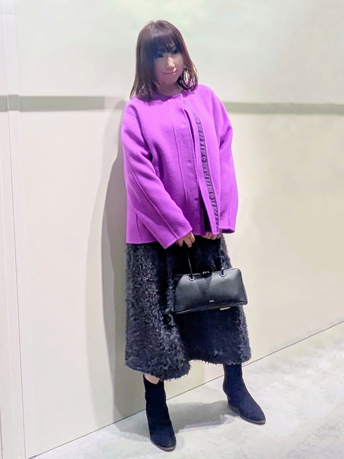 【着用サイズ】プルオーバー:フリー コート、スカート:9号【着用カラー】コート:パープル プルオーバー:ラベンダー スカート:チャコールグレー パープルコーディネート 高級感のあるウールを二重織りにしたリバーコートは、前開き部分のグログランテープが上品なアクセントに…ヒップが隠れる丈感は、ボトムを選ばず幅広いスタイリングに合わせて頂けます。ドルマンスリーブのプルオーバーは、ストレッチ性がありさらっとした清涼感もある素材で着心地も良いです。フリンジ仕様のカットジャガードのスカートは、ややストレートなフレアシルエットで、上品な印象です。ウエスト後ろゴム仕様で、快適なはき心地でサテンテープのファスナーの引手がアクセントに…存在感のあるスタイリングのアクセントになる1枚です。