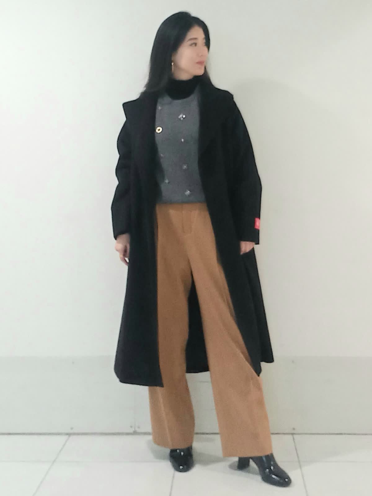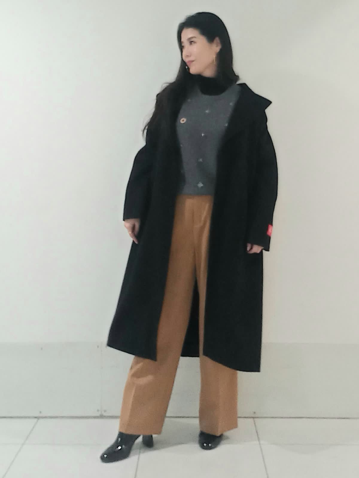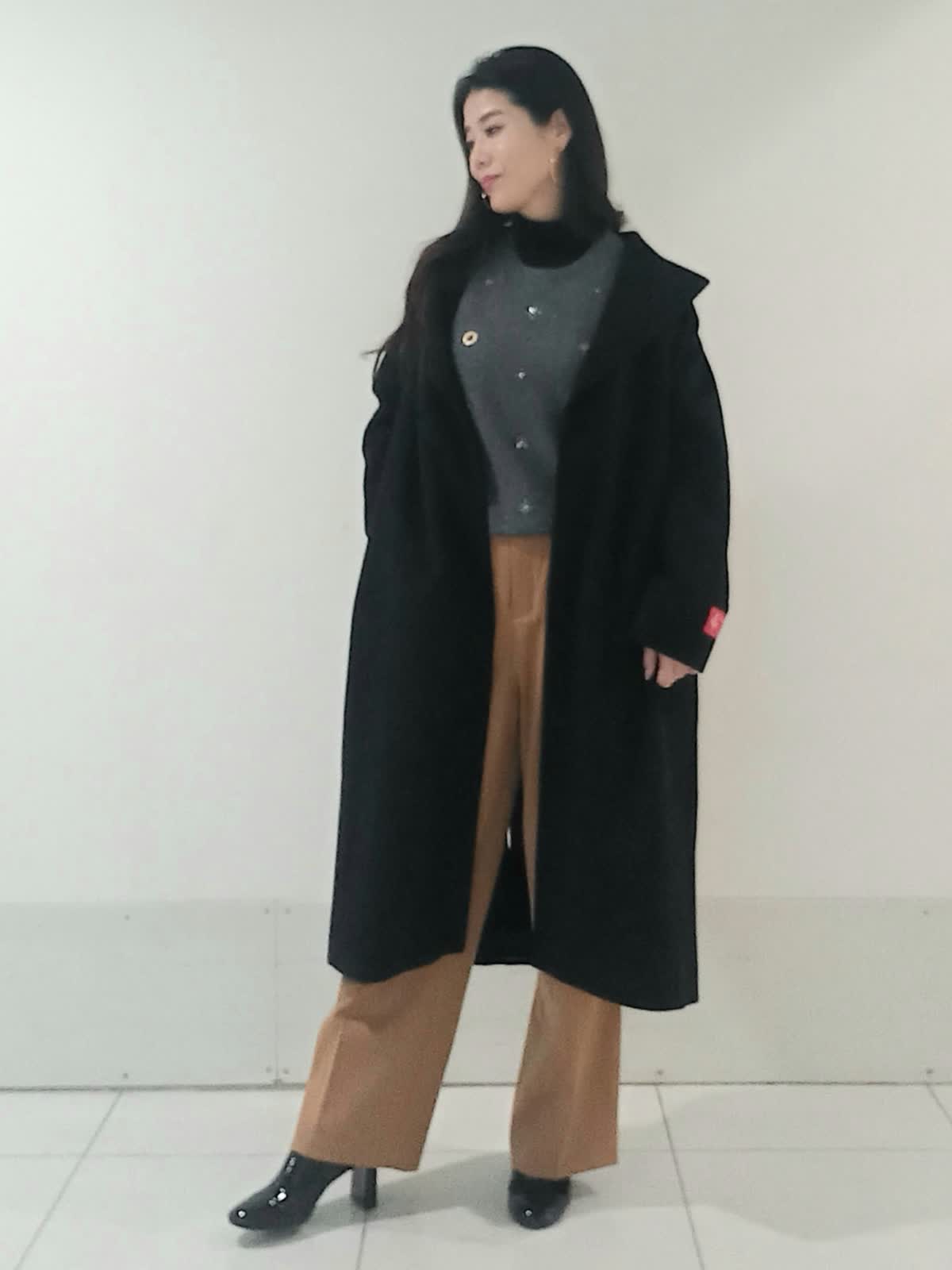 【着用サイズ、カシミアコート9号、ビジュニット9号、インナーカットソー9号、パンツ9号】 上質感のあるカシミアコートはブラックのカラーが重厚感のある上品さを演出します。 キャメルのパンツでバランスの取れた軽やかで洗練された印象のスタイルに。 グレーのニットが中間色として上下のコントラストを優しく繋いでいます。 ドロップショルダーのコートが全体的にリラックス感とビッグシルエットでも抜け感のある女性らしいシルエットに。 お仕事にもおでかけにもオススメのスタイルです。