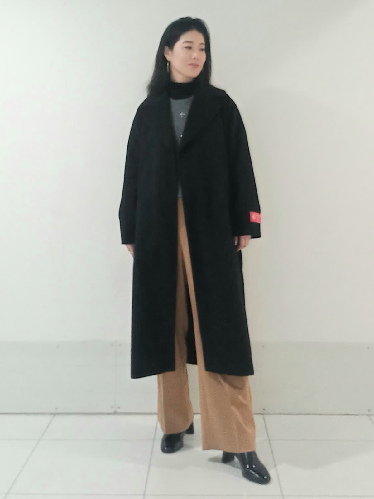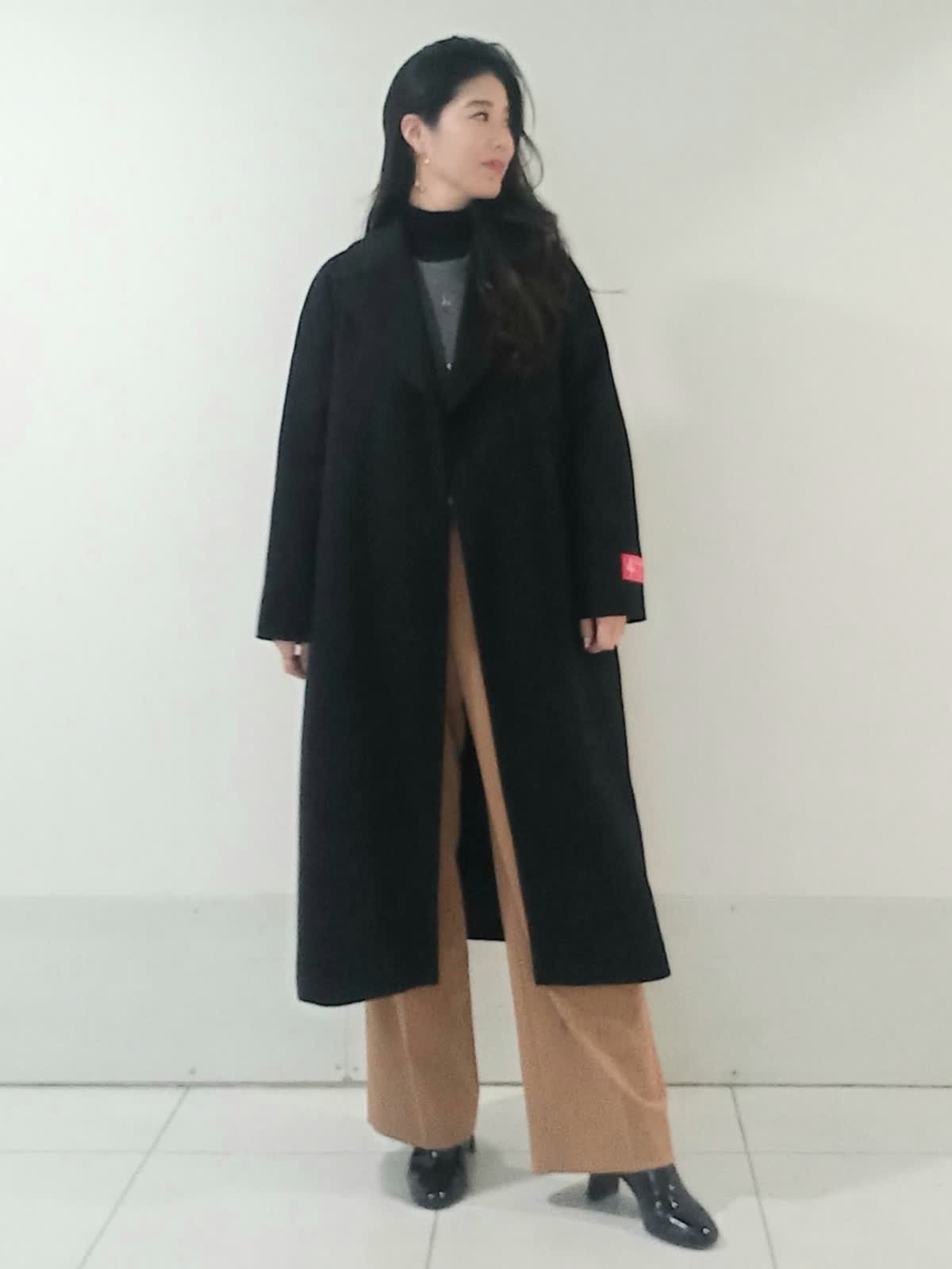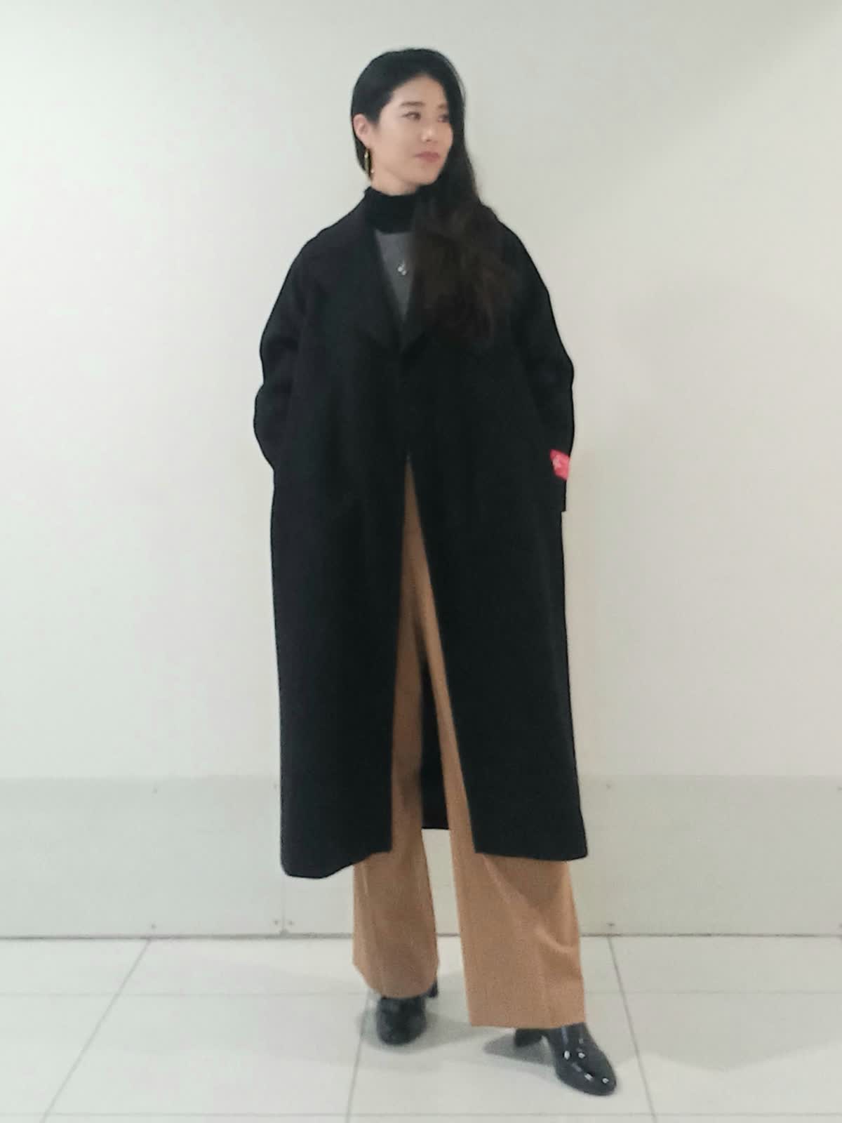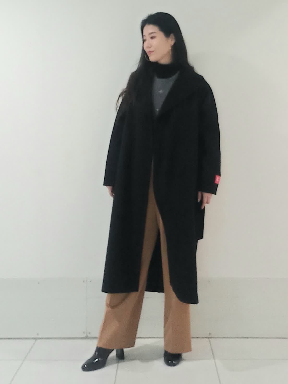 【着用サイズ、カシミアコート9号、ビジュニット9号、インナーカットソー9号、パンツ9号】 上質感のあるカシミアコートはブラックのカラーが重厚感のある上品さを演出します。 キャメルのパンツでバランスの取れた軽やかで洗練された印象のスタイルに。 グレーのニットが中間色として上下のコントラストを優しく繋いでいます。 ドロップショルダーのコートが全体的にリラックス感とビッグシルエットでも抜け感のある女性らしいシルエットに。 お仕事にもおでかけにもオススメのスタイルです。