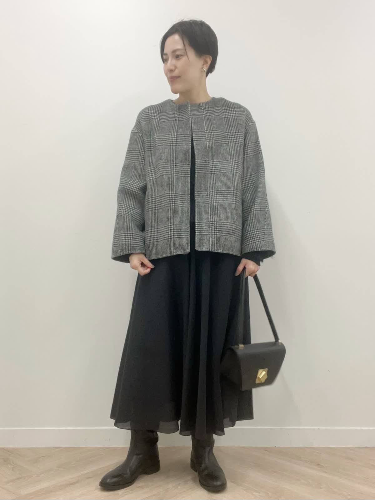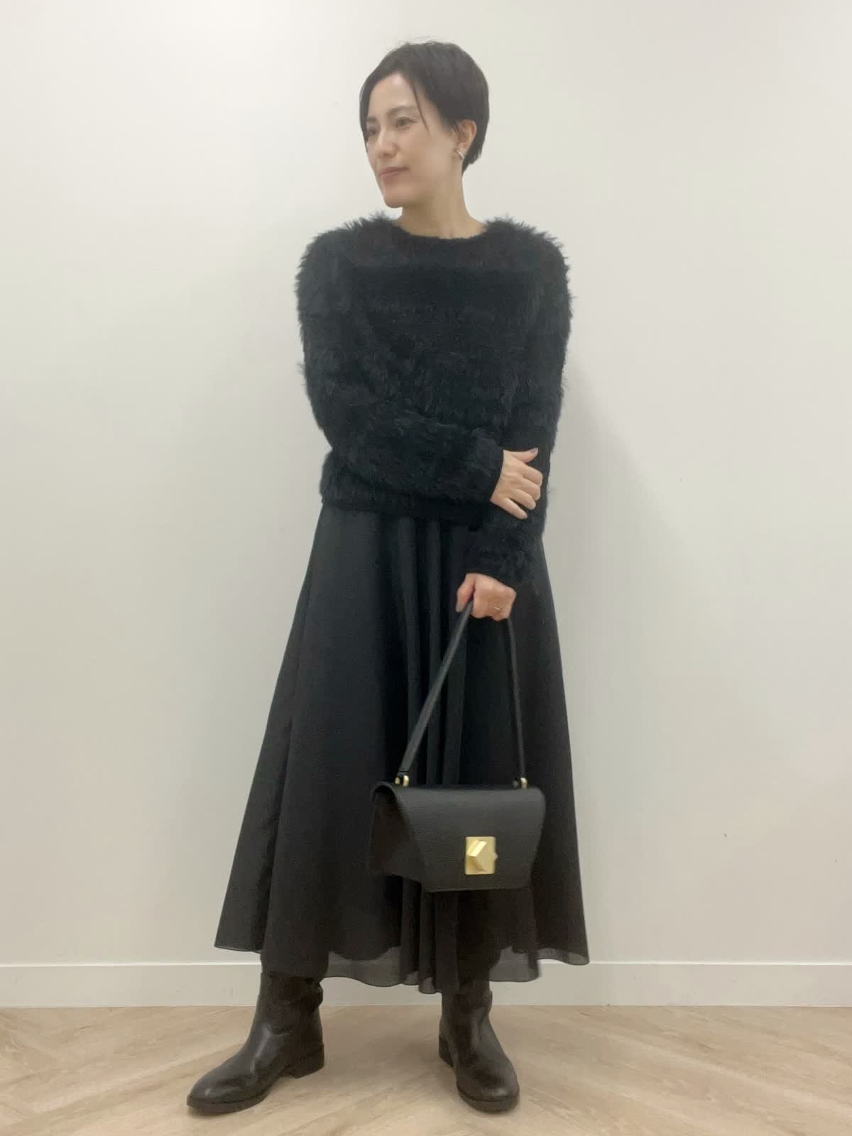 【着用カラー・サイズ】コート:チャコールグレー ニット・スカート:ブラック 全て9号 モノトーンでまとめた年末年始お出かけコーディネート。重さを感じにくい軽さが魅力のコートは1日着ていても肩が凝らず快適にお過ごしいただけます。ふわふわニットと光沢が美しいスカートで素材感の違いで魅せるブラックコーデです。