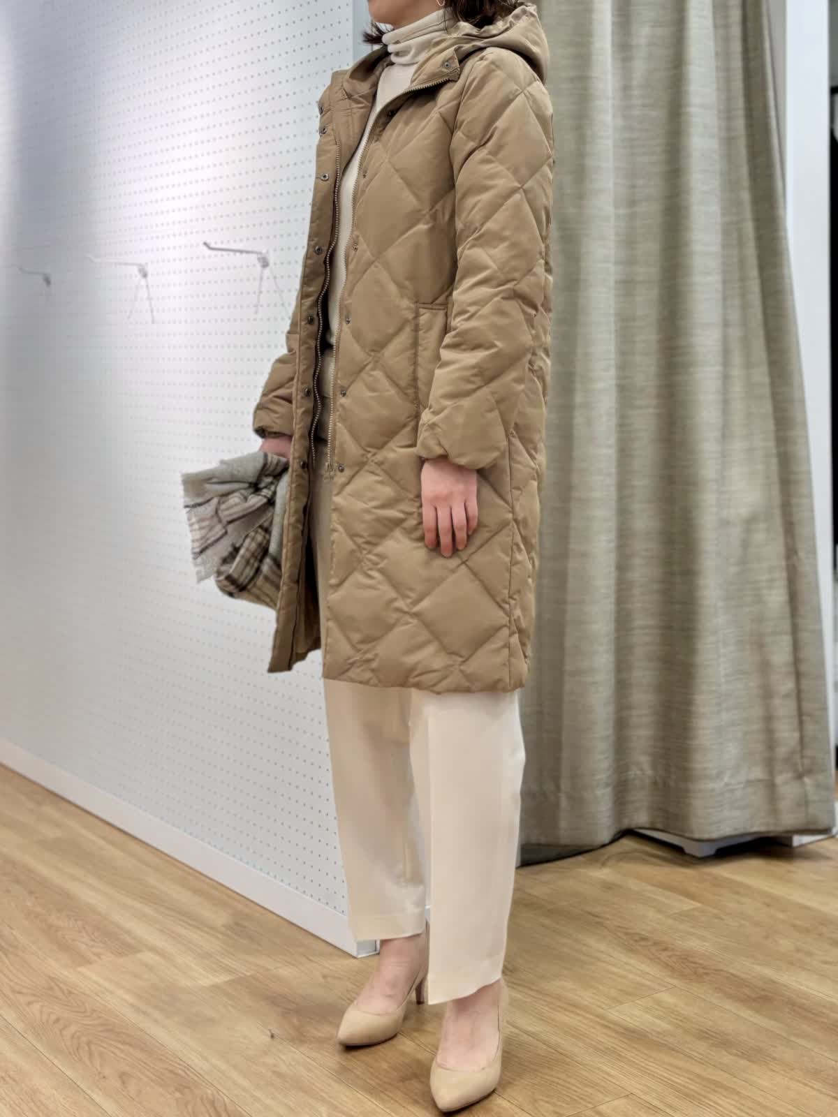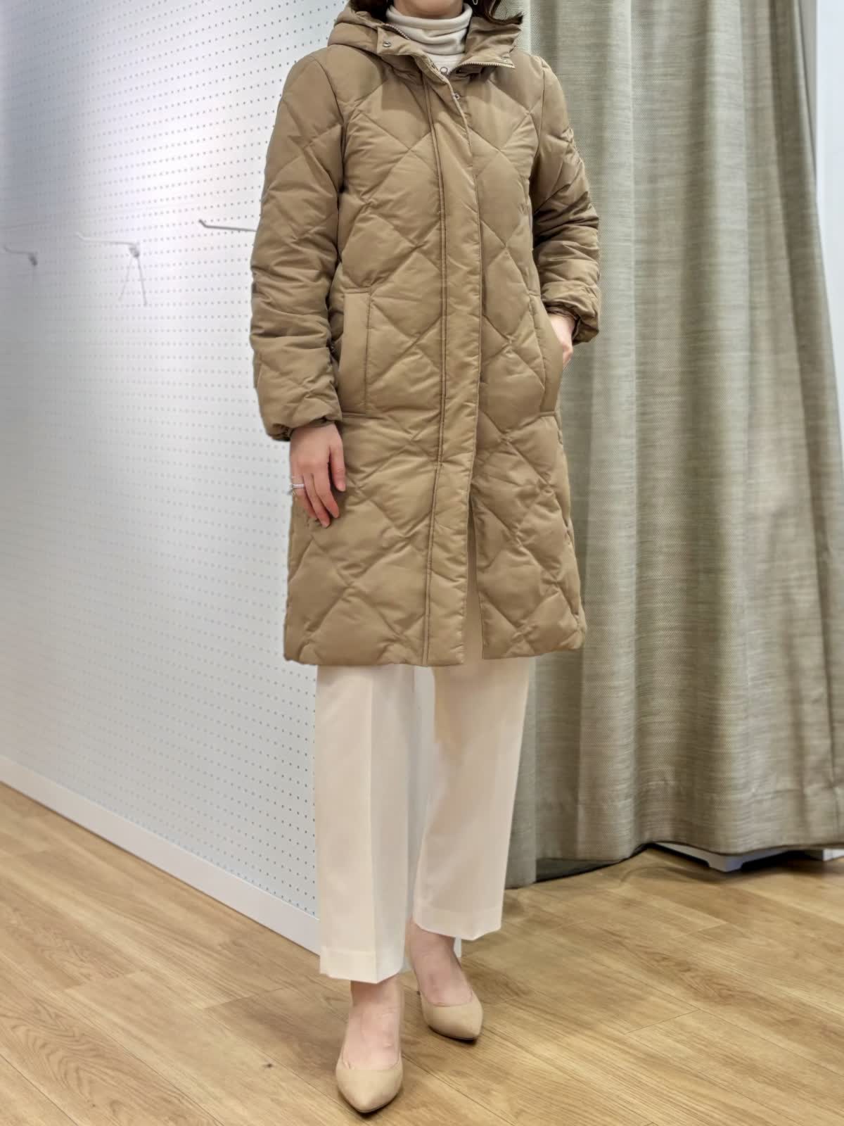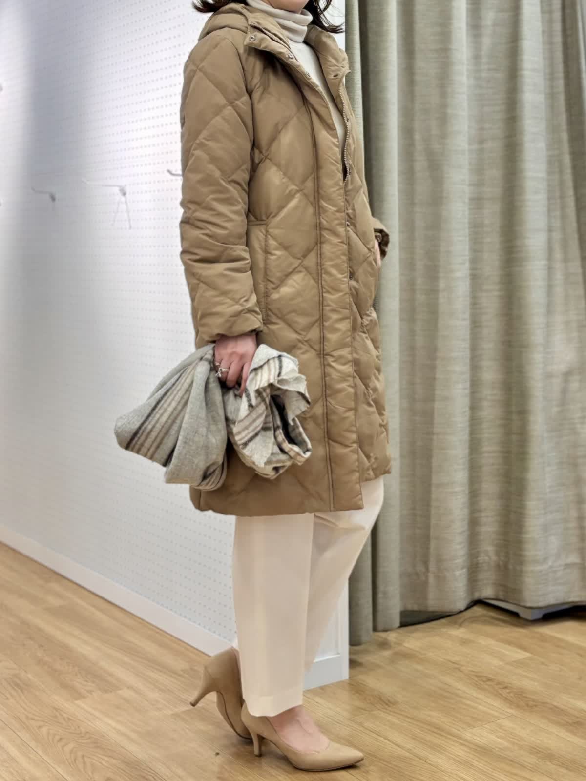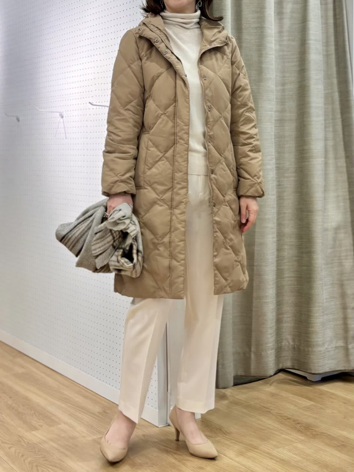 【着用カラー/サイズ】 コート:キャメル/9号 ニット:グレーベージュ/9号 パンツ:オフホワイト/9号 冬のお出掛けコーデ。ダウン95%入ったダウンは着膨れ感無くスッキリとしたシルエットがカジュアル過ぎずにまとまります。表生地は太陽の光を熱に変える新素材なので全方位から暖かさを感じれます。Wジップで足捌きもしやすく、袖口にはゴム入りで細かいディテールもポイントです。ダウンがあればインナーはキュプラ混のニットがムレ感なく過ごせて快適な着心地です。