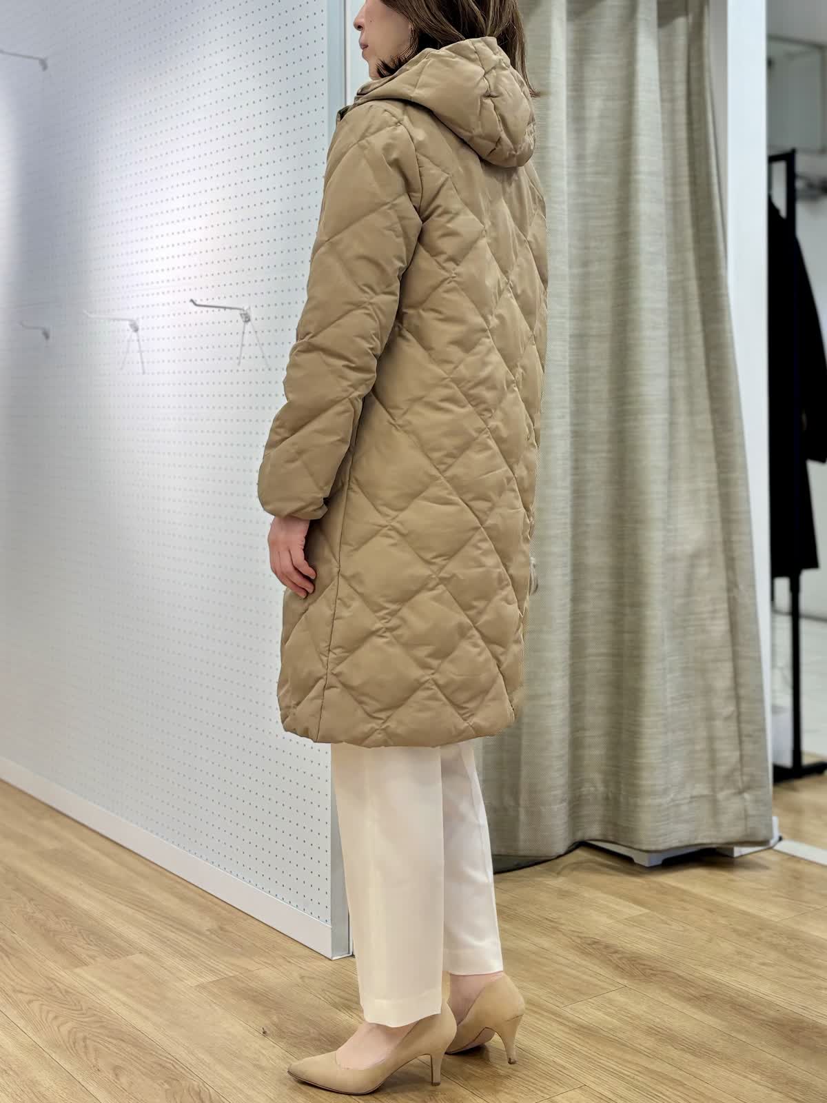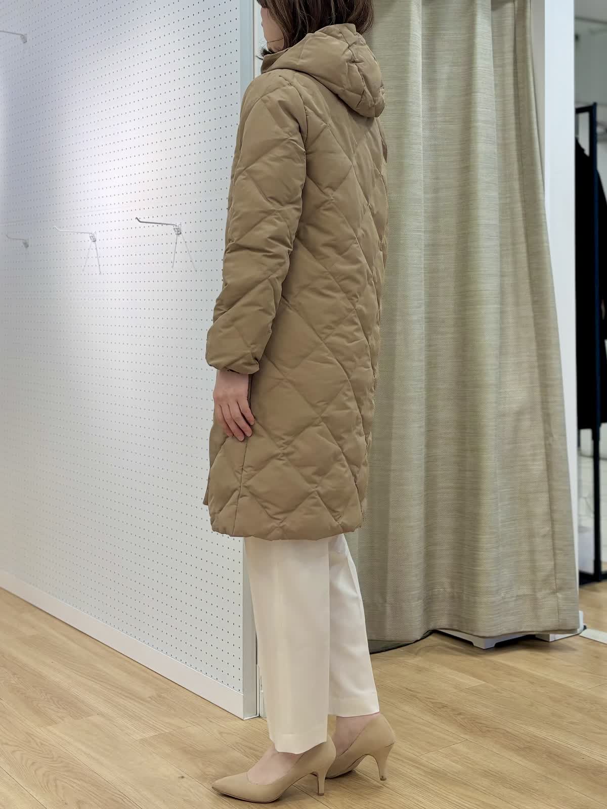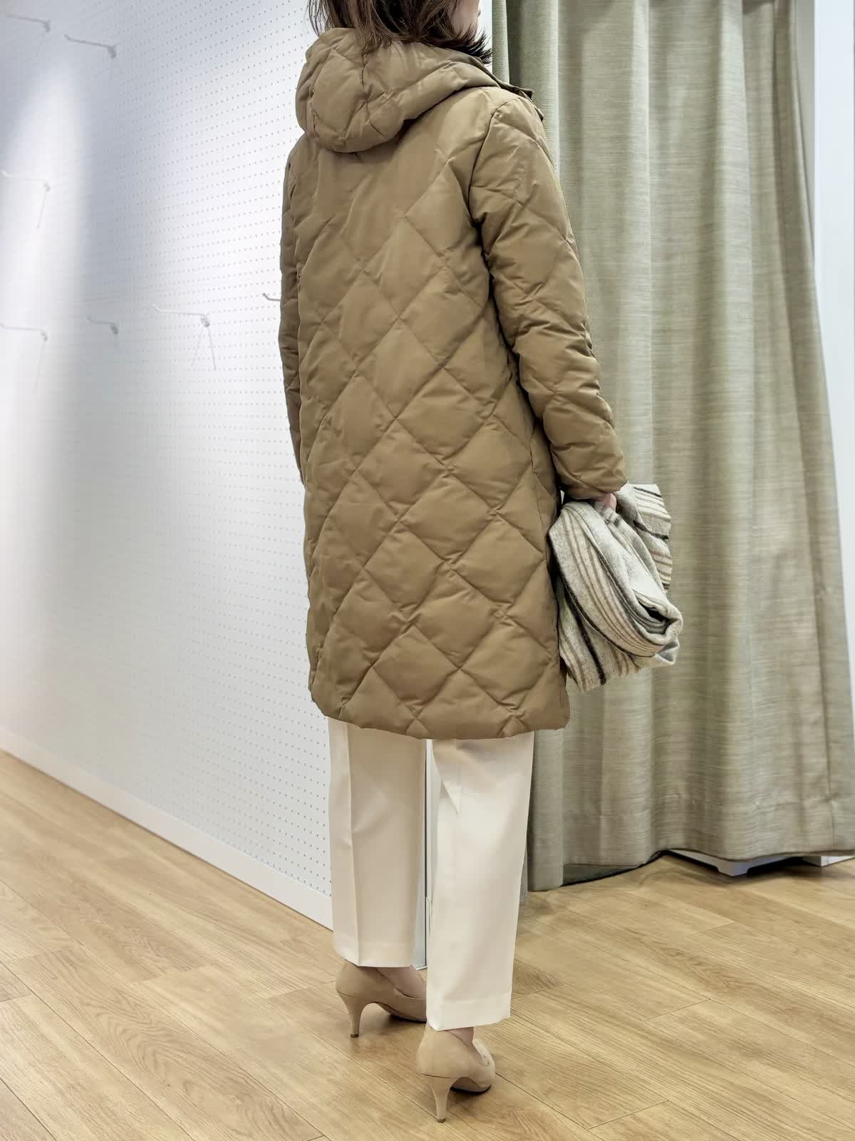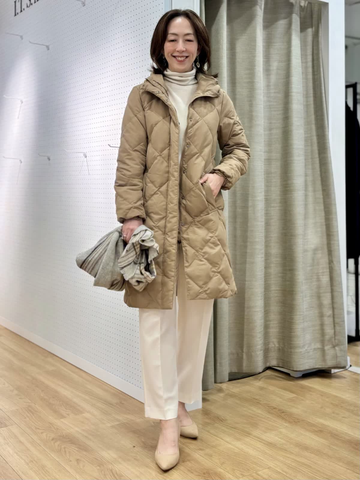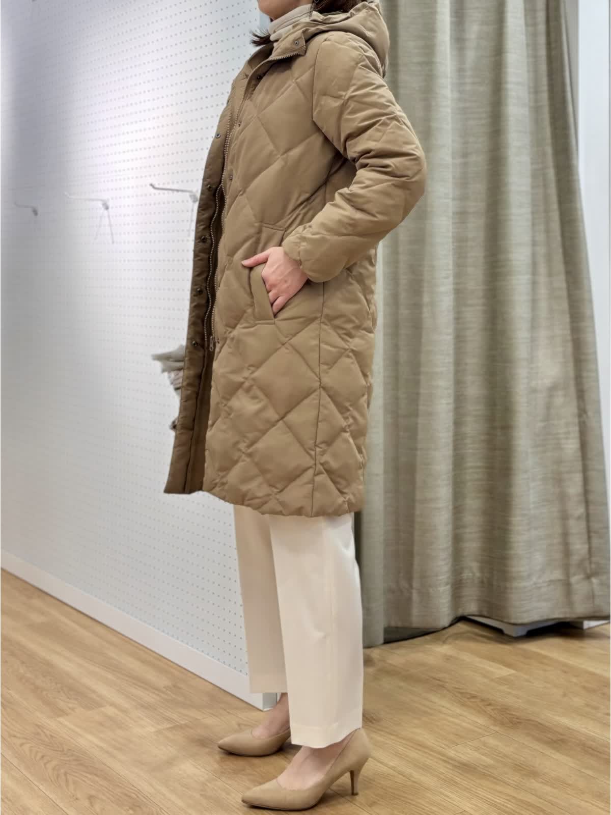 【着用カラー/サイズ】 コート:キャメル/9号 ニット:グレーベージュ/9号 パンツ:オフホワイト/9号 冬のお出掛けコーデ。ダウン95%入ったダウンは着膨れ感無くスッキリとしたシルエットがカジュアル過ぎずにまとまります。表生地は太陽の光を熱に変える新素材なので全方位から暖かさを感じれます。Wジップで足捌きもしやすく、袖口にはゴム入りで細かいディテールもポイントです。ダウンがあればインナーはキュプラ混のニットがムレ感なく過ごせて快適な着心地です。