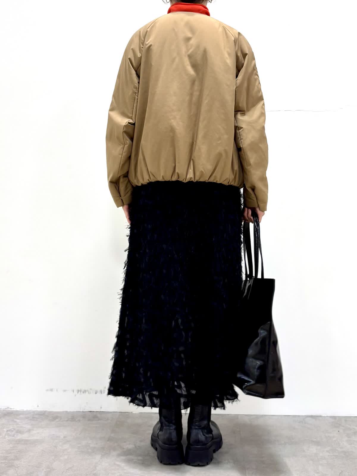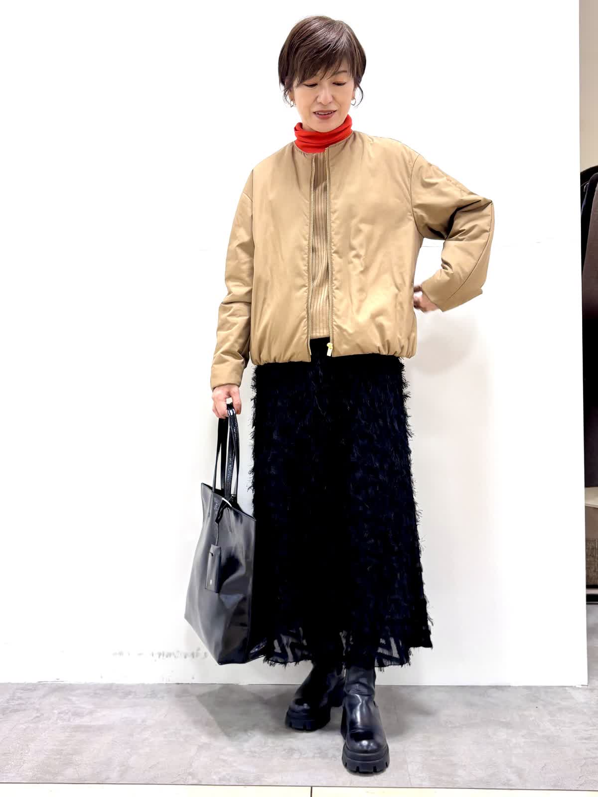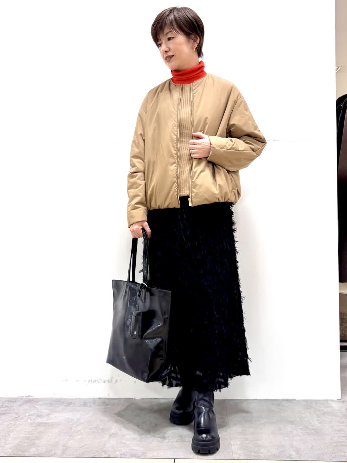 [着用サイズ]アウター:9号ニット:9号 スカート:7号 [着用カラー]アウター:キャメル ニット:モカチャ スカート:ブラック コンパクトで裾にギャザーの入ったバルーンシルエットのブルゾンです。リモンタ社の多機能素材で防風性もあり温かいです。ジャガードのスカートは一枚で着映えする華やかなデザインです。