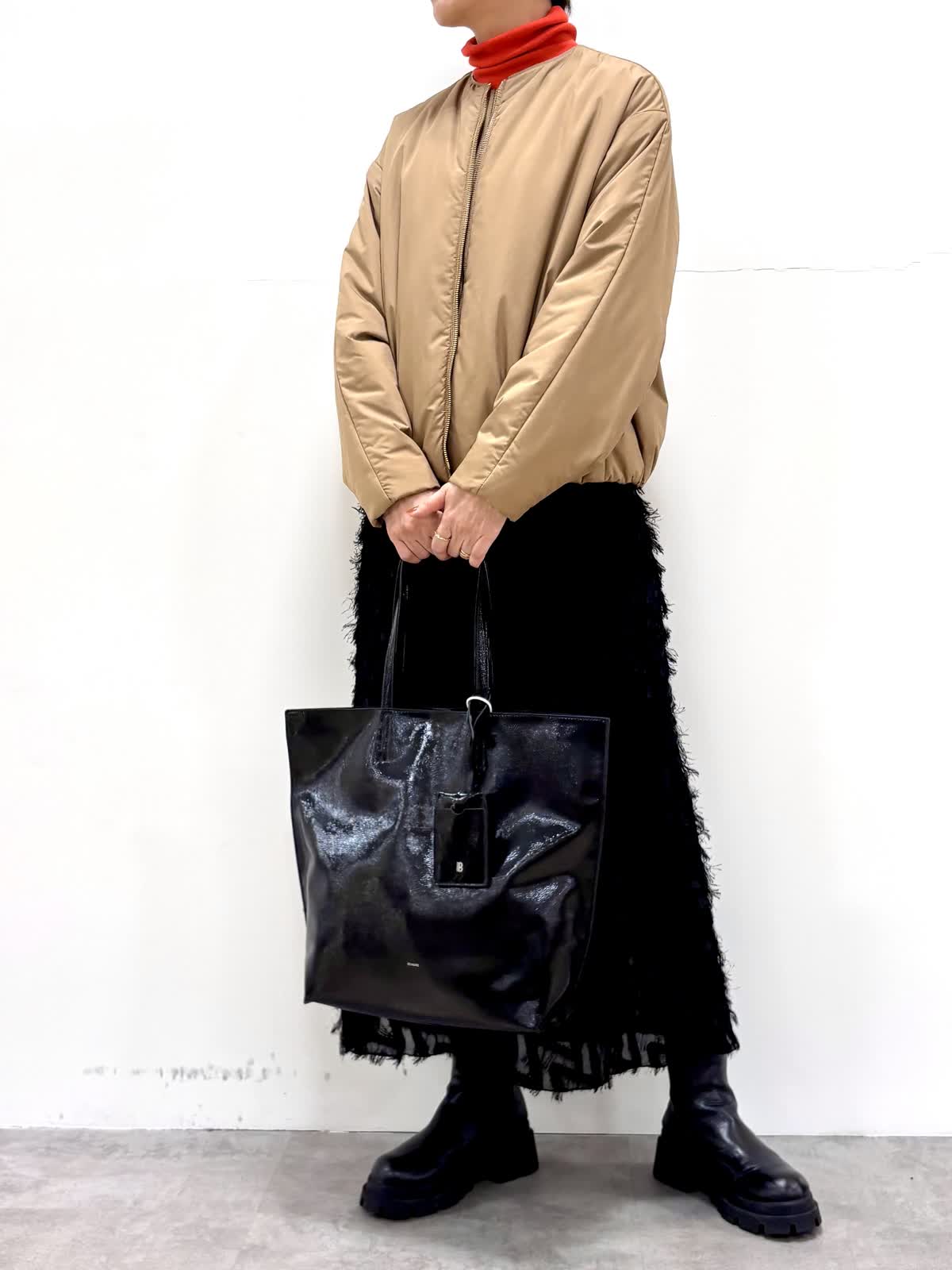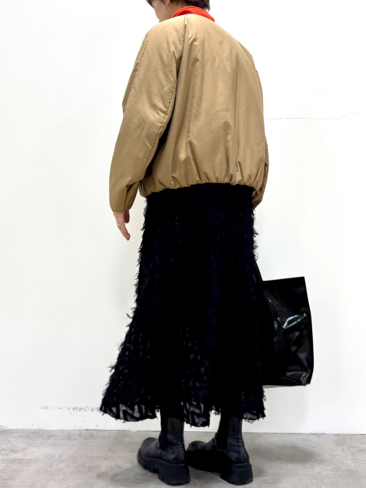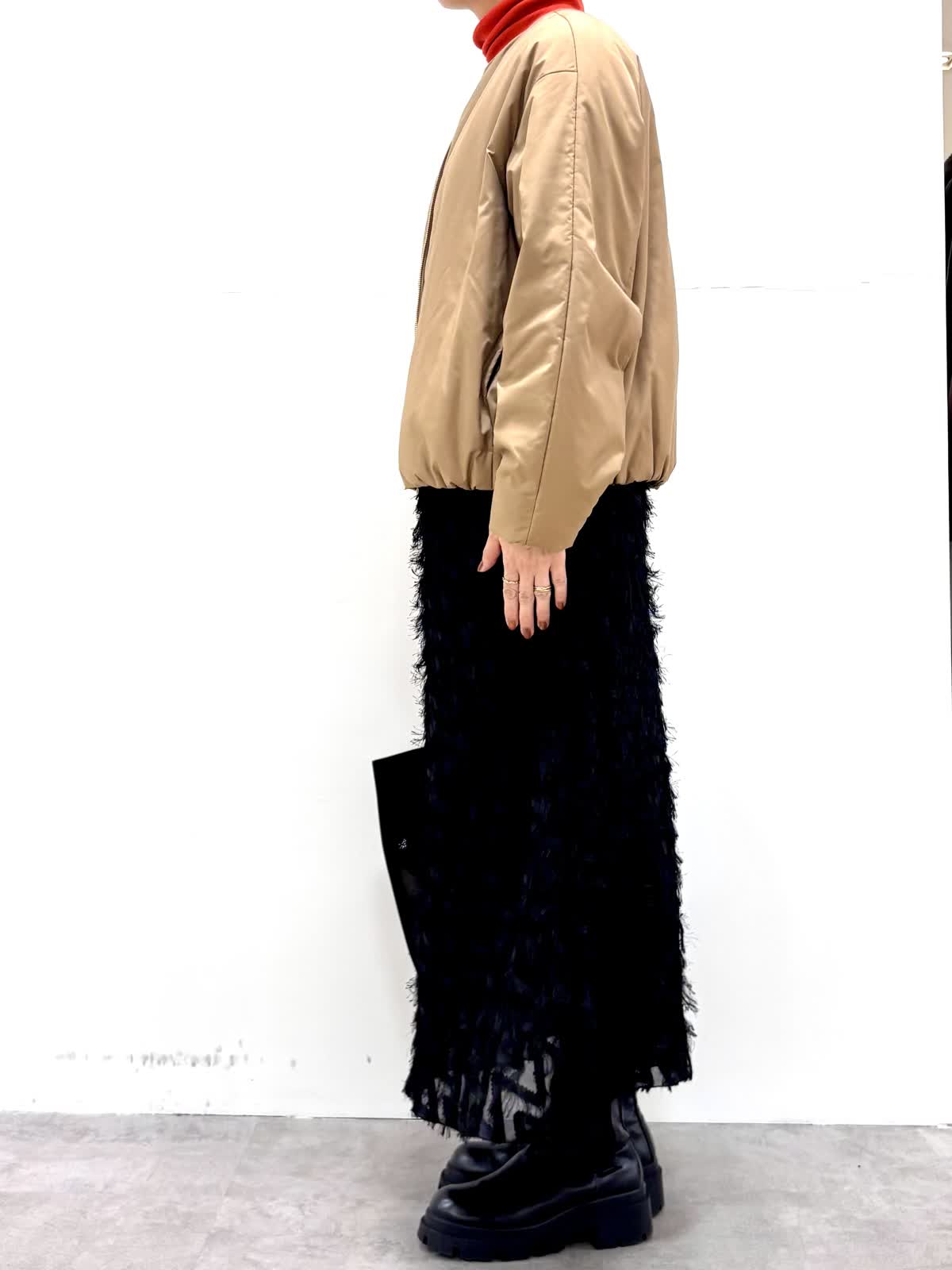 [着用サイズ]アウター:9号ニット:9号 スカート:7号 [着用カラー]アウター:キャメル ニット:モカチャ スカート:ブラック コンパクトで裾にギャザーの入ったバルーンシルエットのブルゾンです。リモンタ社の多機能素材で防風性もあり温かいです。ジャガードのスカートは一枚で着映えする華やかなデザインです。