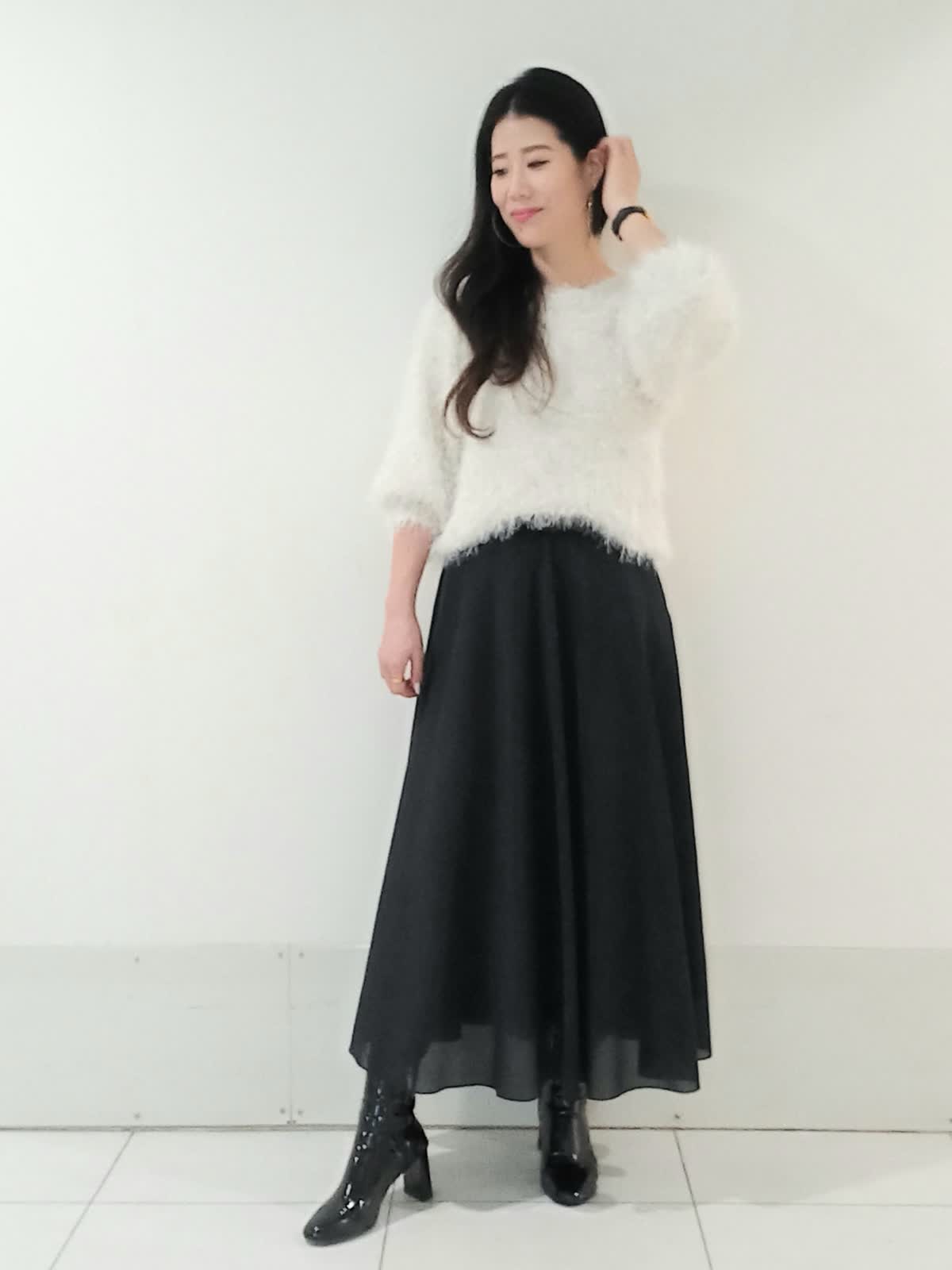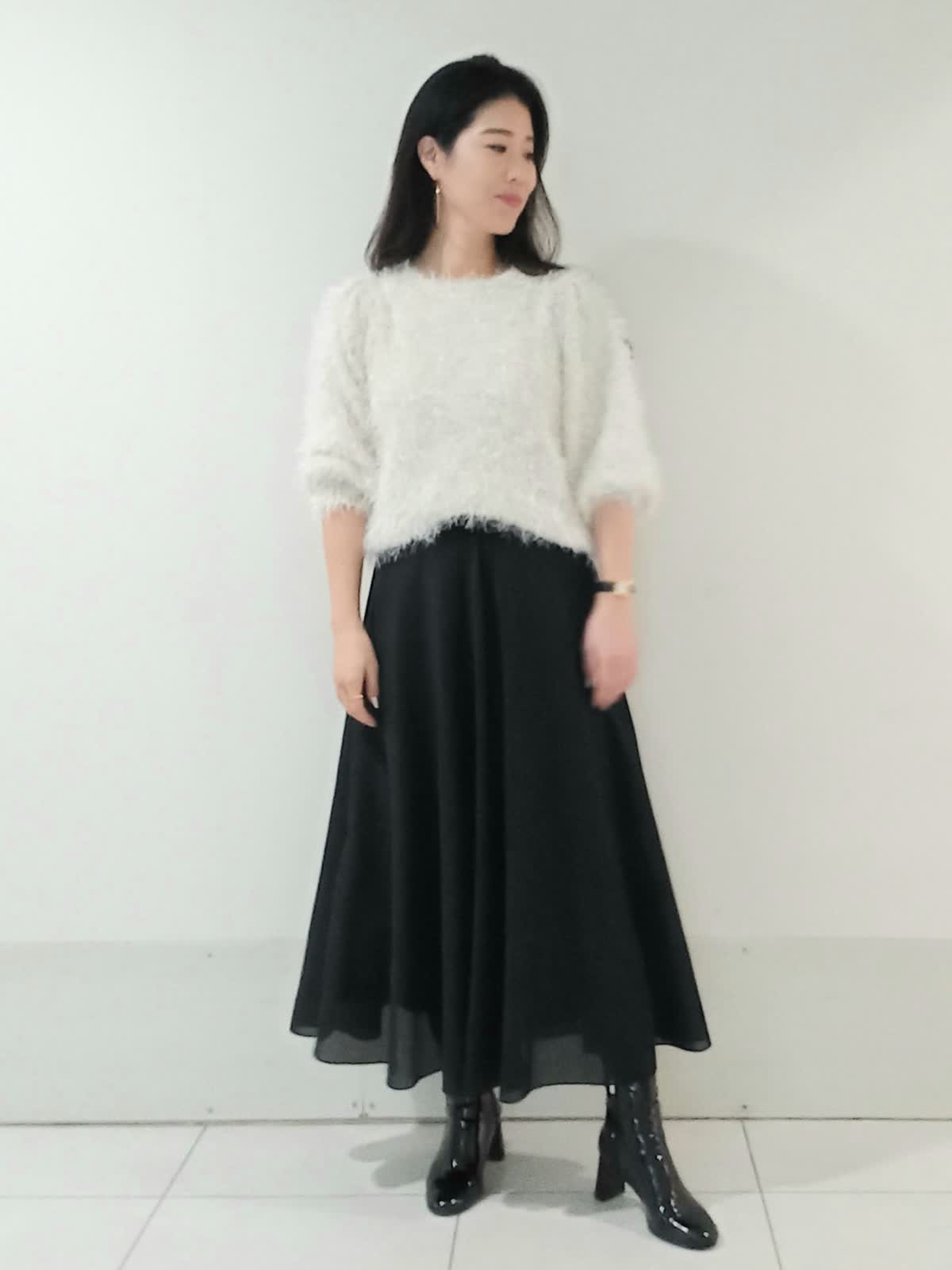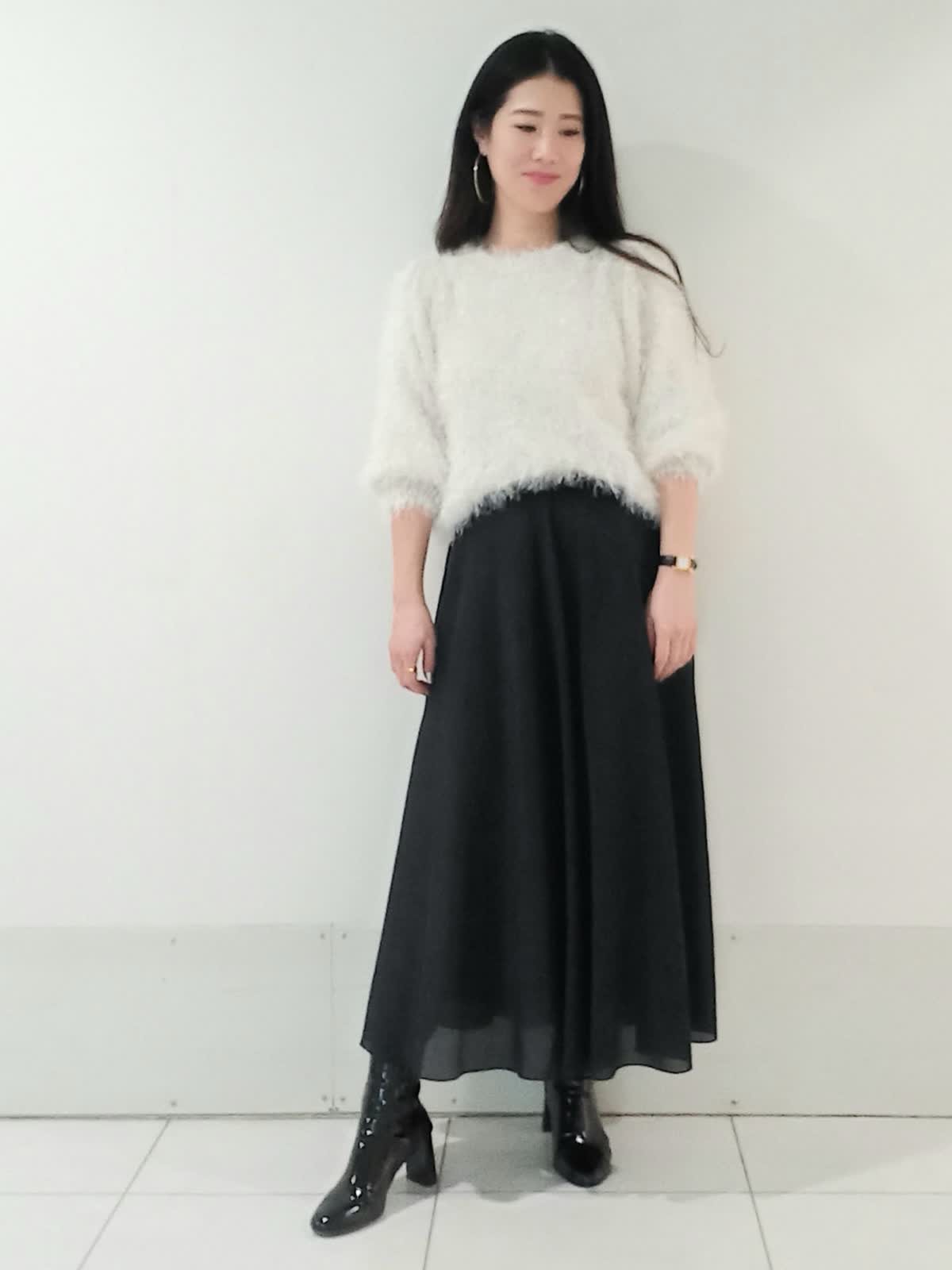 【着用サイズニット9号、スカート9号】 ふわふわとした素材が可愛らしさや柔らかな印象を与えてくれるシャギーニット。 スカートはロング丈でAラインのシルエットがエレガントです。 シンプルなモノトーンでも単調にならず洗練された印象に。 トップスをコンパクトにまとめてハイウエストのスカートとヒールのあるブーツで合わせることでスタイルアップ効果も期待できます。 甘すぎず大人っぽい落ち着きと華やかさを兼ね備えた、冬にぴったりのデートやお出かけにおすすめのコーディネートです!