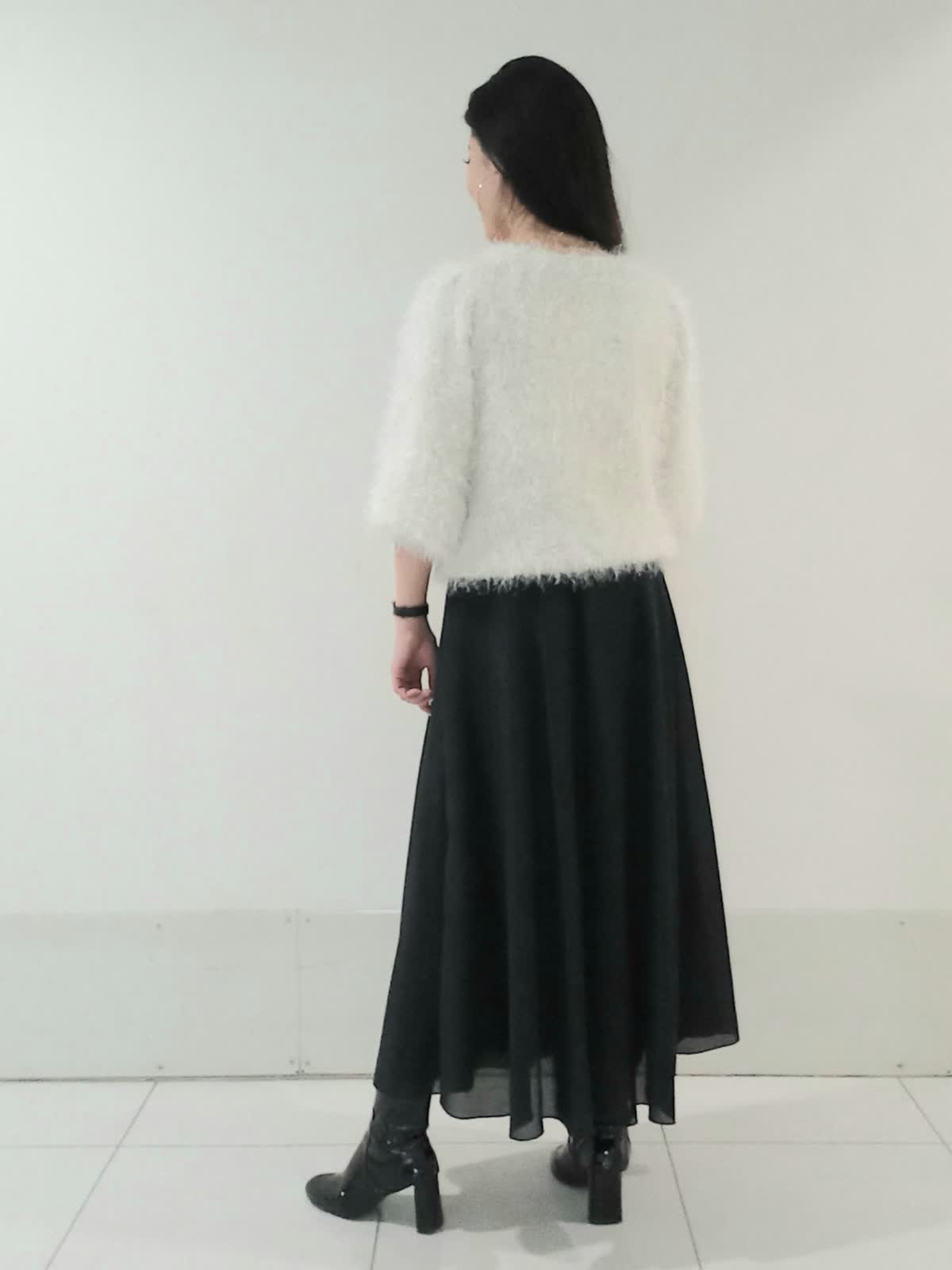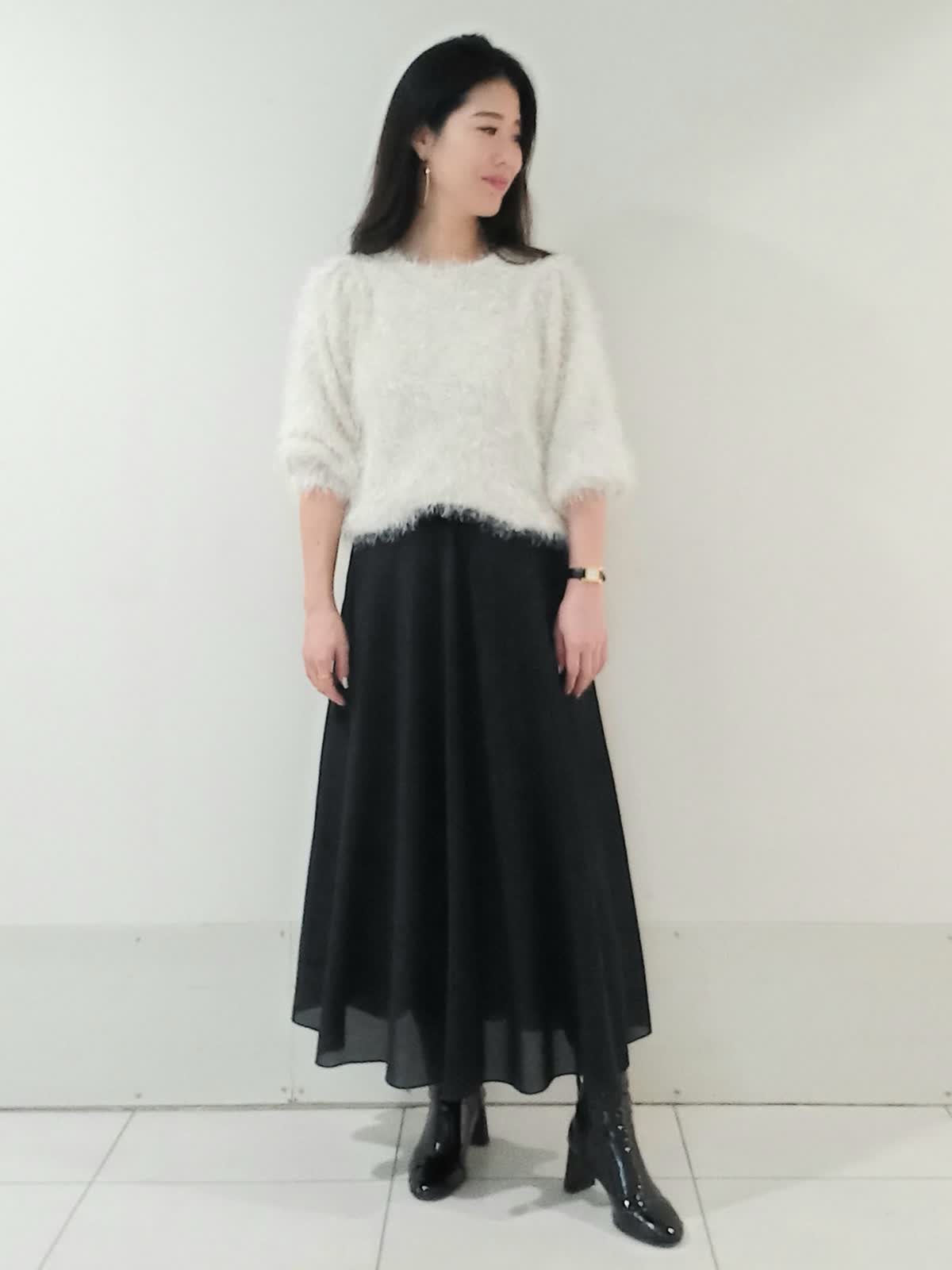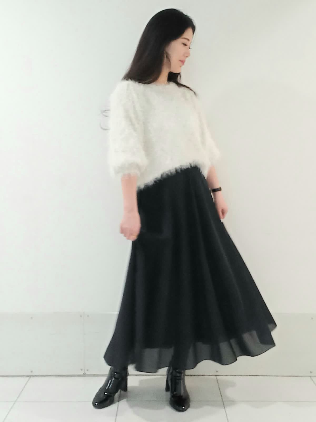 【着用サイズニット9号、スカート9号】 ふわふわとした素材が可愛らしさや柔らかな印象を与えてくれるシャギーニット。 スカートはロング丈でAラインのシルエットがエレガントです。 シンプルなモノトーンでも単調にならず洗練された印象に。 トップスをコンパクトにまとめてハイウエストのスカートとヒールのあるブーツで合わせることでスタイルアップ効果も期待できます。 甘すぎず大人っぽい落ち着きと華やかさを兼ね備えた、冬にぴったりのデートやお出かけにおすすめのコーディネートです!