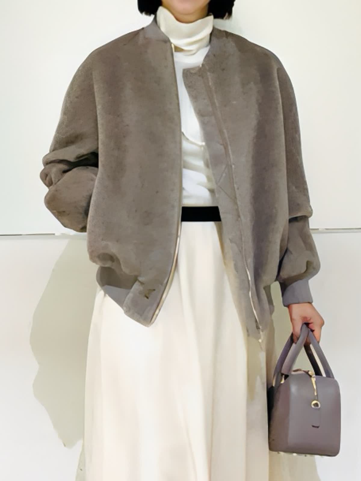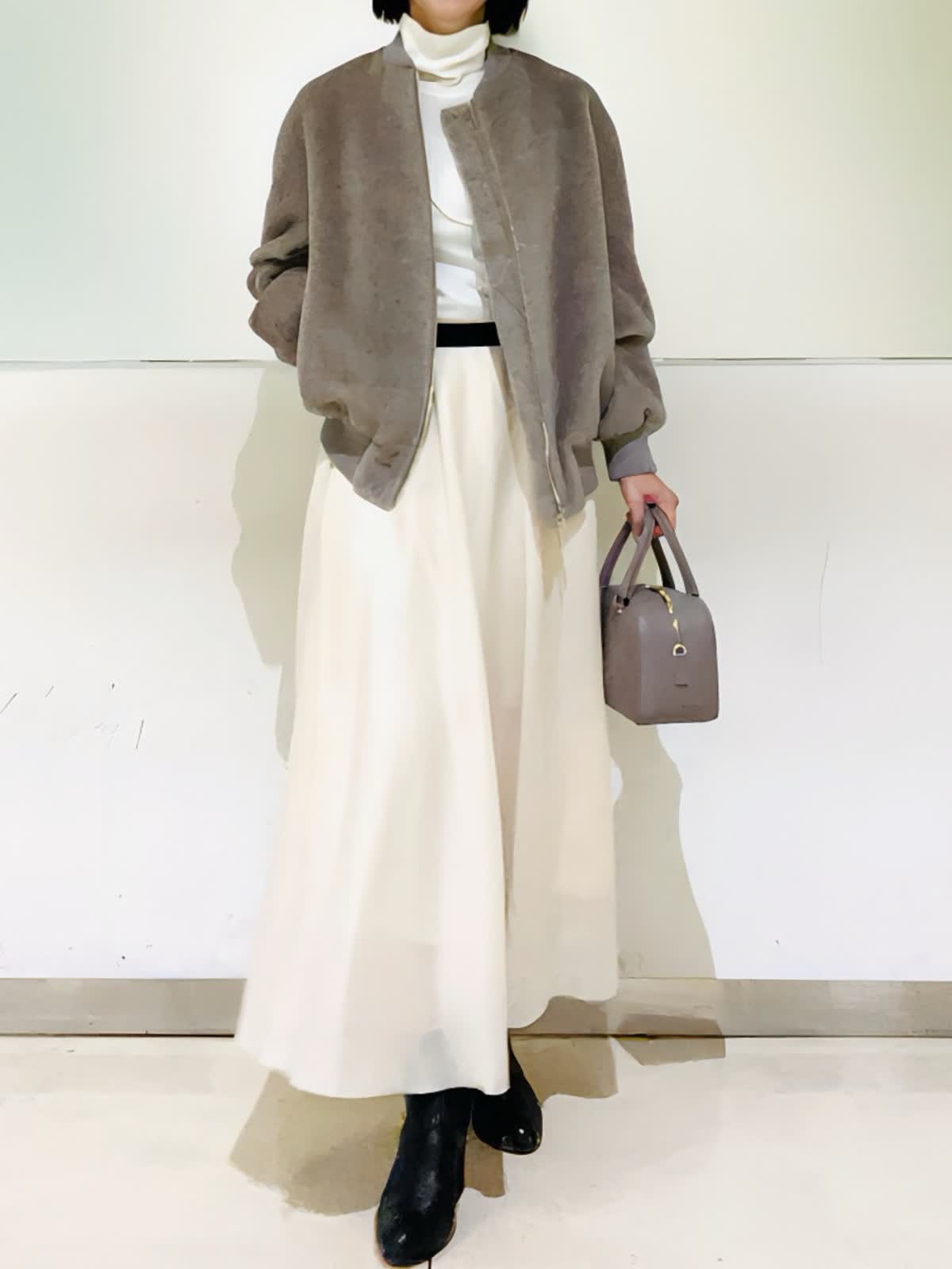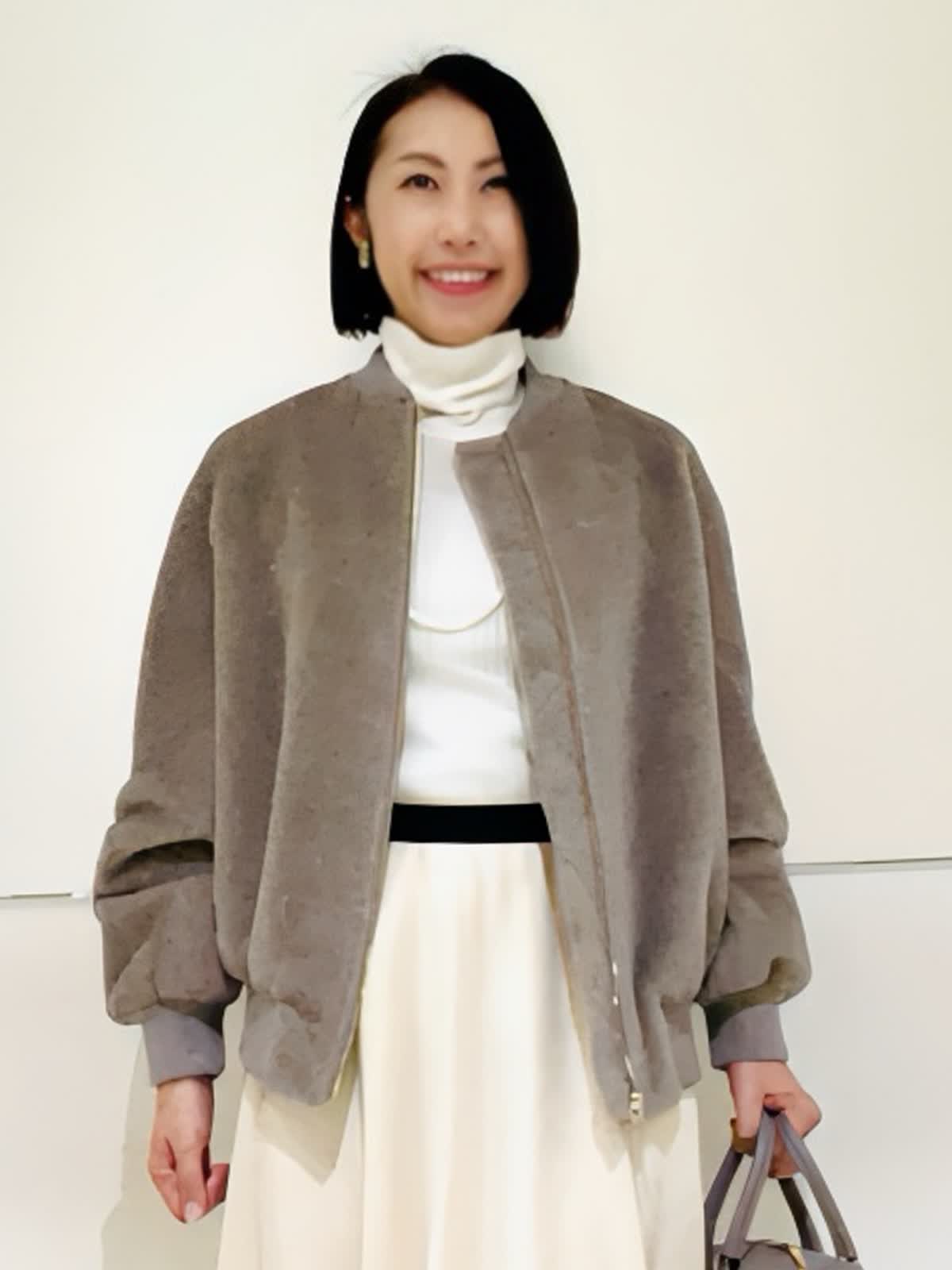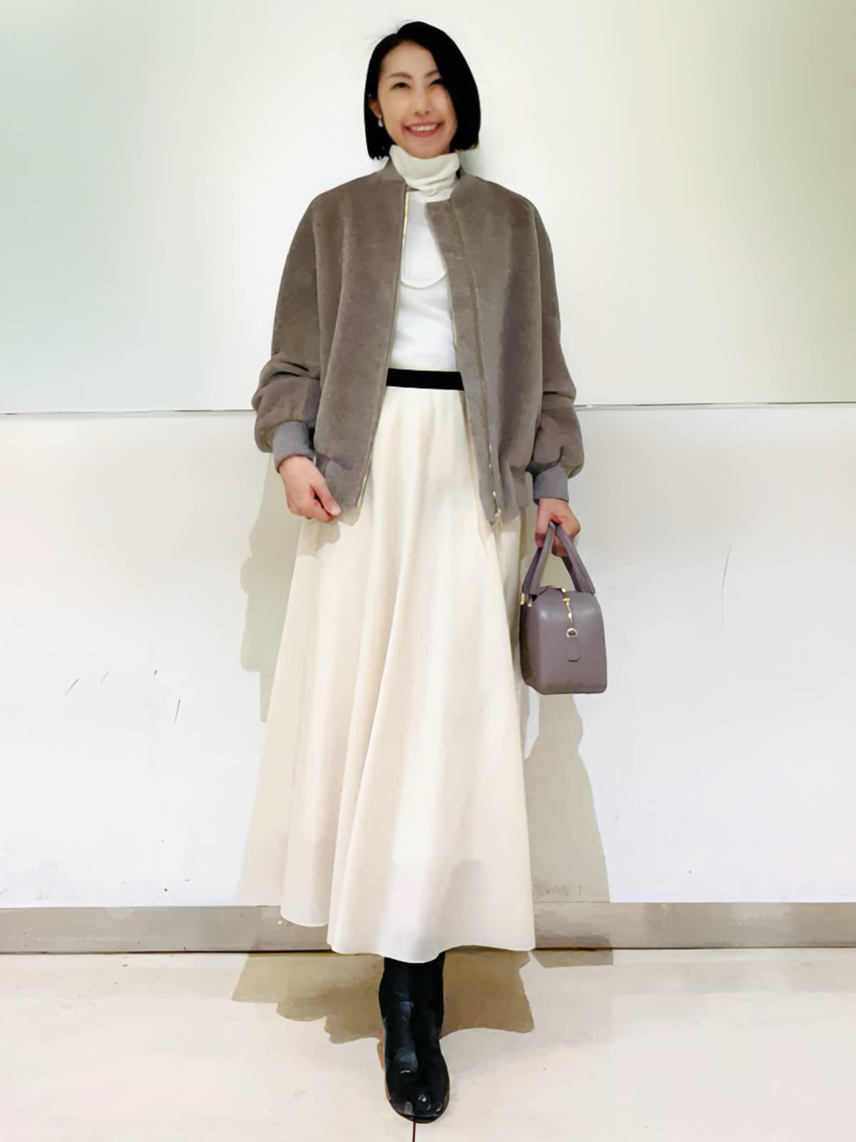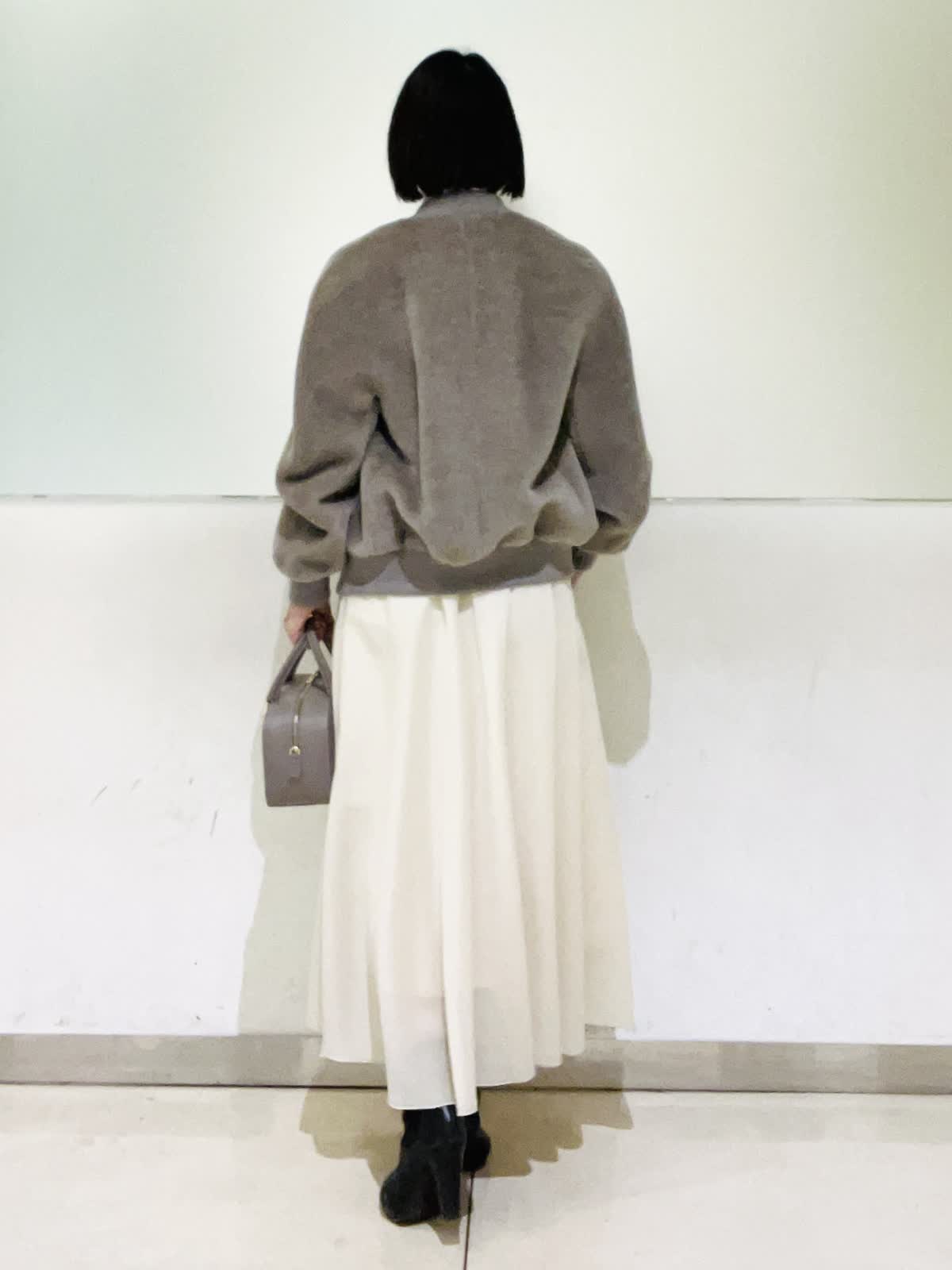 【着用アイテム】すべて9号 【着用カラー】ブルゾン:ベージュ ニット:オフホワイト スカート:アイボリー ノエル感漂うお出かけコーディネート。スーリーアルパカとウールで織り上げたシャギー素材を使用したボンバージャケット。ふくらみのある袖と丸みのある立体感が可愛いシルエット。存在感のあるゴールドのメタルファスナーがゴージャスな雰囲気です。クリスマスや忘年会など、楽しいイベントに来ていきたいコーディネートです。