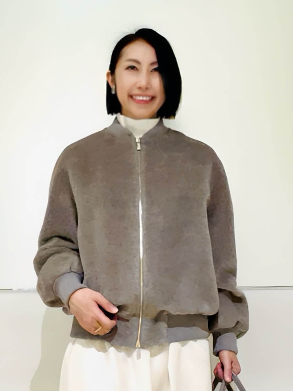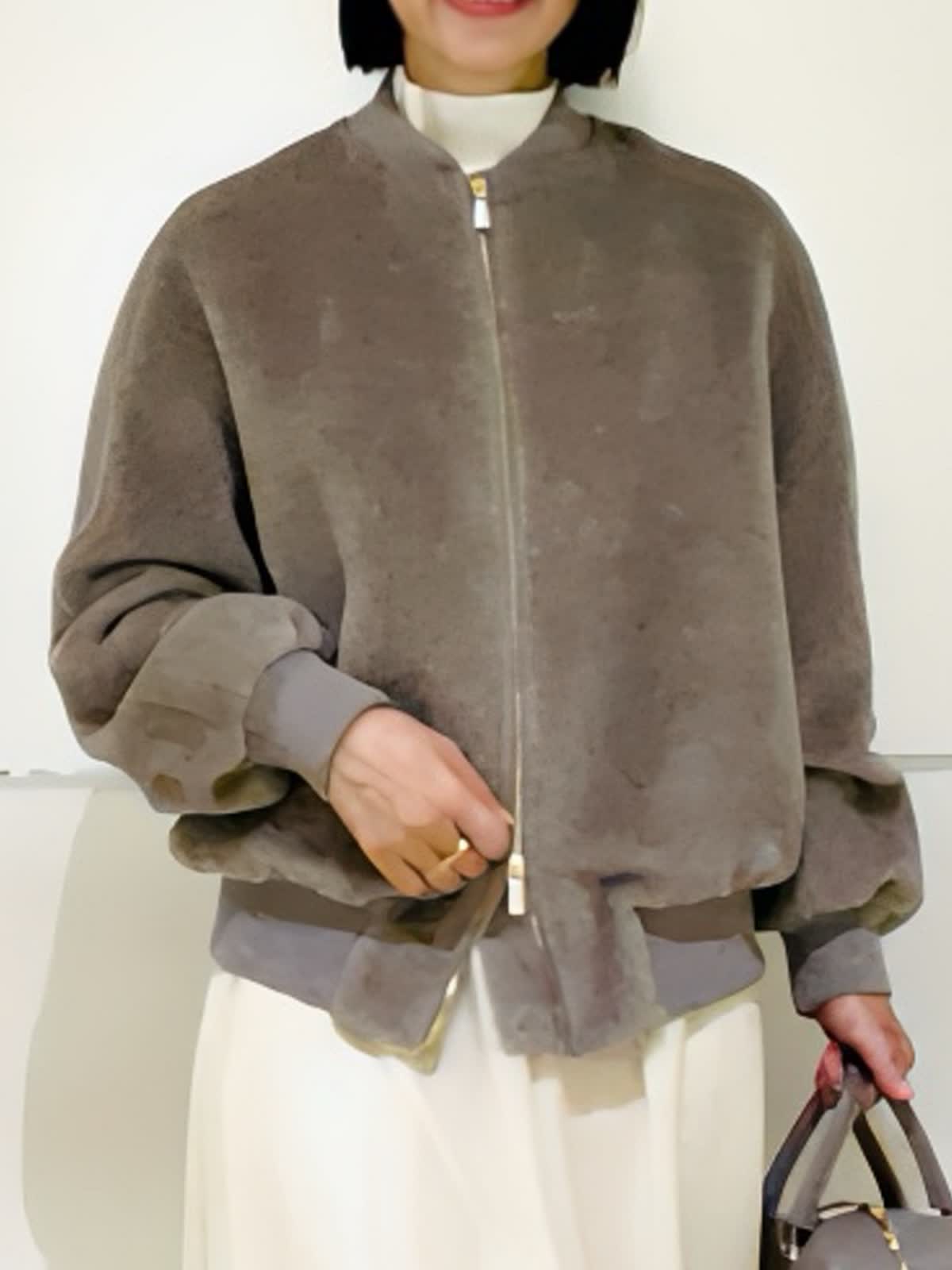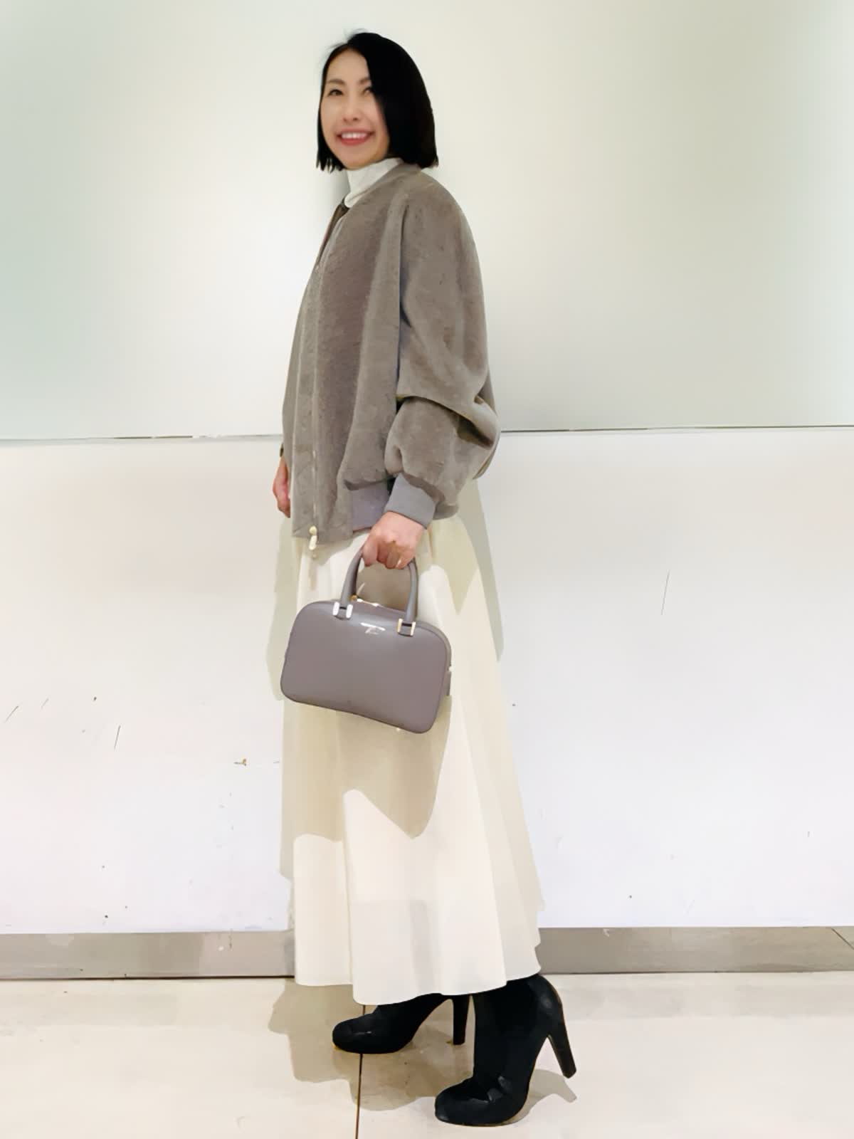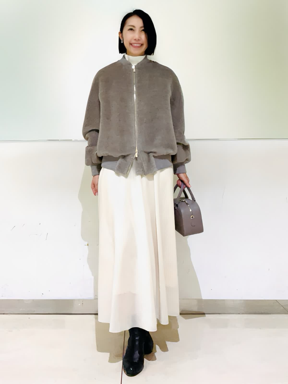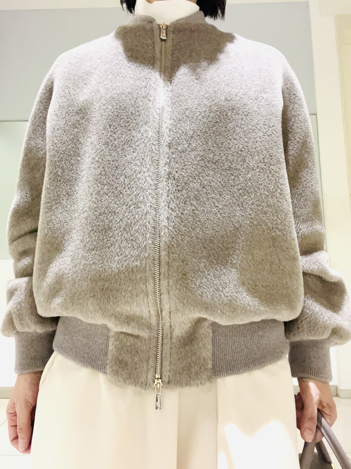 【着用アイテム】すべて9号 【着用カラー】ブルゾン:ベージュ ニット:オフホワイト スカート:アイボリー ノエル感漂うお出かけコーディネート。スーリーアルパカとウールで織り上げたシャギー素材を使用したボンバージャケット。ふくらみのある袖と丸みのある立体感が可愛いシルエット。存在感のあるゴールドのメタルファスナーがゴージャスな雰囲気です。クリスマスや忘年会など、楽しいイベントに来ていきたいコーディネートです。