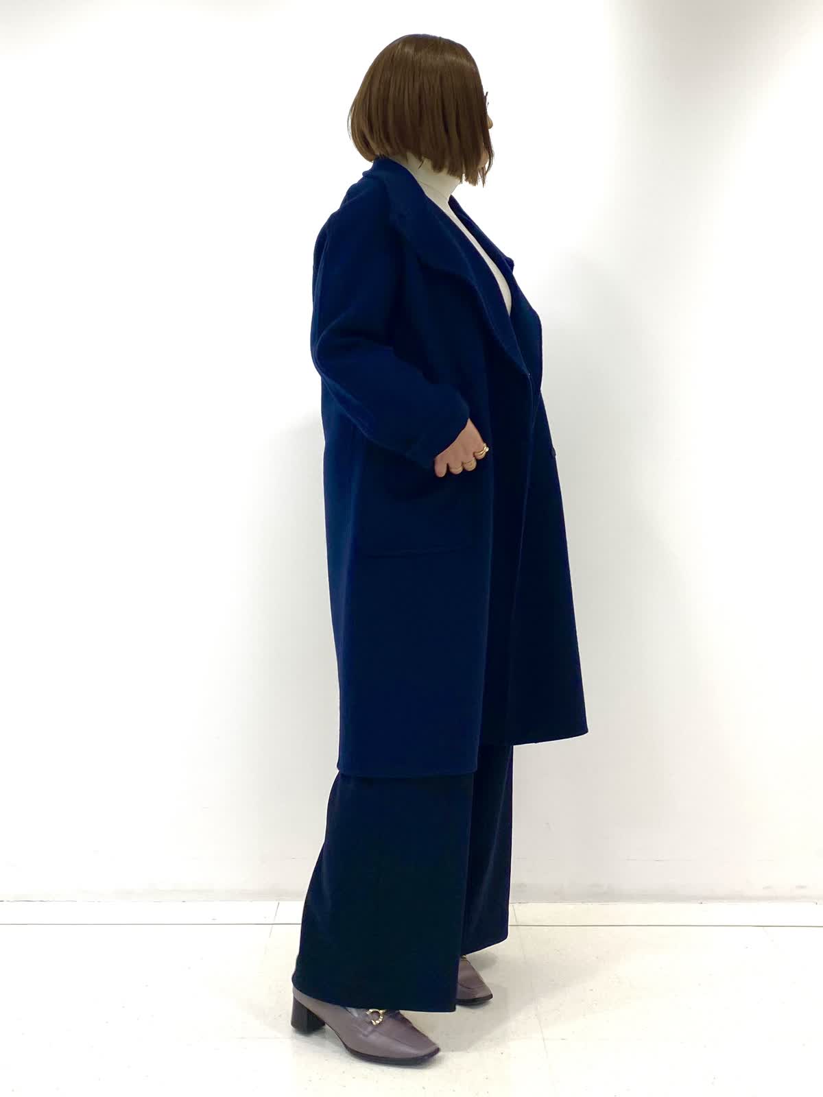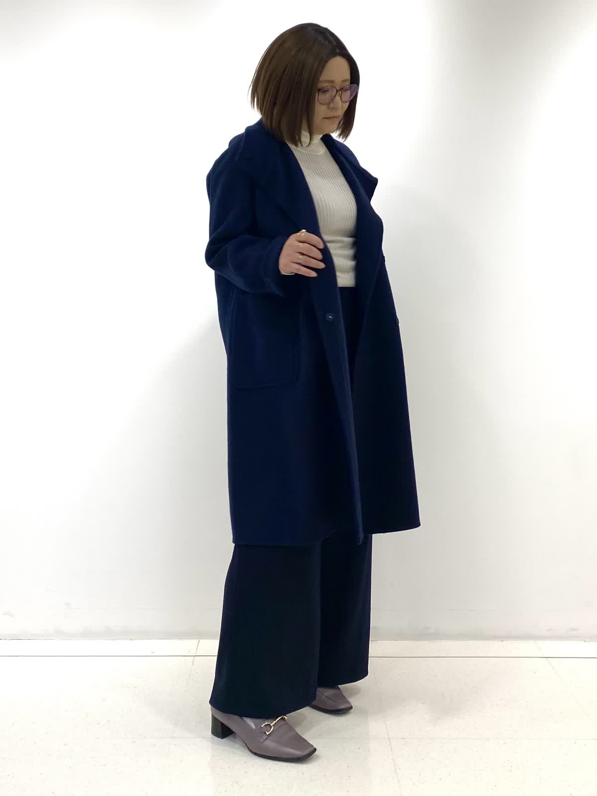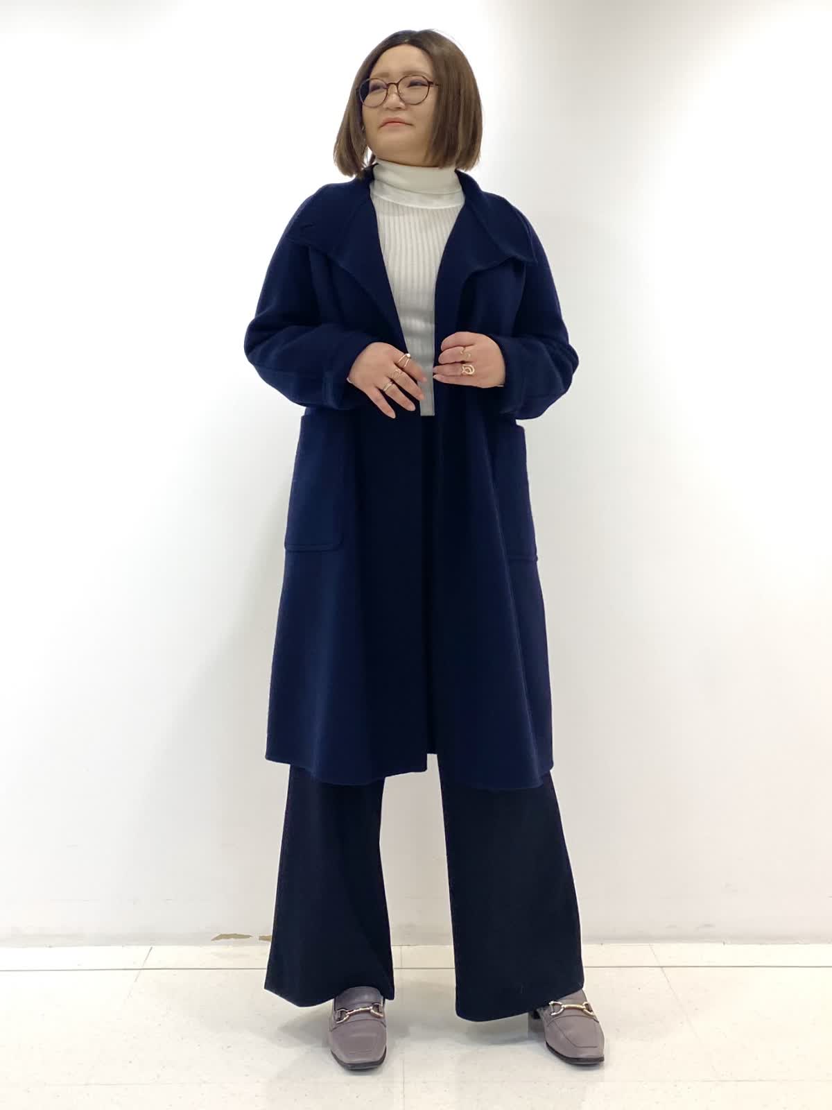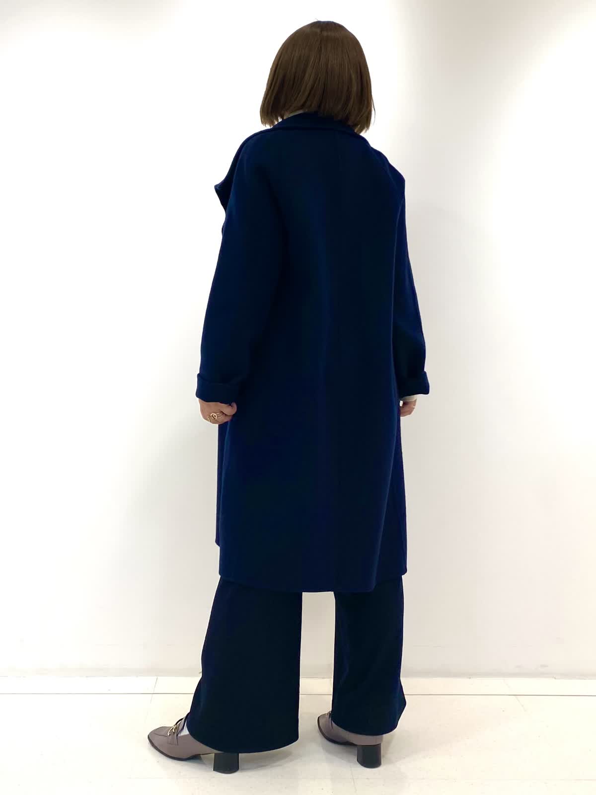 【着用サイズ・カラー】コート:9号/ネイビー ニット:9号/グレーベージュ パンツ:9号/ネイビー 柔らかくとても軽い素材が嬉しいスタンドコート。襟を開けても着られるデザインは、合わせるお洋服を選ばず着回し抜群です!身体のラインを程よく拾ってくれるので女性らしいシルエットが出るのもおすすめポイントです◎