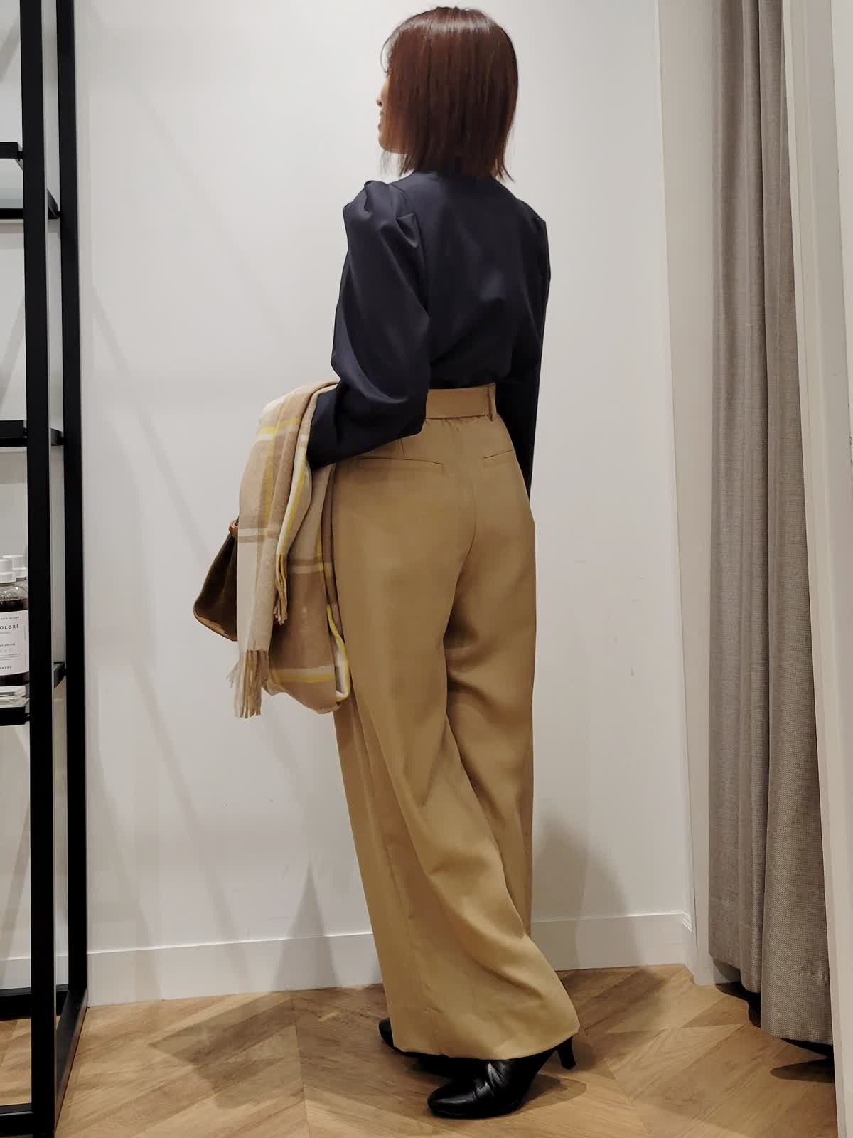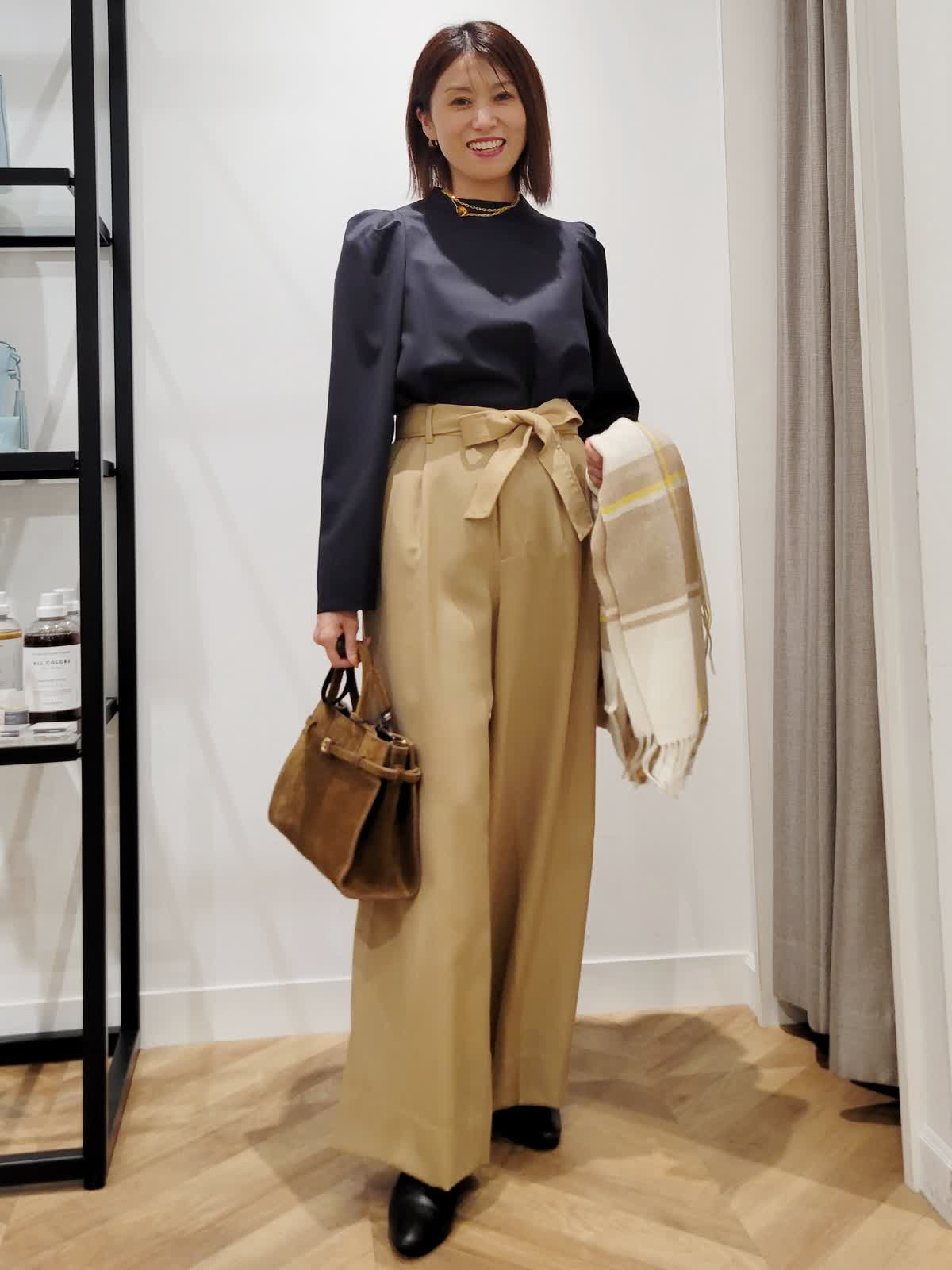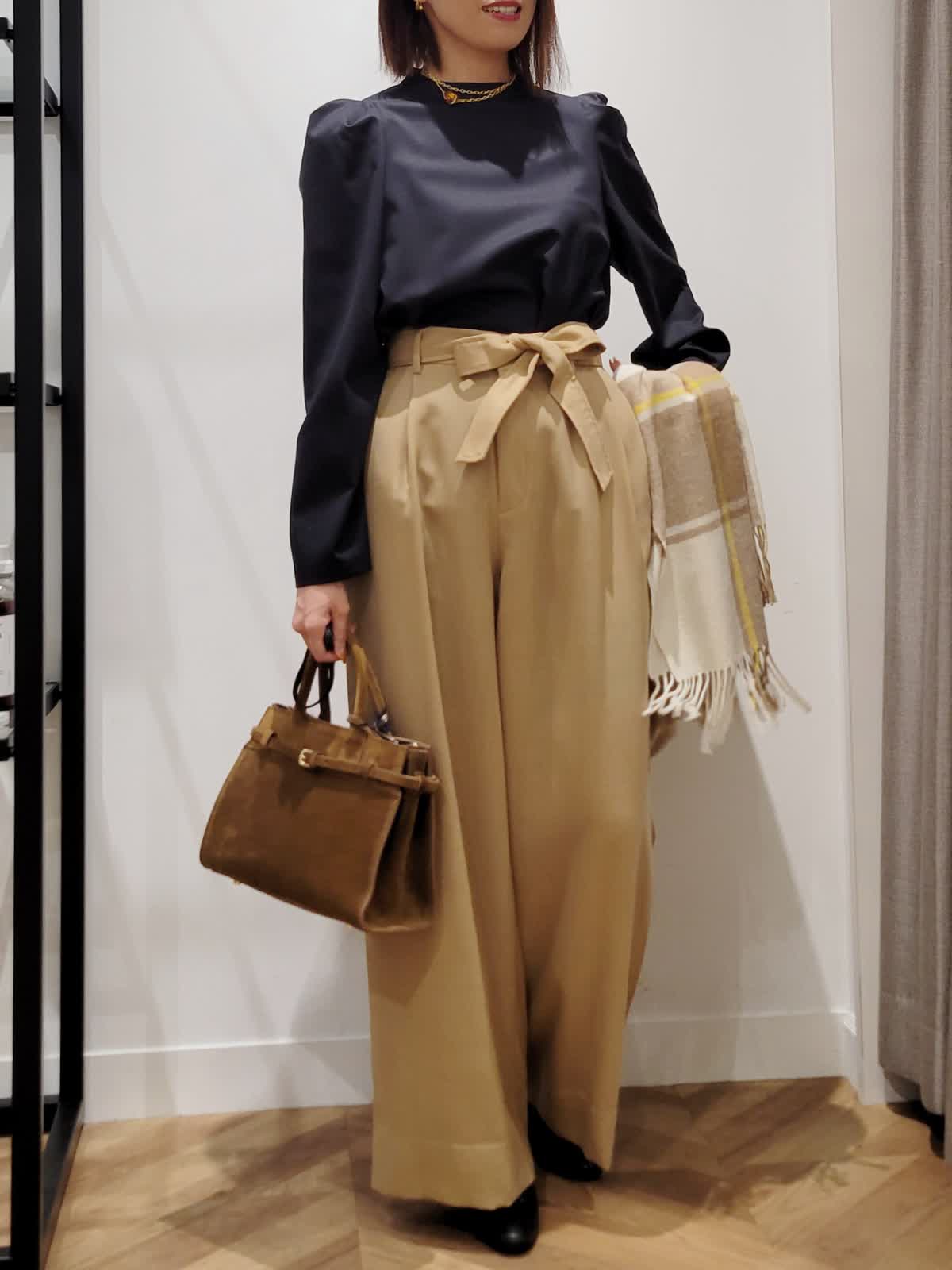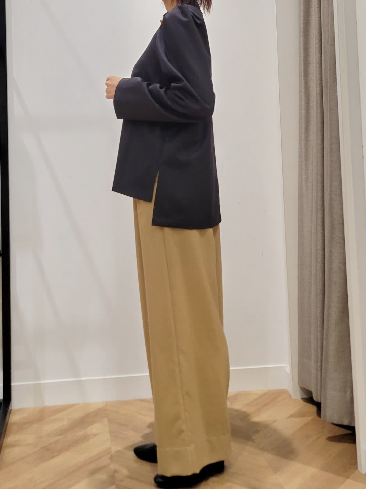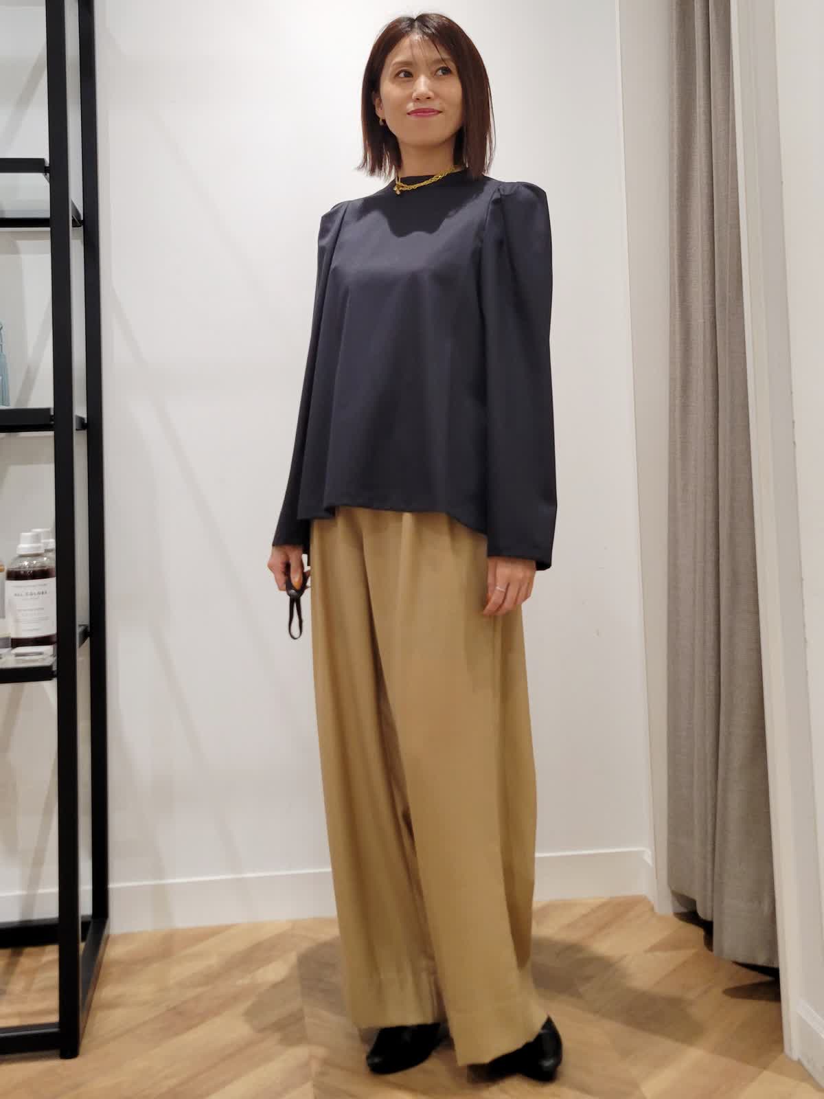 【着用サイズ】ブラウス?ネイビー?9号 パンツ?ベージュ?9号スカート?ブルーグレー?9号 三尋木奈保さんコラボブラウス。肩のタックが上品で切り返しが内に寄っているので肩幅が丁度いいシルエットに。 りぼん付きワイドパンツと合わせてお仕事でもお出かけにも。ウール素材の少し薄手タイプ。ブラウスはスカート合わせるとまた雰囲気が変わりフェミニンな装いに。甘くなりすぎないようカジュアルなジャケットを合わせても◎