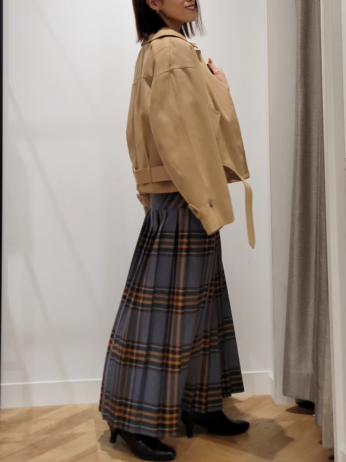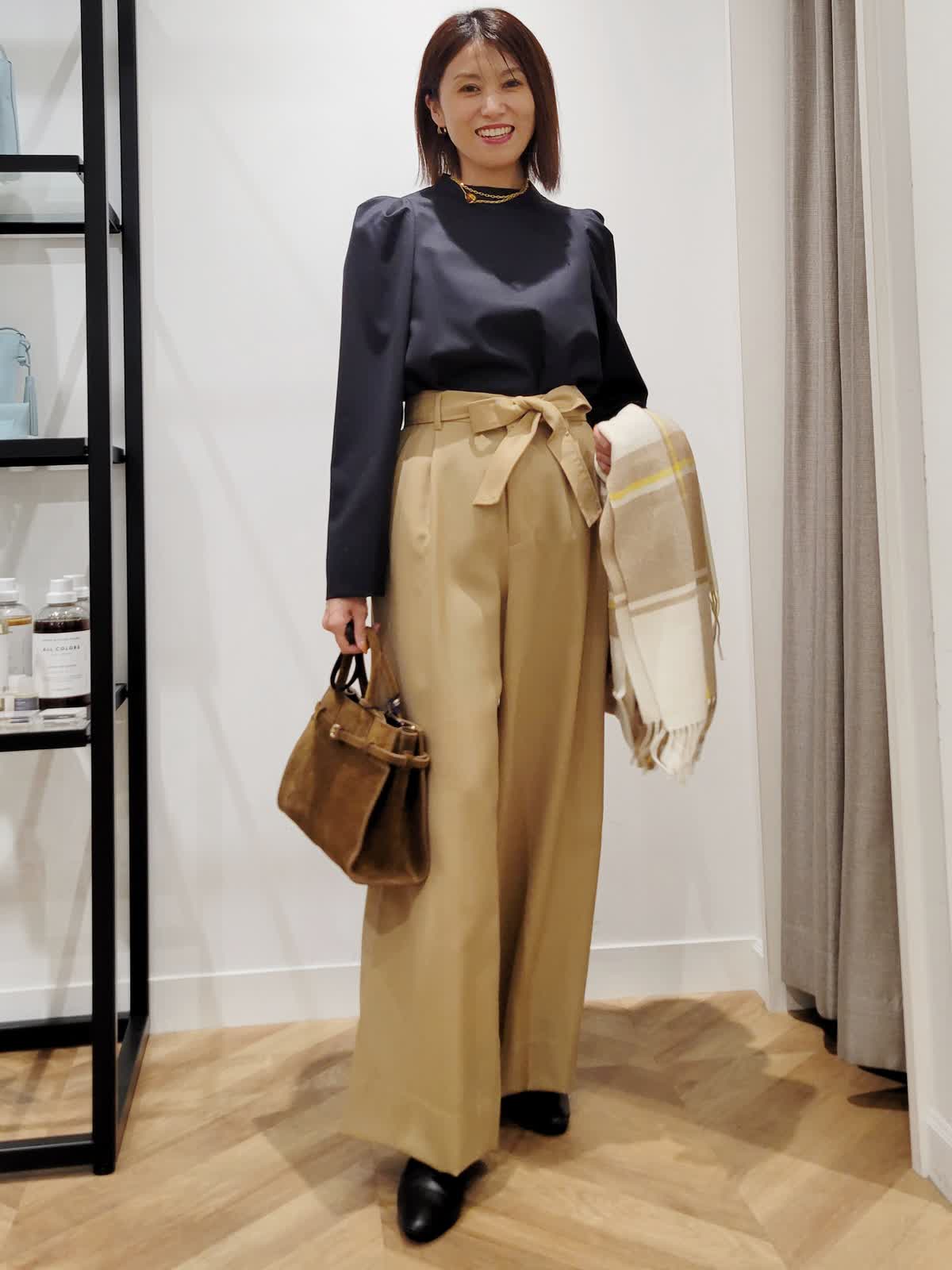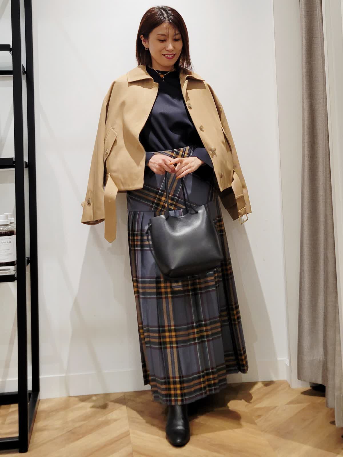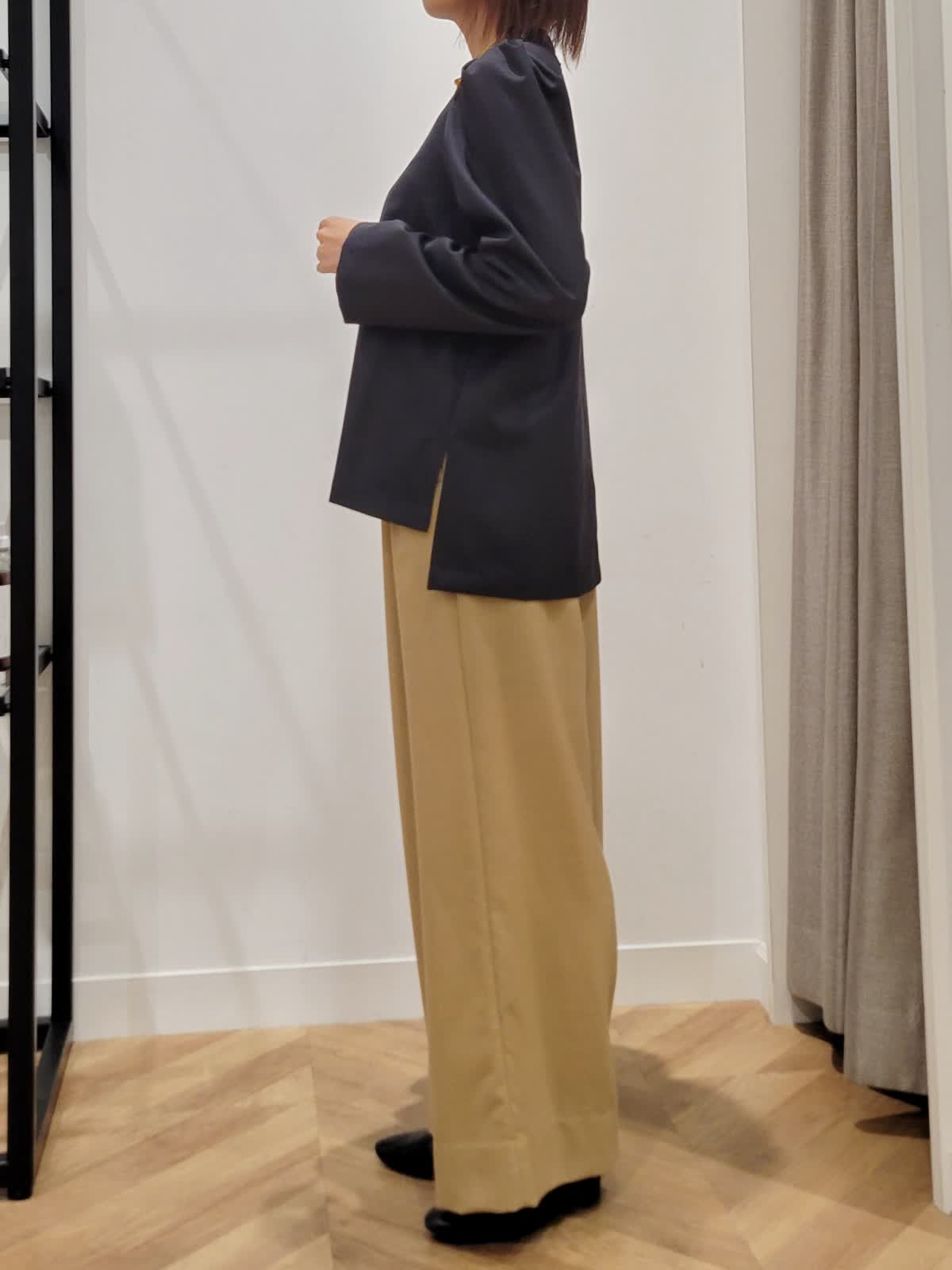 【着用サイズ】ブラウス?ネイビー?9号 スカート??9号 ブルゾン?ベージュ?9号 三尋木奈保さんコラボブラウスとジャケットコーデ。ブラウスは肩のタックが上品で切り返しが内に寄っているので肩幅が丁度いいシルエットに。 凹凸のある襟付きブルゾンはウエストベルト付きでおしゃれ感もアップ。垂らして着ても素敵です。 大人気オニールスカートと合わせて大人可愛いスタイルに。巻きスカート風なデザインで歩きやすさ◎ ボトムを変えてりぼん付きワイドパンツと合わせてお仕事でもお出かけにも。ウール素材の少し薄手タイプ。