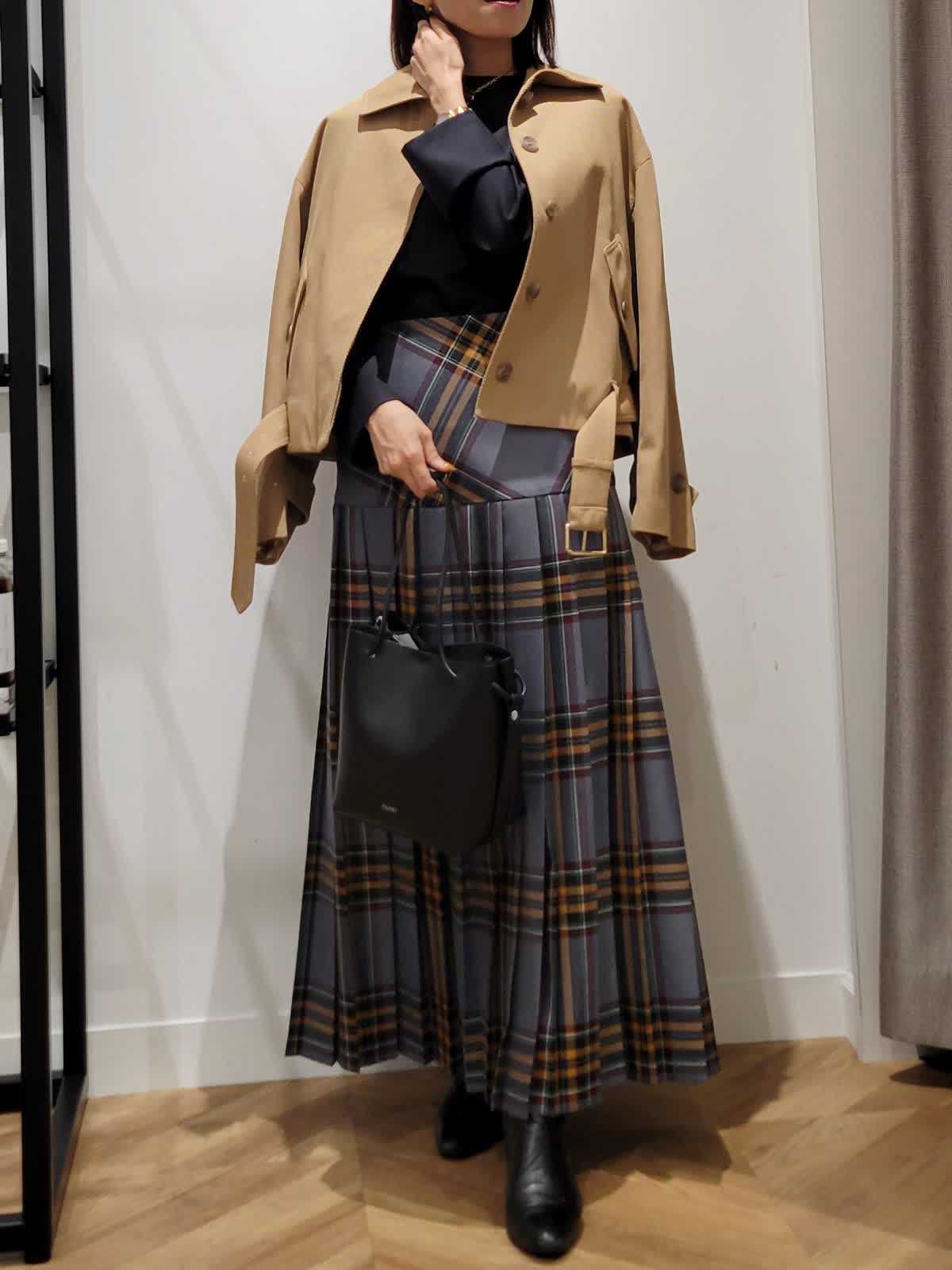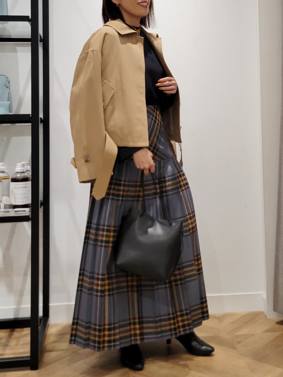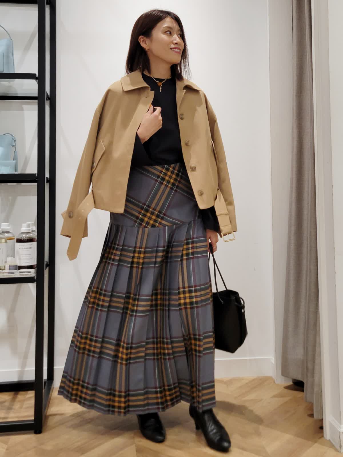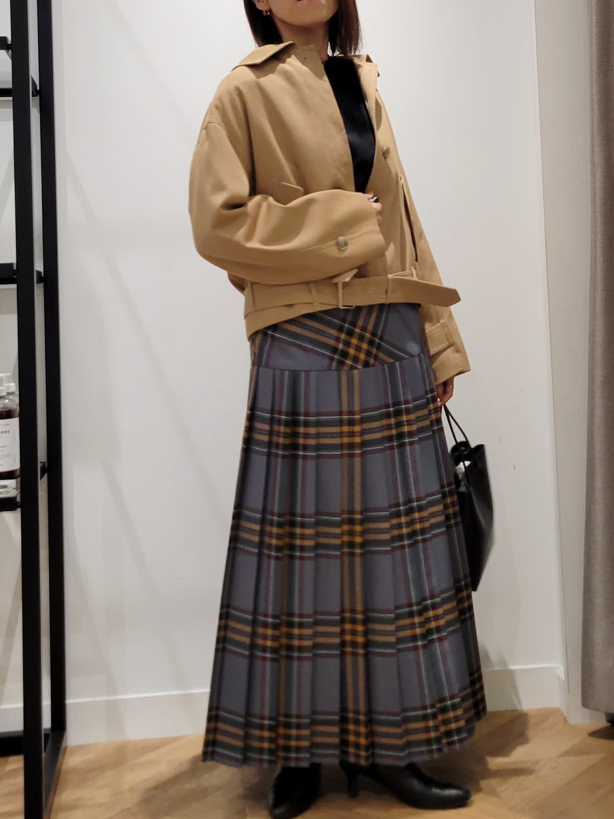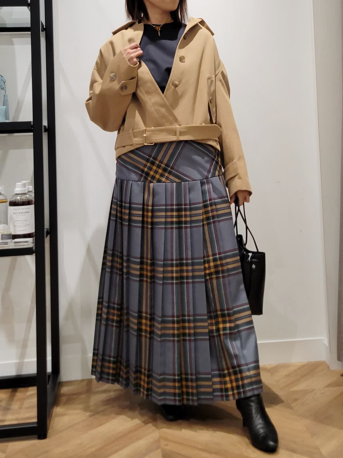 【着用サイズ】ブラウス?ネイビー?9号 スカート??9号 ブルゾン?ベージュ?9号 三尋木奈保さんコラボブラウスとジャケットコーデ。ブラウスは肩のタックが上品で切り返しが内に寄っているので肩幅が丁度いいシルエットに。 凹凸のある襟付きブルゾンはウエストベルト付きでおしゃれ感もアップ。垂らして着ても素敵です。 大人気オニールスカートと合わせて大人可愛いスタイルに。巻きスカート風なデザインで歩きやすさ◎ ボトムを変えてりぼん付きワイドパンツと合わせてお仕事でもお出かけにも。ウール素材の少し薄手タイプ。