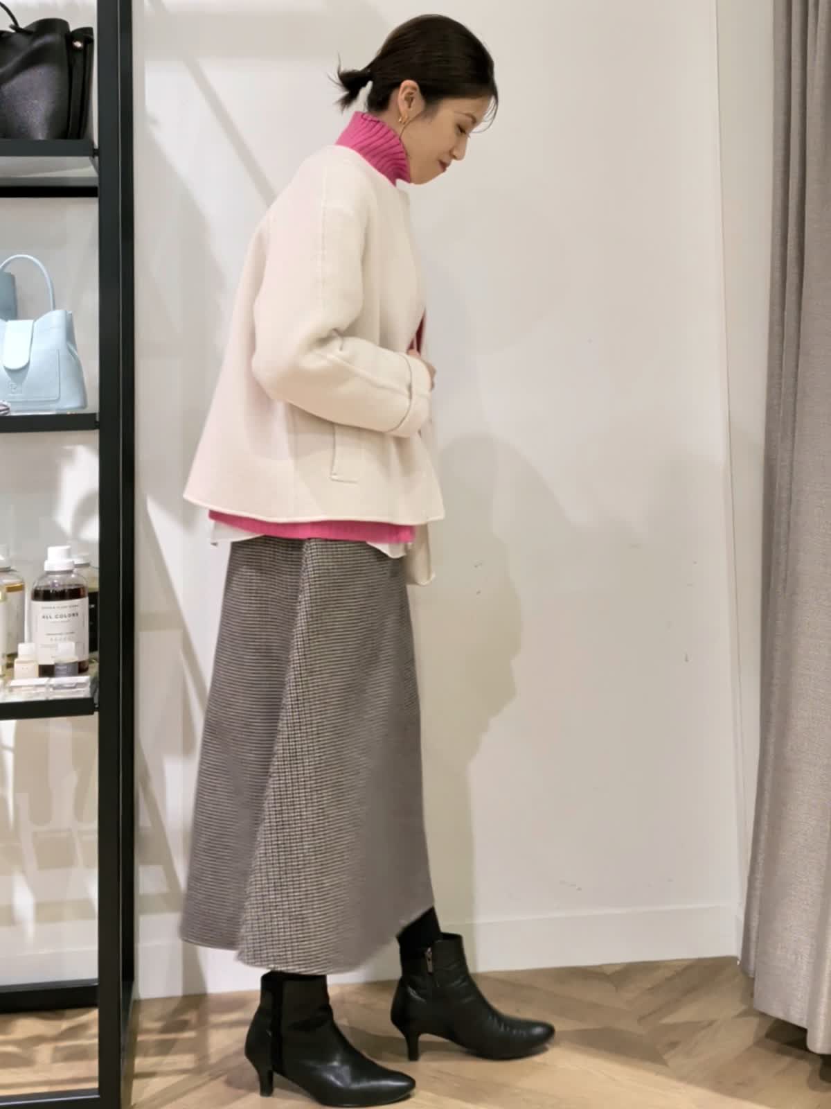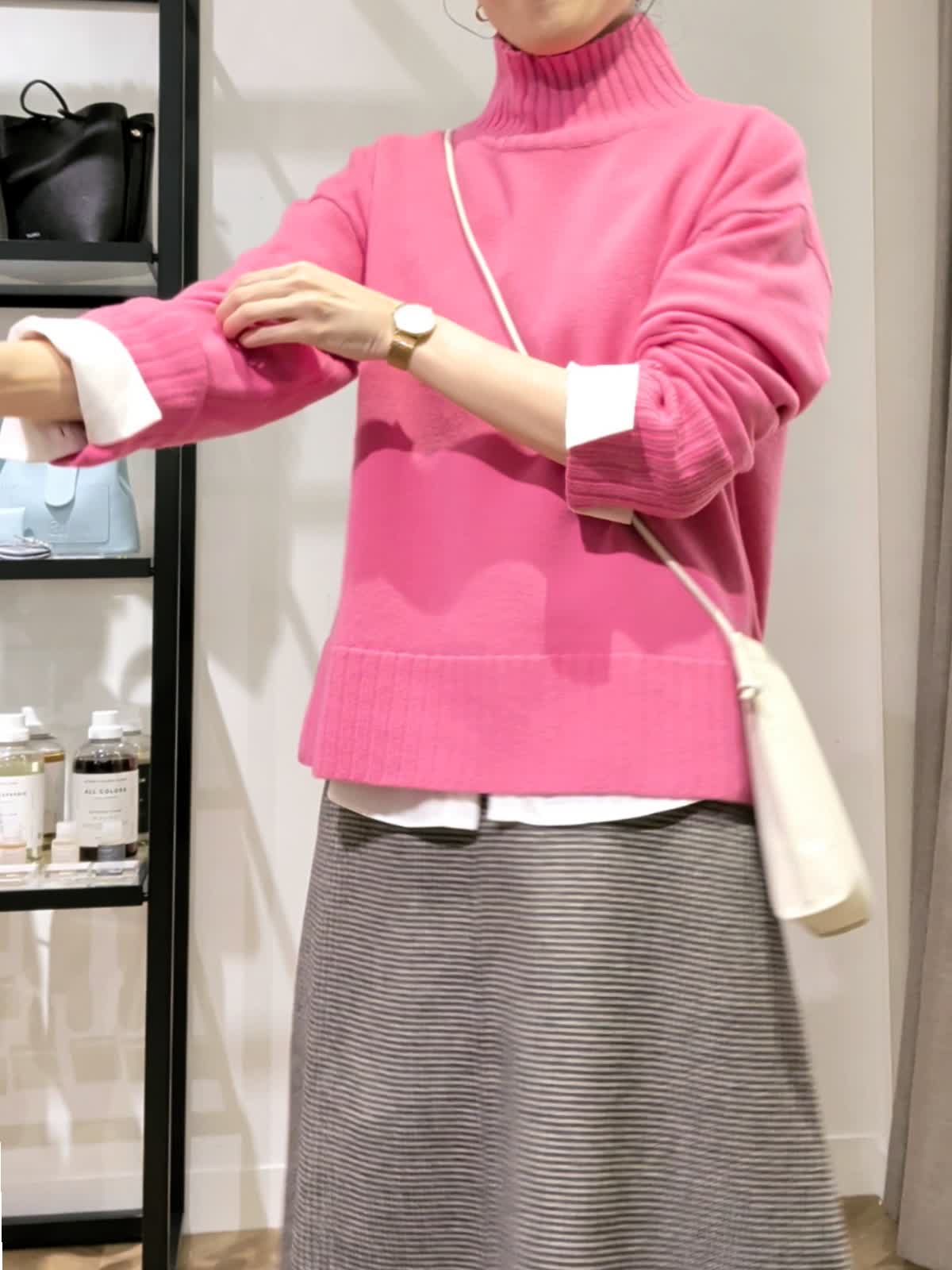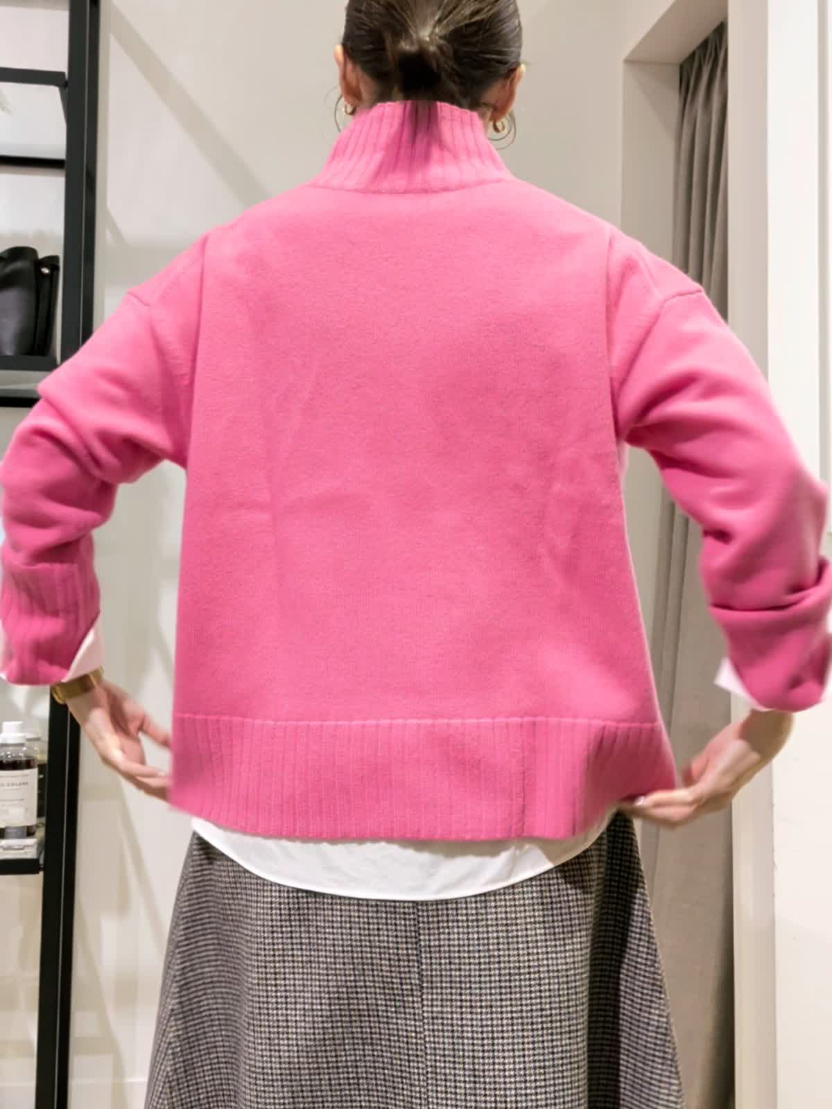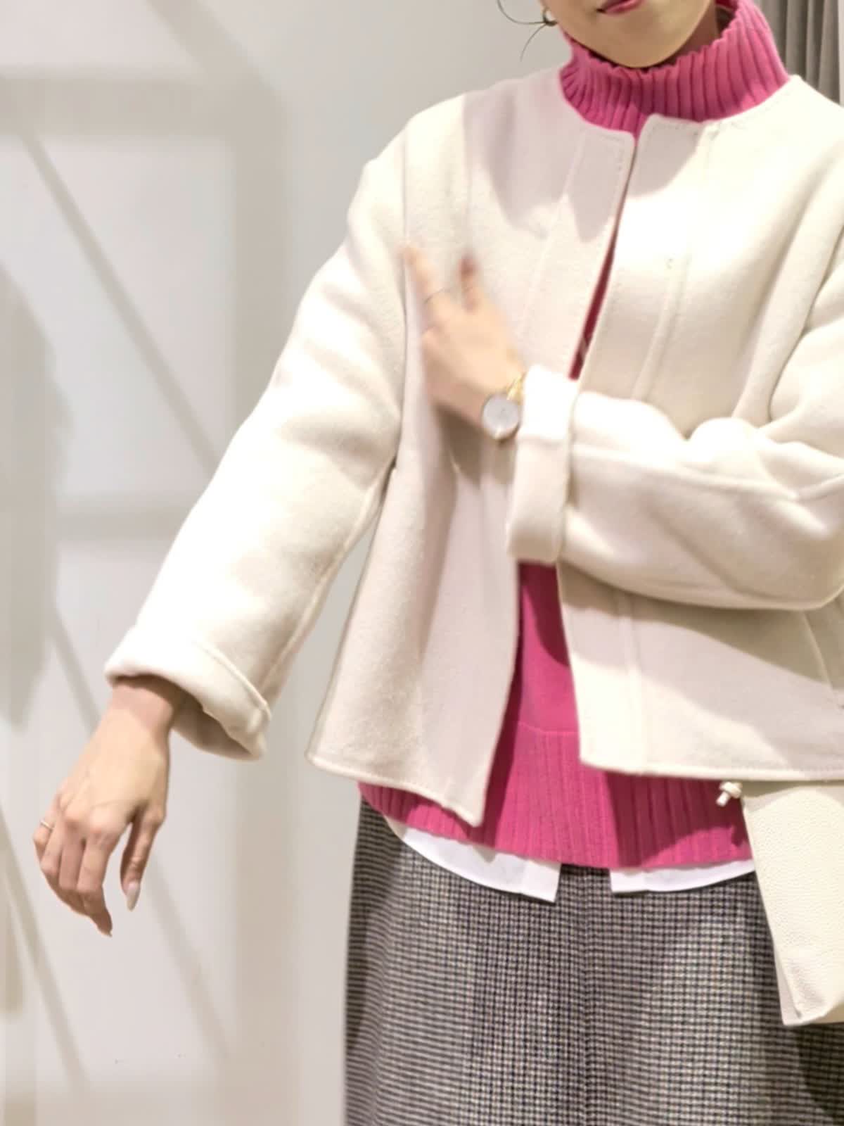 【着用サイズ】コート アイボリー7号 ニット チェリーピンク11号 スカート柄小 7号 アウター時期だからこそ挑戦したいカラーニット。ハイネックのゆったりシルエットニット。ブラウスとレイヤードスタイルにしてみました。重ねるのでいつもより一つサイズを上げてみましたがいつものサイズでもよさそうでした。パキッとカラーも白を入れる事でまとまりよく着ていただけます。お袖ものぞかせてやりすぎないおしゃれ感。スカートは実は小さなチェック柄。フレアタイプでウエストはゴムでは無いですがいつもよりゆったり。ヒップ周りも気にならないでも膨らまないスッキリ見せたい方にはおすすめです。リバーコートは着ている?というほど軽く暖かな一着。袖通りがいいように裏地付きでストレスなく着ていただけます。シンプルなのでどんなお洋服にも合わせていただけそうです。 スカートと同じ素材のブルゾンも作っていているのでセットアップでの着用も◎