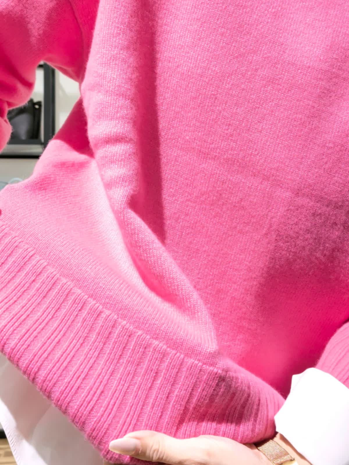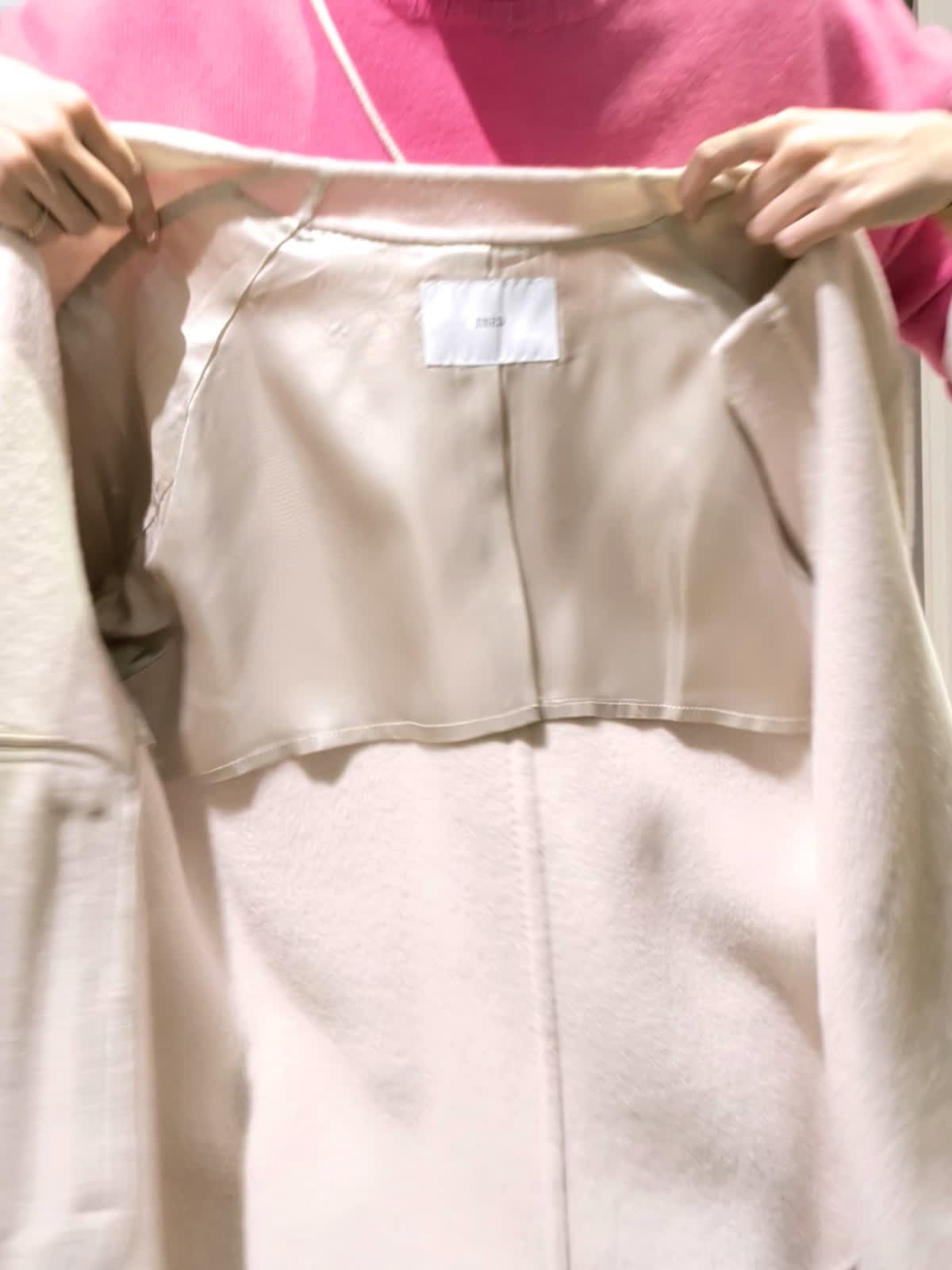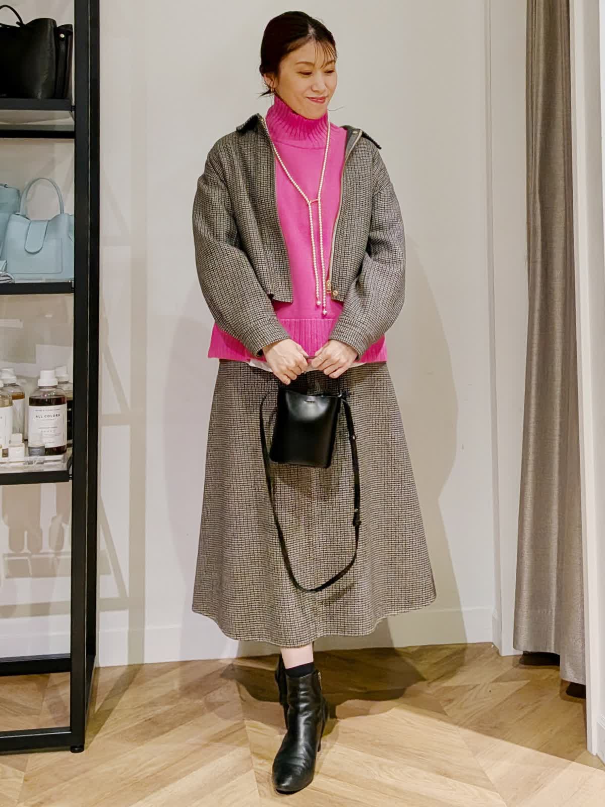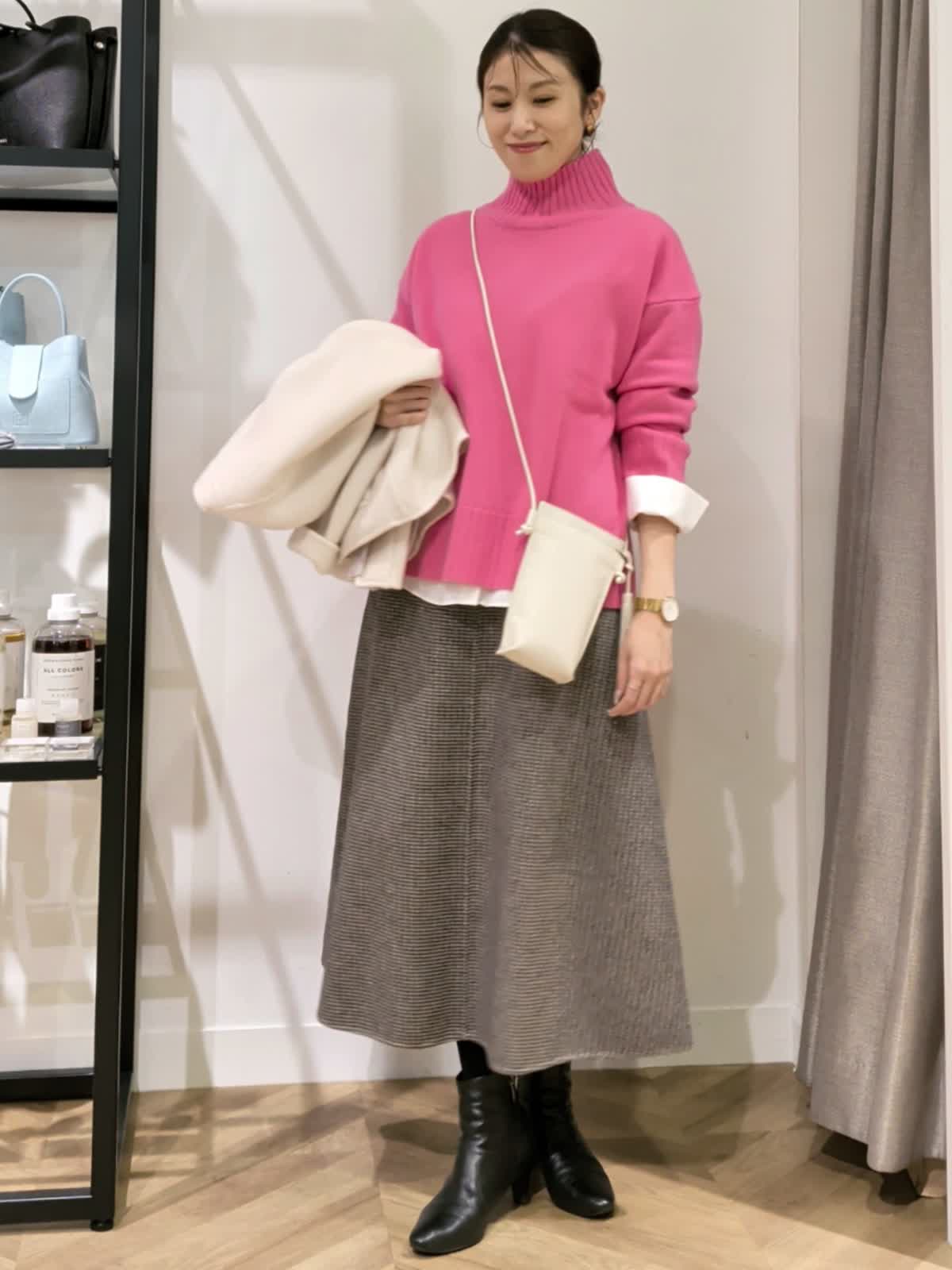 【着用サイズ】コート アイボリー7号 ニット チェリーピンク11号 スカート柄小 7号 アウター時期だからこそ挑戦したいカラーニット。ハイネックのゆったりシルエットニット。ブラウスとレイヤードスタイルにしてみました。重ねるのでいつもより一つサイズを上げてみましたがいつものサイズでもよさそうでした。パキッとカラーも白を入れる事でまとまりよく着ていただけます。お袖ものぞかせてやりすぎないおしゃれ感。スカートは実は小さなチェック柄。フレアタイプでウエストはゴムでは無いですがいつもよりゆったり。ヒップ周りも気にならないでも膨らまないスッキリ見せたい方にはおすすめです。リバーコートは着ている?というほど軽く暖かな一着。袖通りがいいように裏地付きでストレスなく着ていただけます。シンプルなのでどんなお洋服にも合わせていただけそうです。 スカートと同じ素材のブルゾンも作っていているのでセットアップでの着用も◎