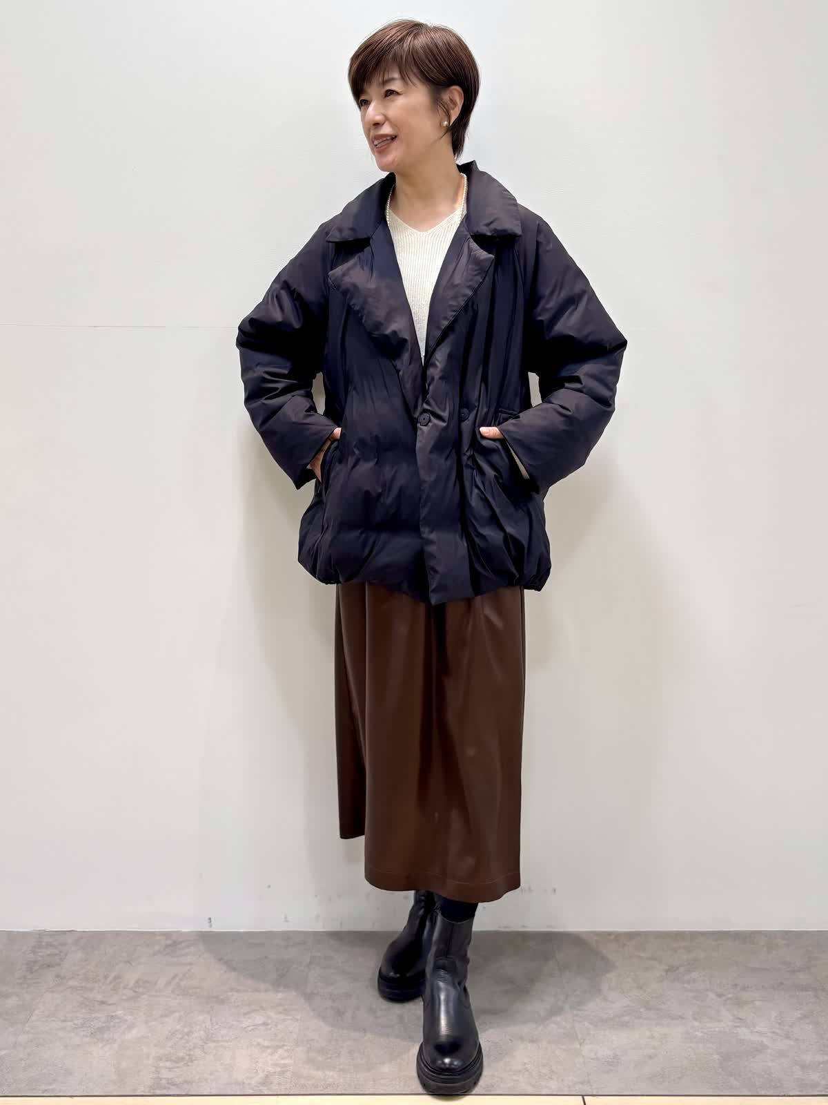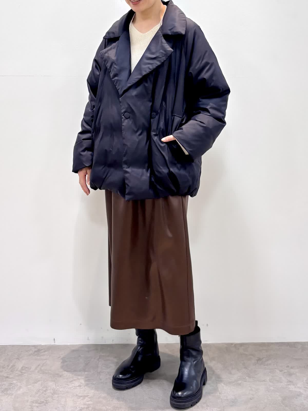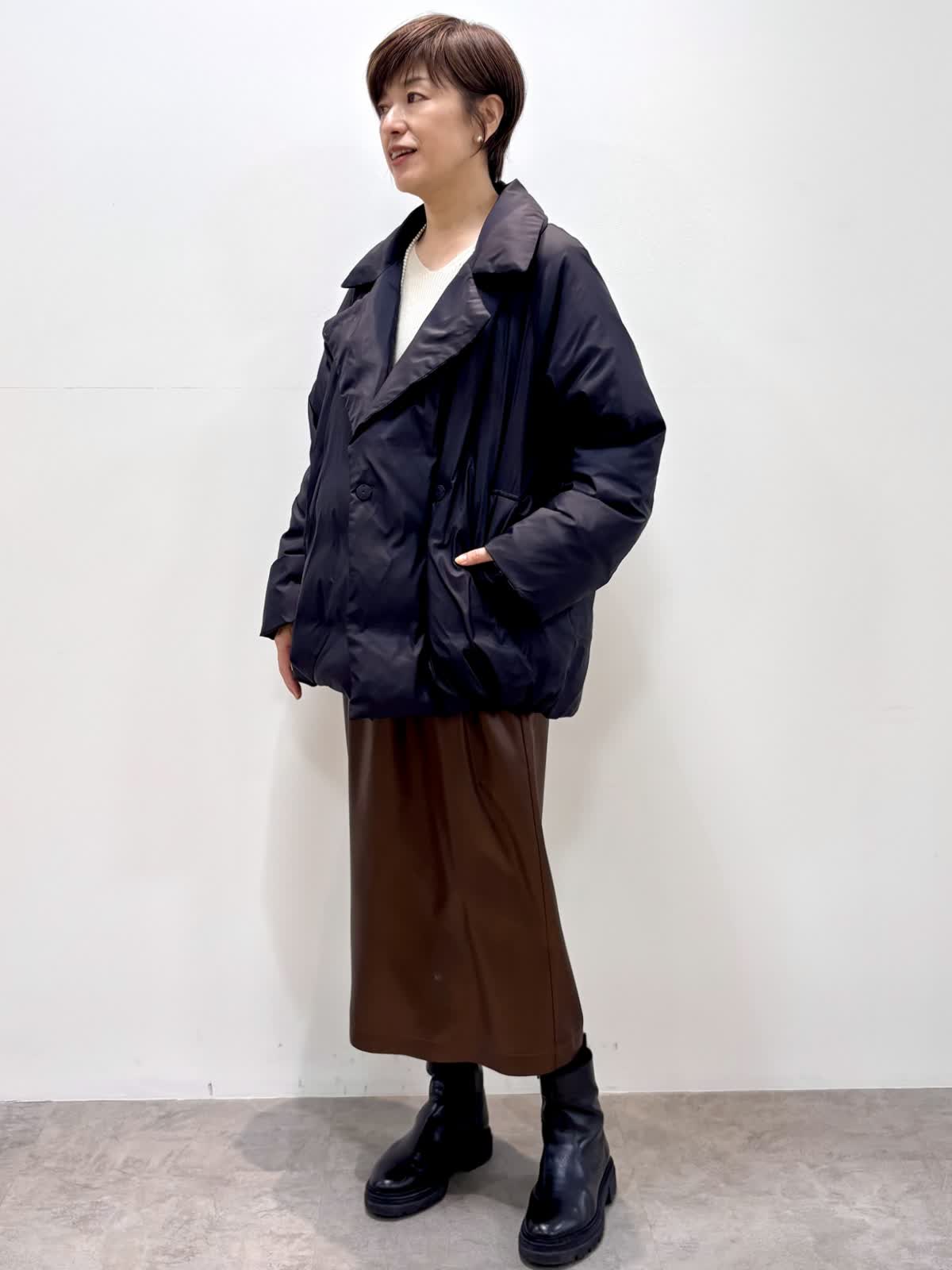 [着用サイズ]アウター:9号 ニット:フリー スカート:9号 [着用カラー]アウター:ブラック ニット:オフホワイト スカート:ブラウン ピーコートダウンは軽くて保温性があり、冬大活躍のアイテムです。 レザー風の光沢感の綺麗なスカートは身体のラインを拾わずシルエットが綺麗です。スパンコールの入ったニットをインに入れると華やかな印象です。