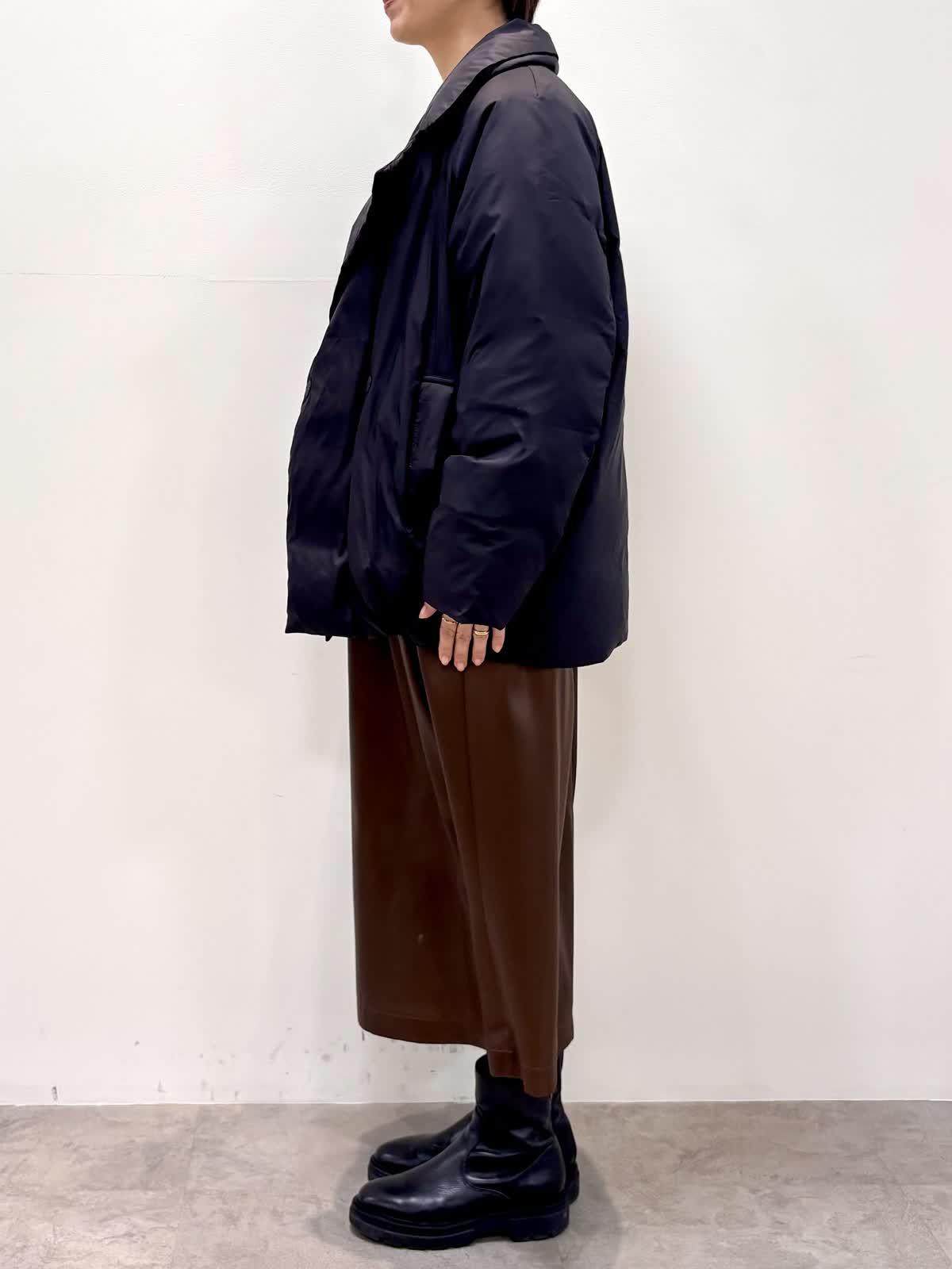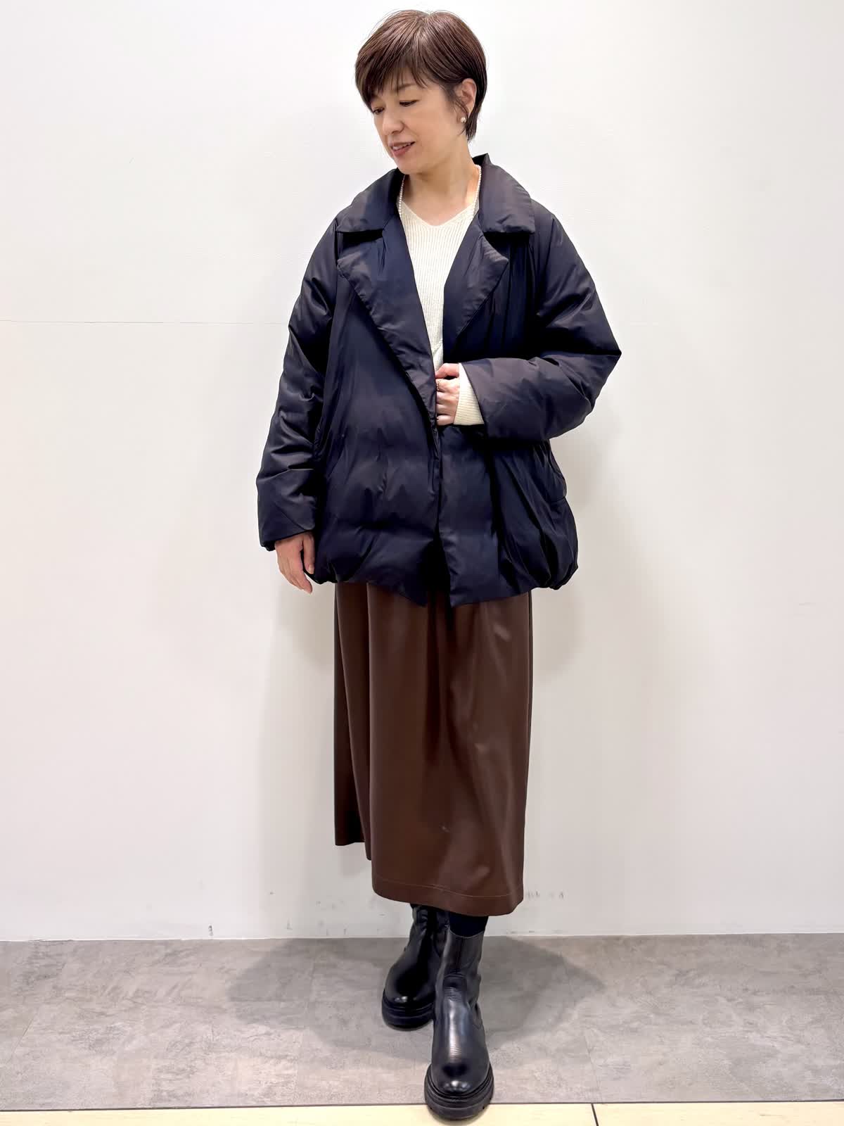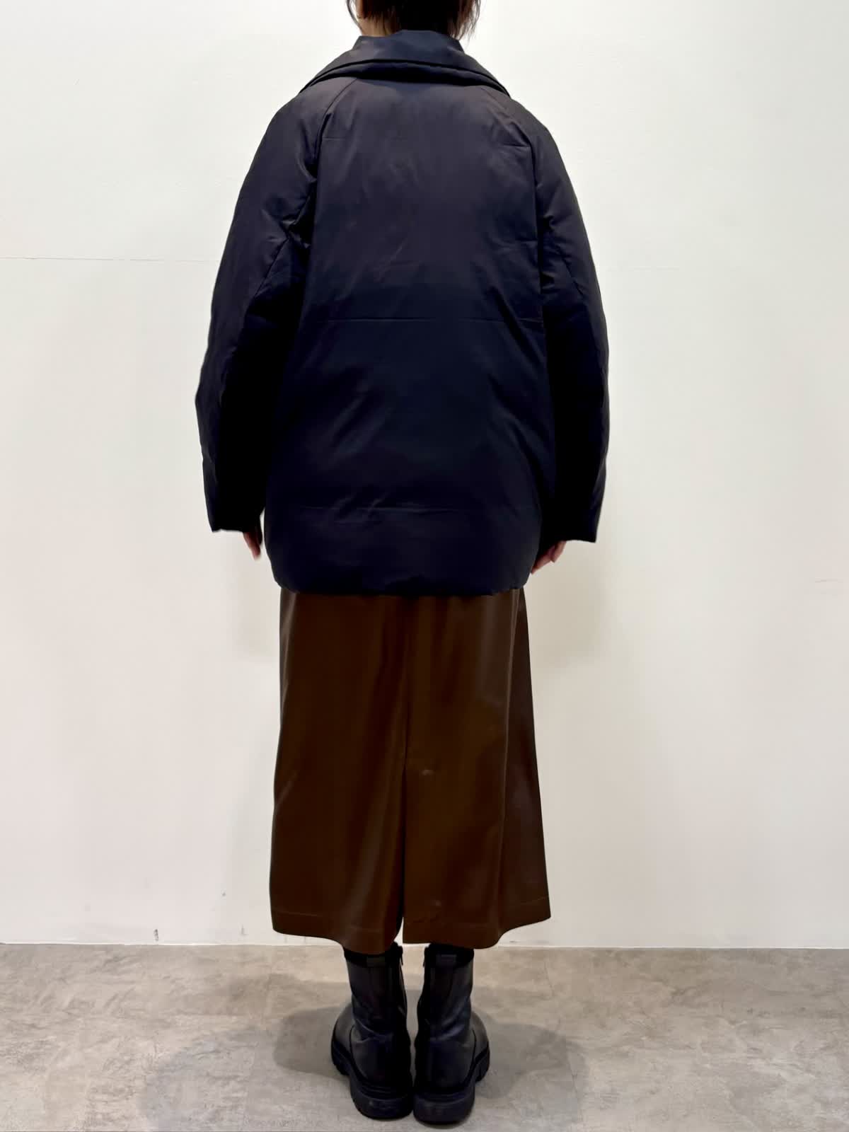 [着用サイズ]アウター:9号 ニット:フリー スカート:9号 [着用カラー]アウター:ブラック ニット:オフホワイト スカート:ブラウン ピーコートダウンは軽くて保温性があり、冬大活躍のアイテムです。 レザー風の光沢感の綺麗なスカートは身体のラインを拾わずシルエットが綺麗です。スパンコールの入ったニットをインに入れると華やかな印象です。