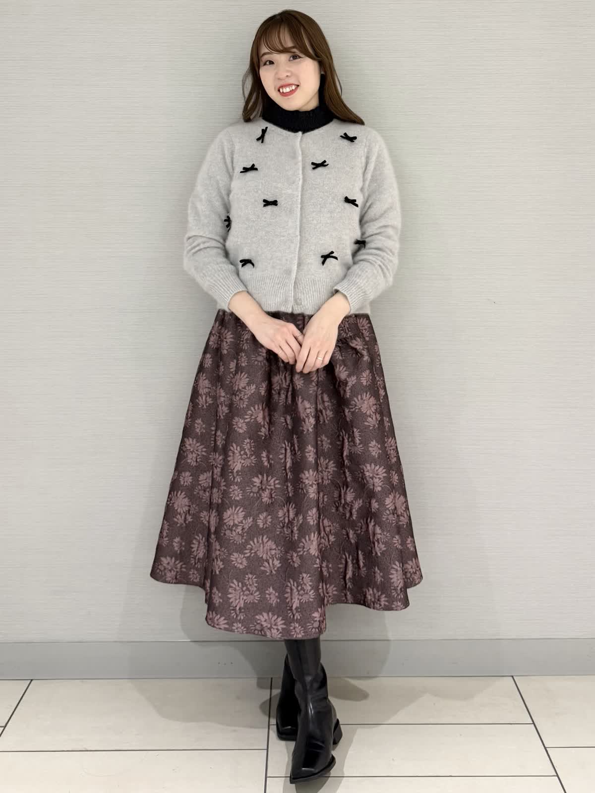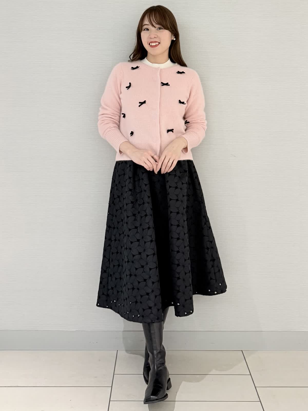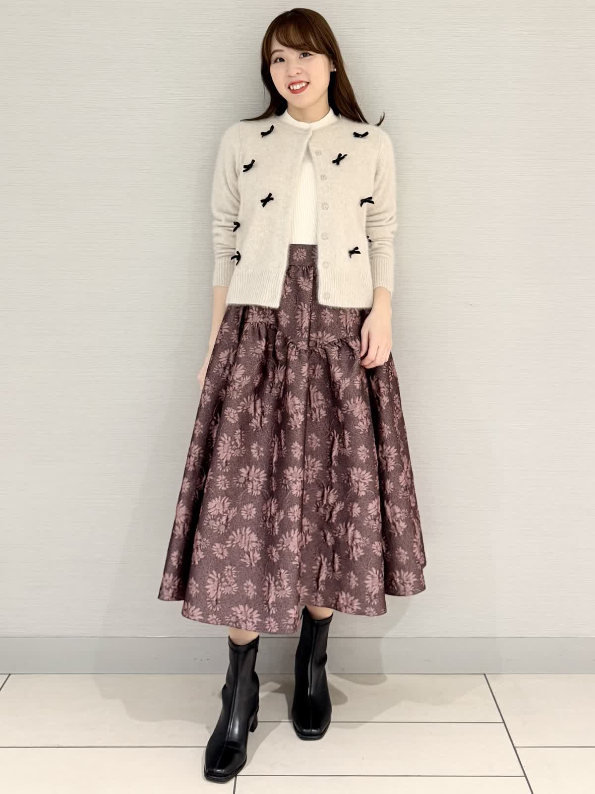 【着用サイズ/カラー】カーディガン:9号/グレーブラウス:9号/ネイビースカート:9号/ピンク《休日に着たいリボン付きカーディガンのコーディネートです。カーディガンのインナーにブラウスを合わせると防寒になり寒い日におすすめです!カーディガンの素材はフォックスにシルク混で滑らかでとても着心地がよいです。スカートはブラウスなどと合わせると華やかな雰囲気になり雰囲気ががらりとかわる1着です。》【サイズ感】どれもいつものサイズでちょうどよかったです。