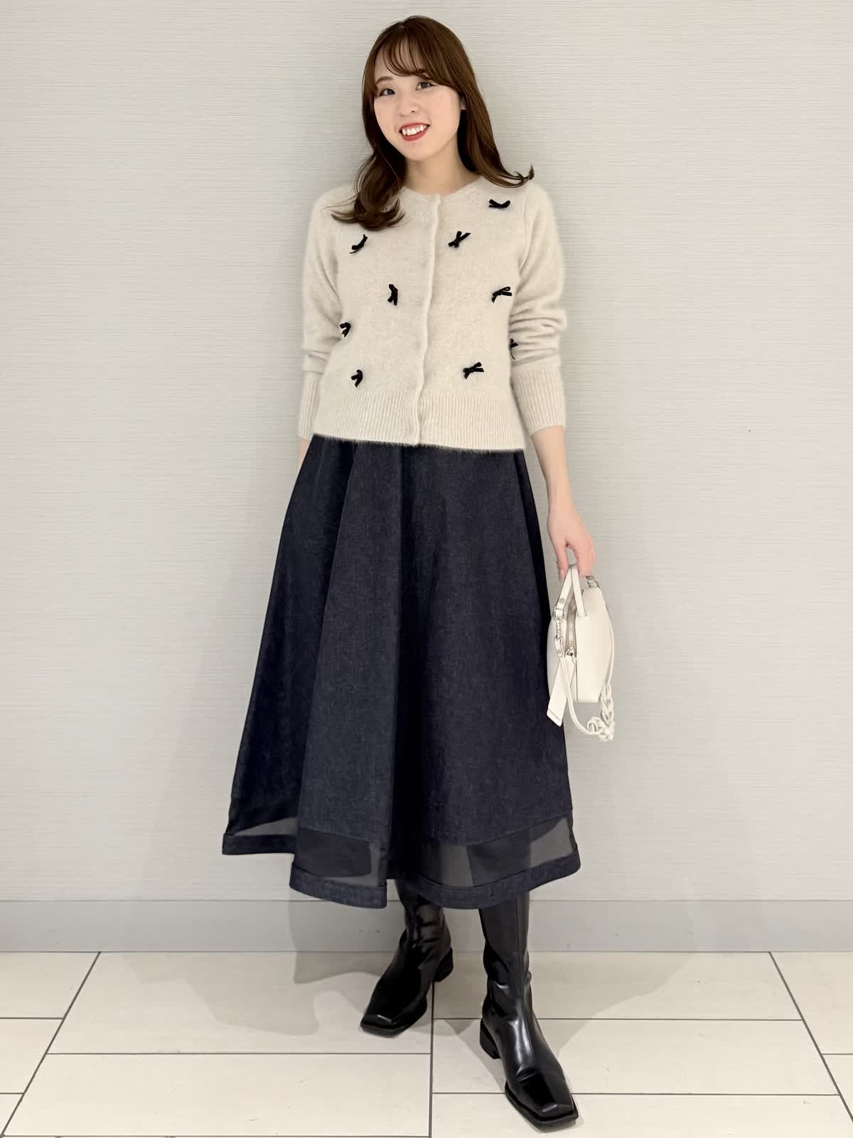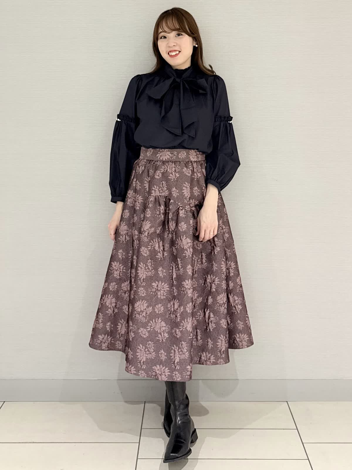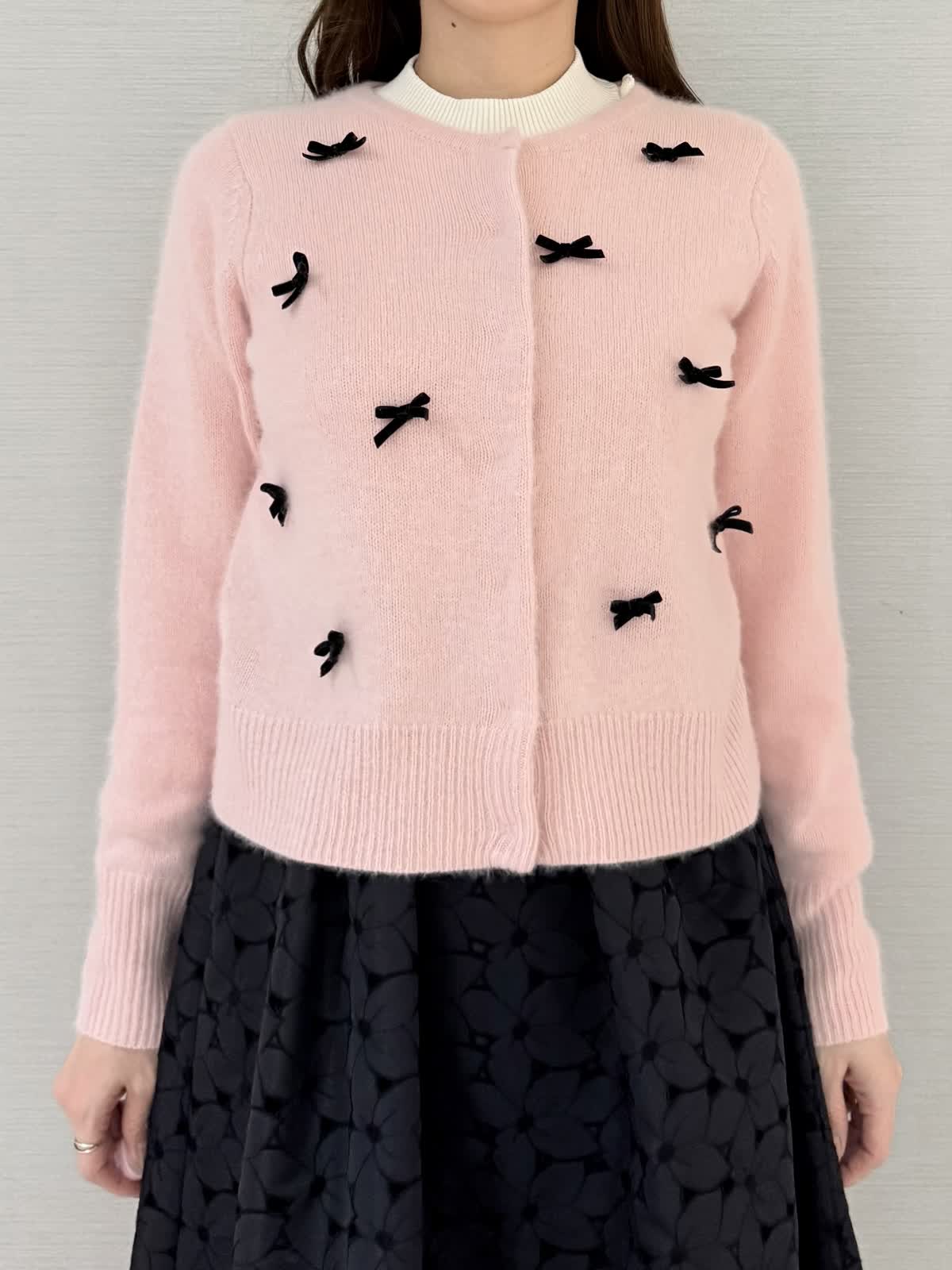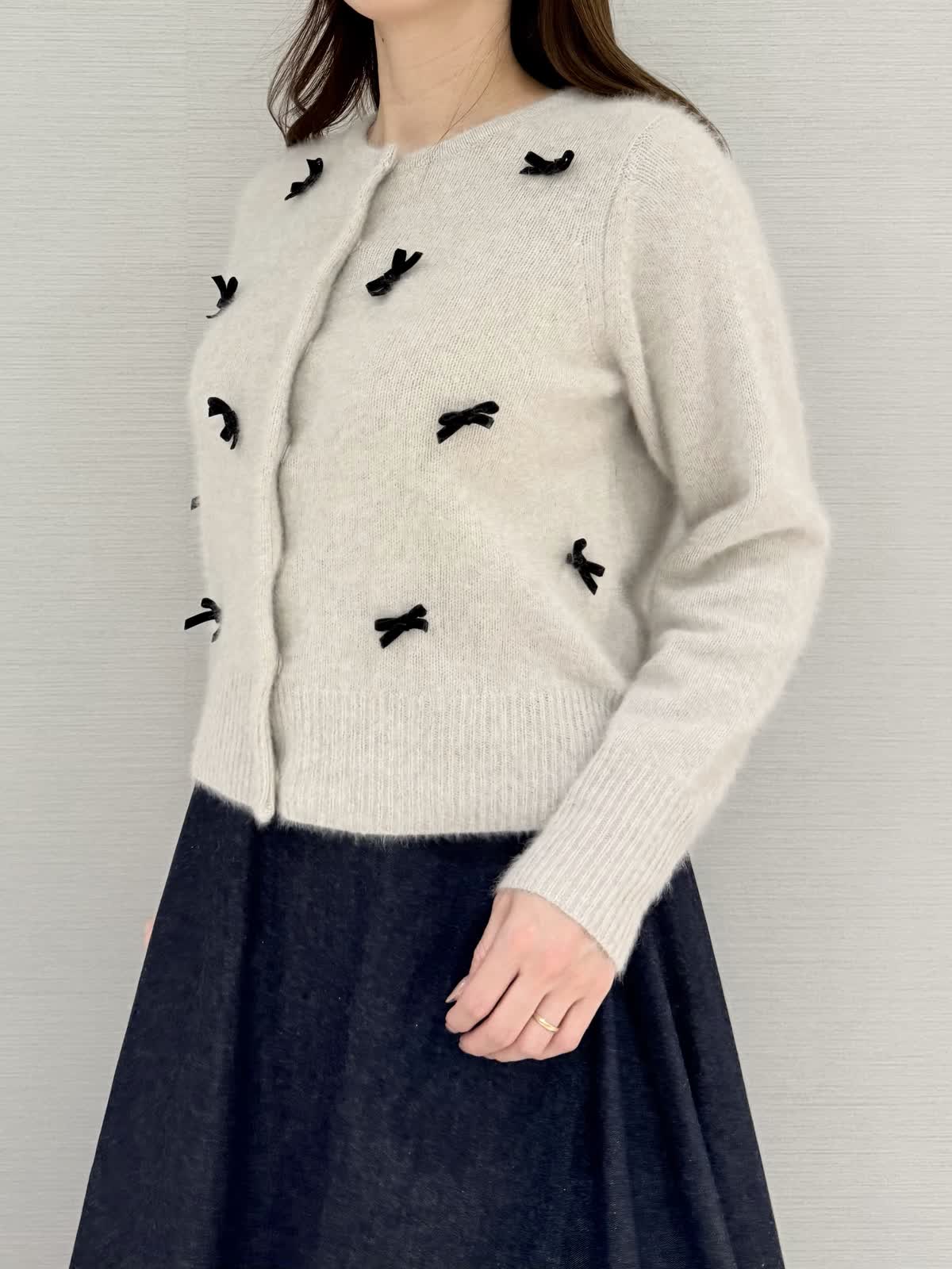 【着用サイズ/カラー】カーディガン:9号/グレーブラウス:9号/ネイビースカート:9号/ピンク《休日に着たいリボン付きカーディガンのコーディネートです。カーディガンのインナーにブラウスを合わせると防寒になり寒い日におすすめです!カーディガンの素材はフォックスにシルク混で滑らかでとても着心地がよいです。スカートはブラウスなどと合わせると華やかな雰囲気になり雰囲気ががらりとかわる1着です。》【サイズ感】どれもいつものサイズでちょうどよかったです。