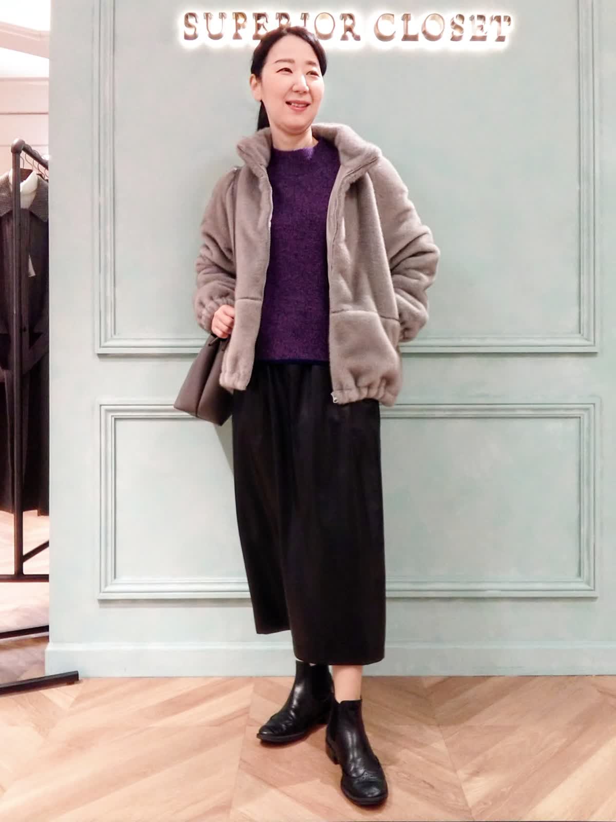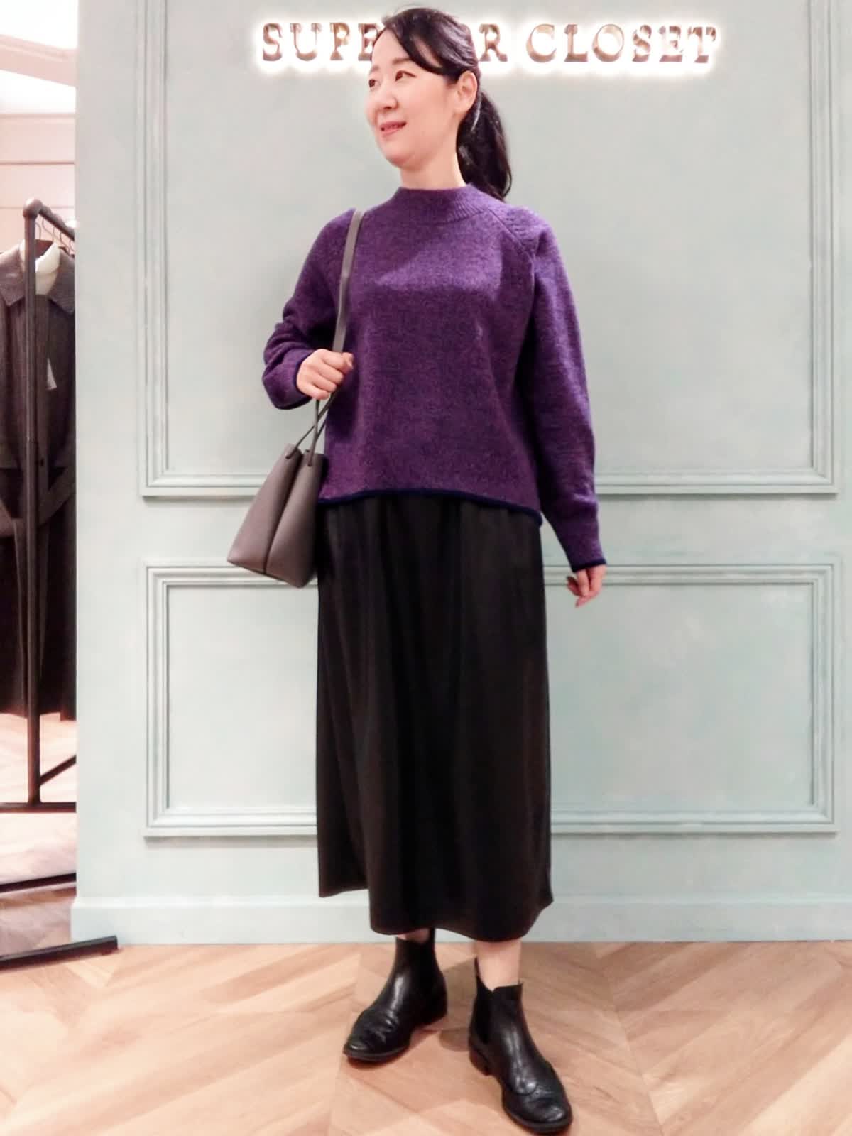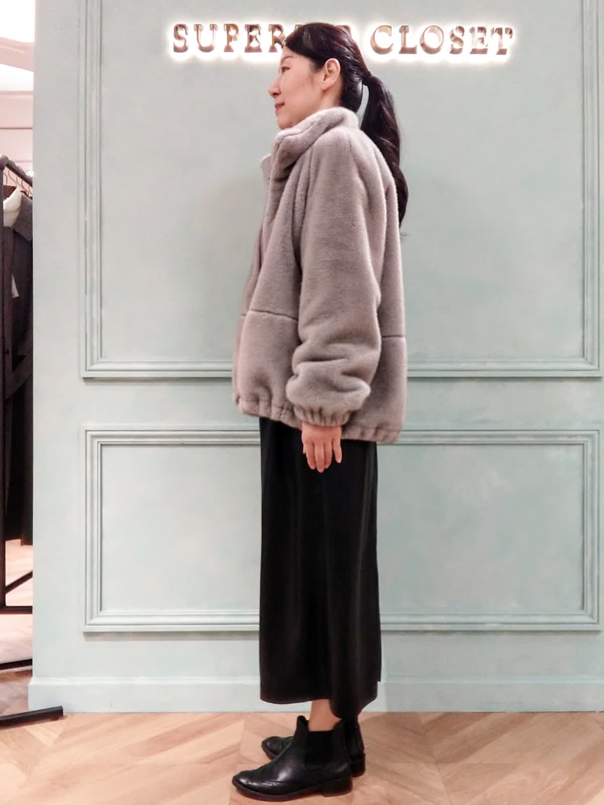 【着用サイズ】ブルゾン:フリー、ニット:フリー、スカート:9号 【着用カラー】ブルゾン:グレー、ニット:パープル、スカート:ブラック 忘年会スタイル。年末の忘年会はラクな着心地できれいに見えるコーディネートがおすすめ。トレンドのファーブルゾンはふわふわで暖かく軽い着心地。スタンドカラーで首もとまで暖かく、マフラー要らずです。ハイネックニットはメランジの大人パープル。青みがかった落ち着いた色合いで袖口と裾が配色カラーでさりげなくオシャレ。スカートはウエスト後ろゴム仕様でシワになりにくくラクな履き心地。レザー調の艶感があり、華やかで楽しい忘年会にぴったりです。