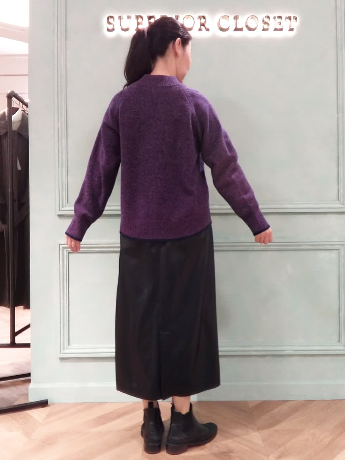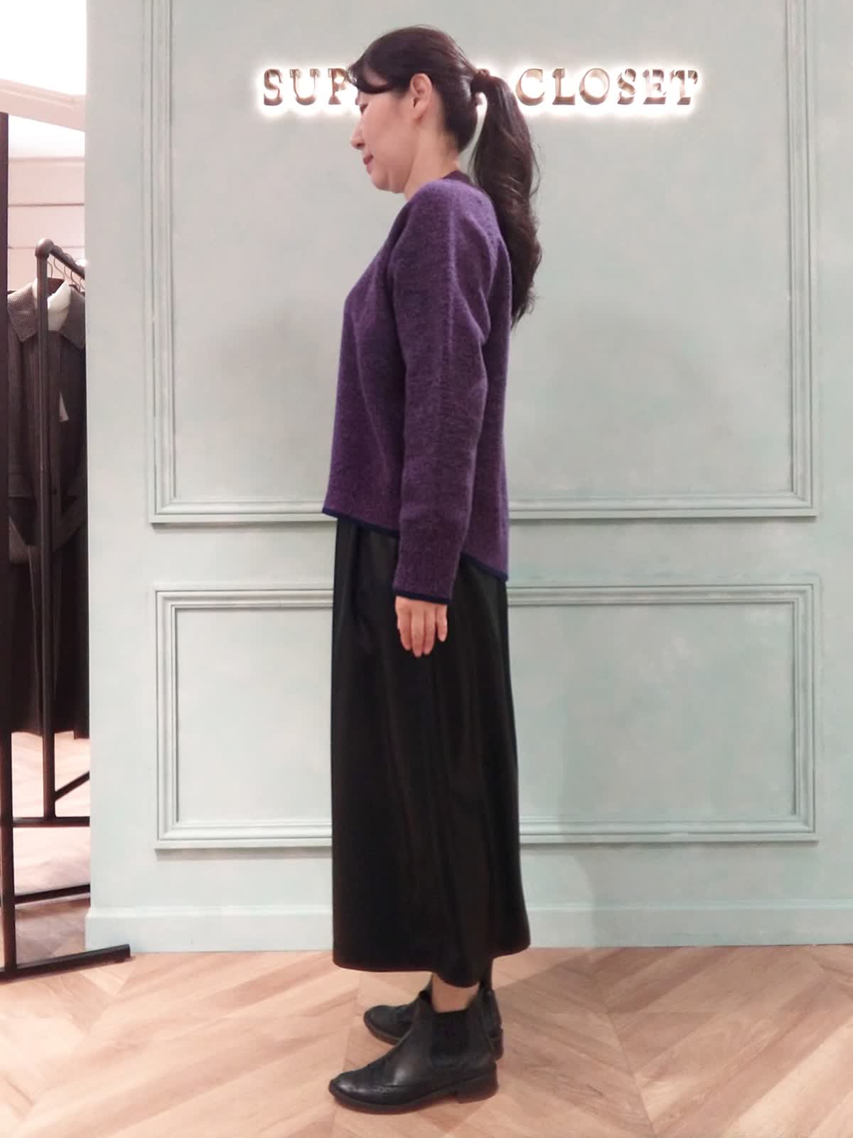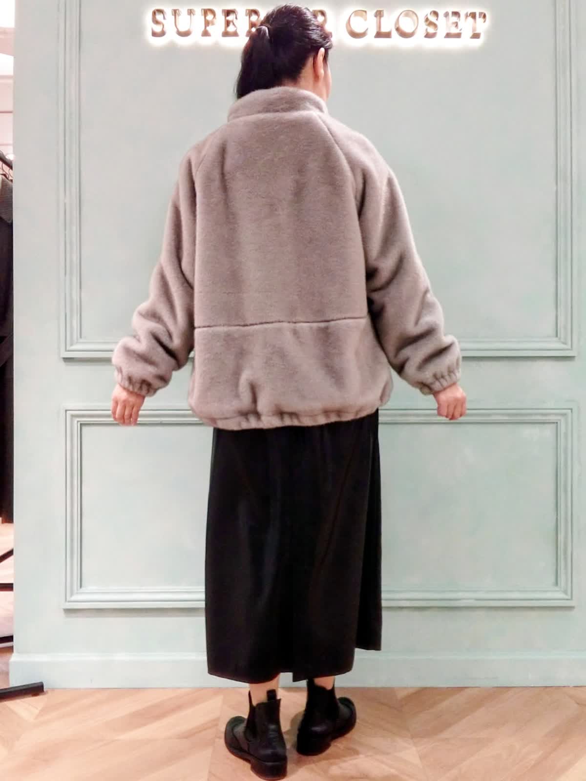 【着用サイズ】ブルゾン:フリー、ニット:フリー、スカート:9号 【着用カラー】ブルゾン:グレー、ニット:パープル、スカート:ブラック 忘年会スタイル。年末の忘年会はラクな着心地できれいに見えるコーディネートがおすすめ。トレンドのファーブルゾンはふわふわで暖かく軽い着心地。スタンドカラーで首もとまで暖かく、マフラー要らずです。ハイネックニットはメランジの大人パープル。青みがかった落ち着いた色合いで袖口と裾が配色カラーでさりげなくオシャレ。スカートはウエスト後ろゴム仕様でシワになりにくくラクな履き心地。レザー調の艶感があり、華やかで楽しい忘年会にぴったりです。