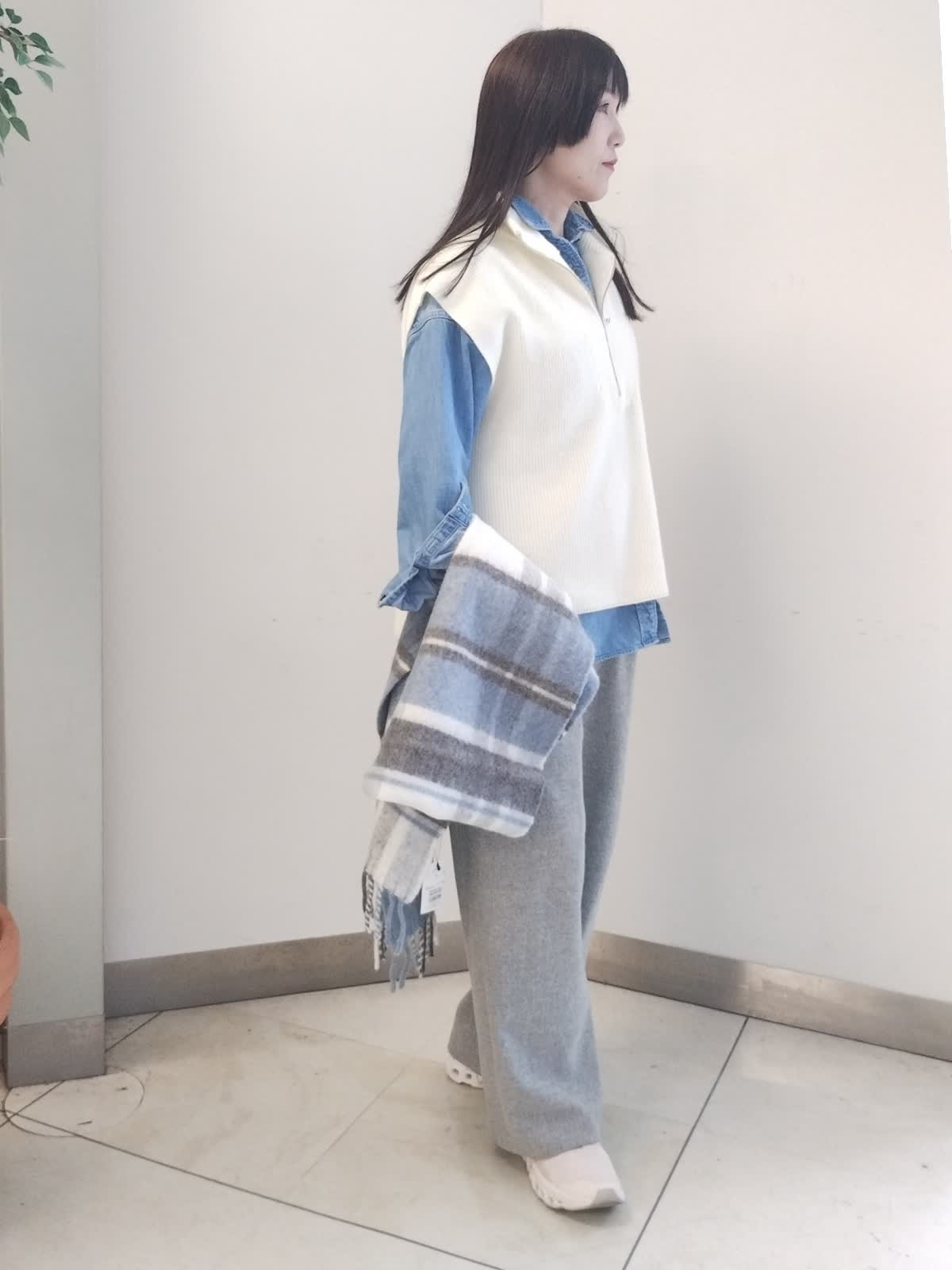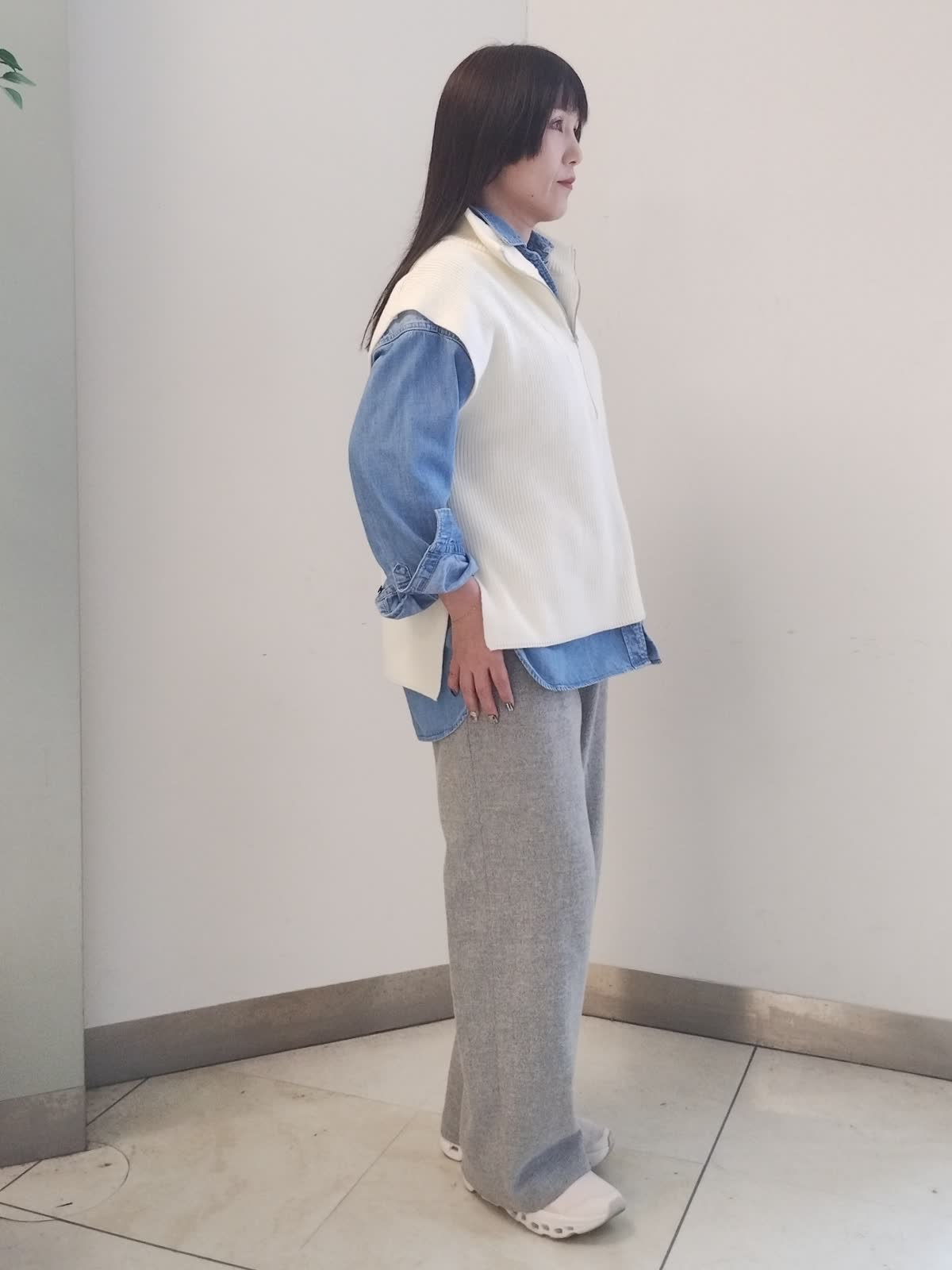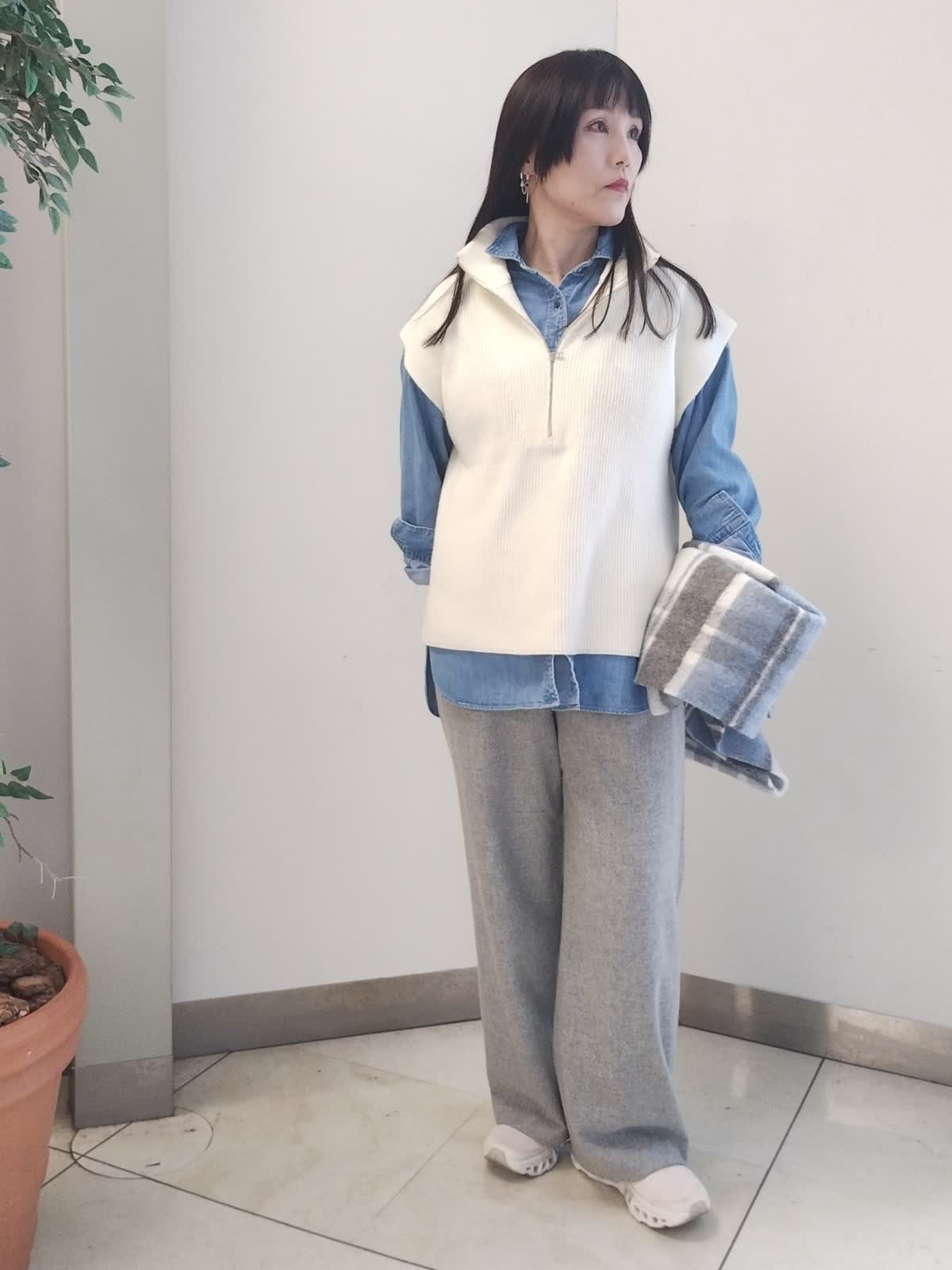 【着用サイズ】ニットベスト オフホワイト:フリー デニムシャツ ブルー:フリー パンツ グレー:9号 アウターをスマートに着こなすコーデ。 羽織にも出来る中肉厚のデニムシャツはニット程嵩張らず、程良い保温性もあり頼れるアイテムです。ジップアップがお洒落なニットベストはぐっとあげてハイネックにするとシャープな印象に。開けるとこなれた印象に。