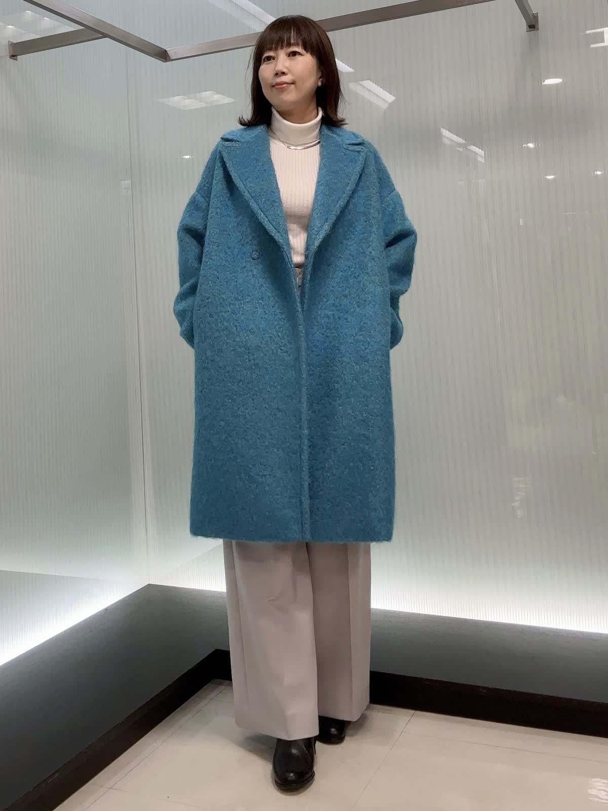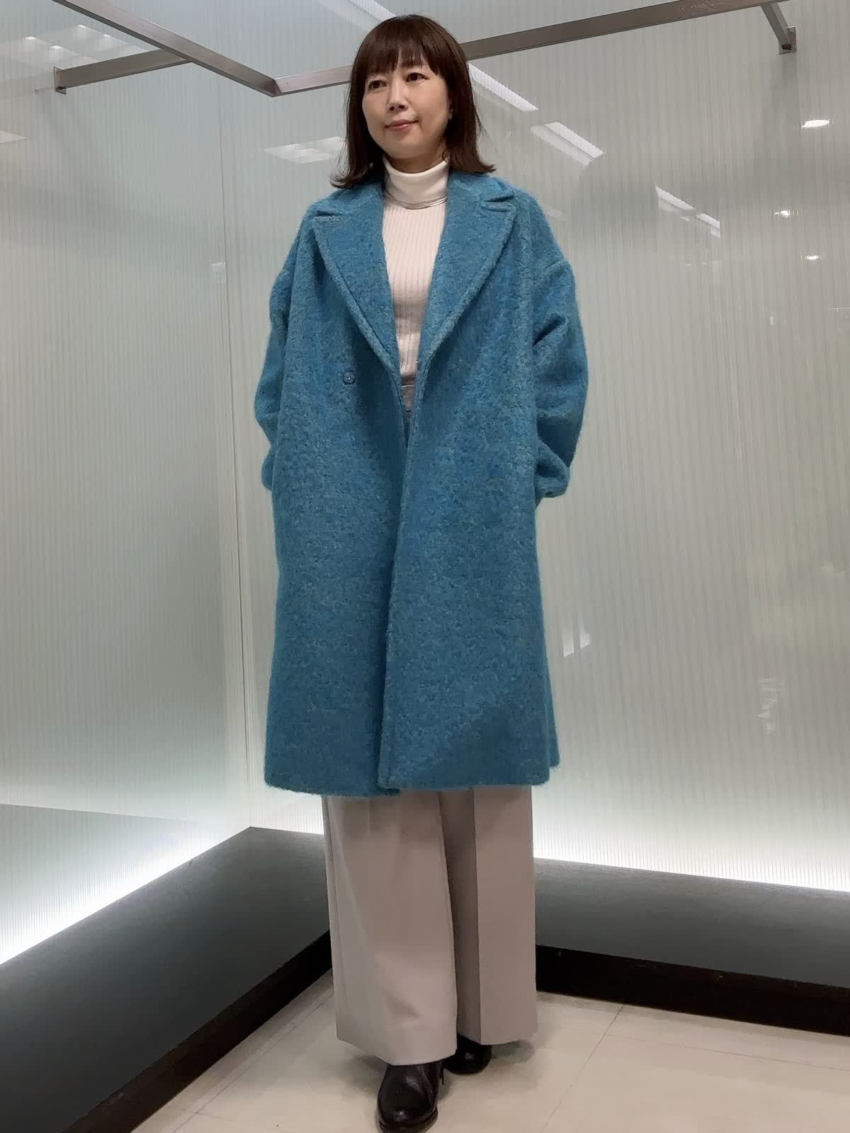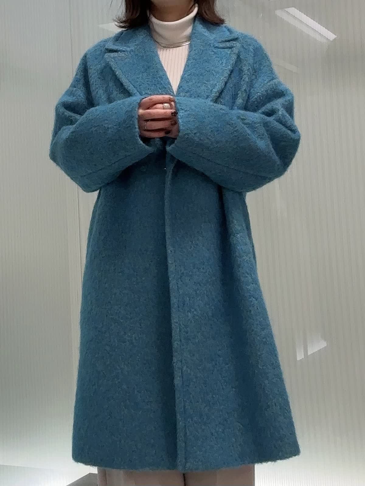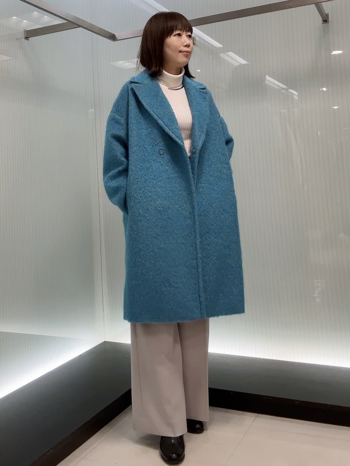【着用サイズ】コート:フリー ニット、パンツ:9号 【着用カラー】コート:ブルー モヘアの風合いと奥行きのあるカラーが印象的なコート素材です。 ストレスフリーな着心地です♪