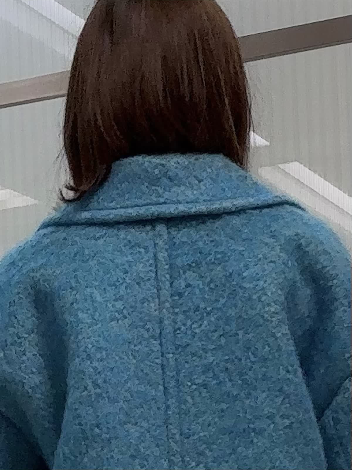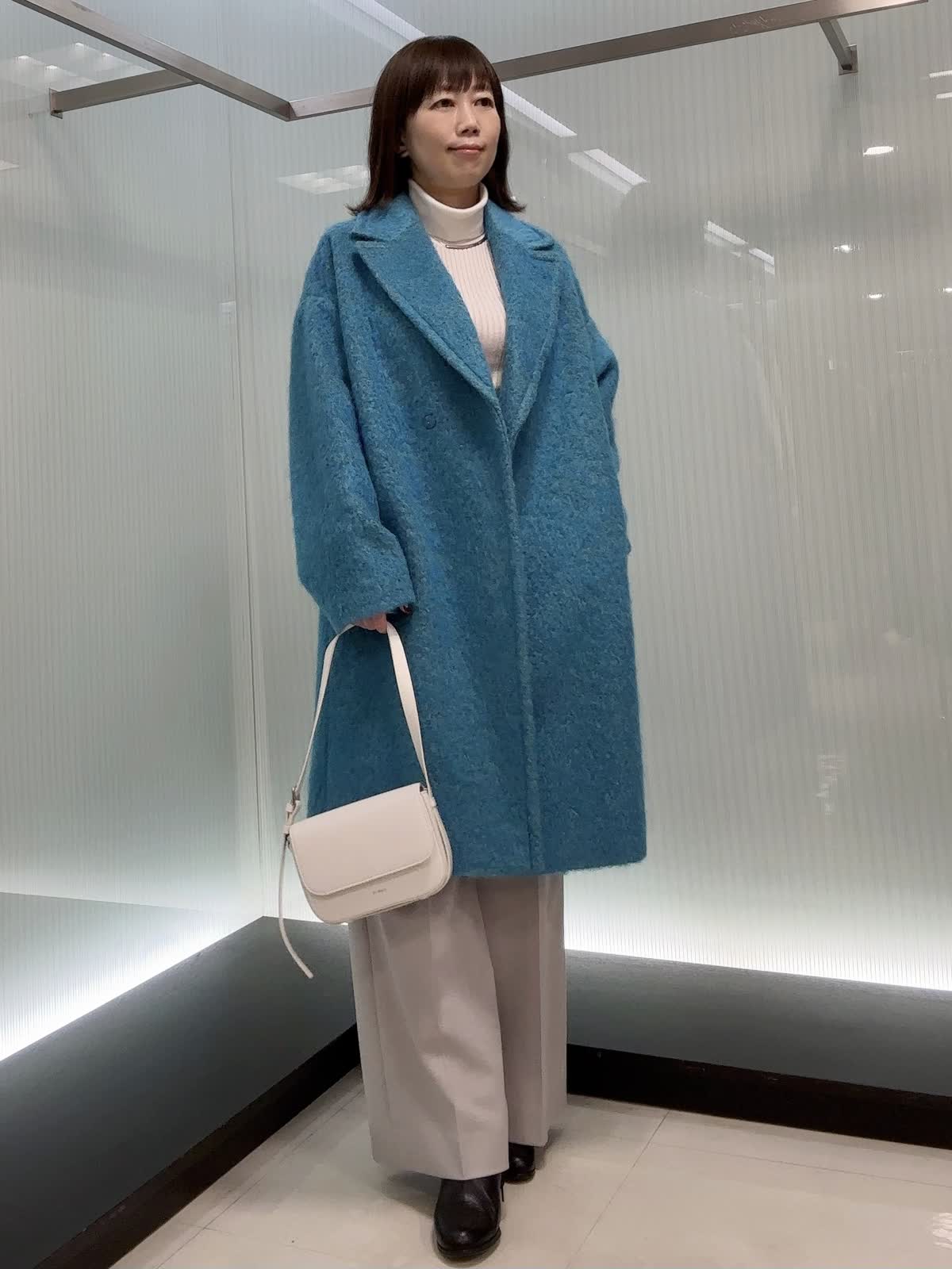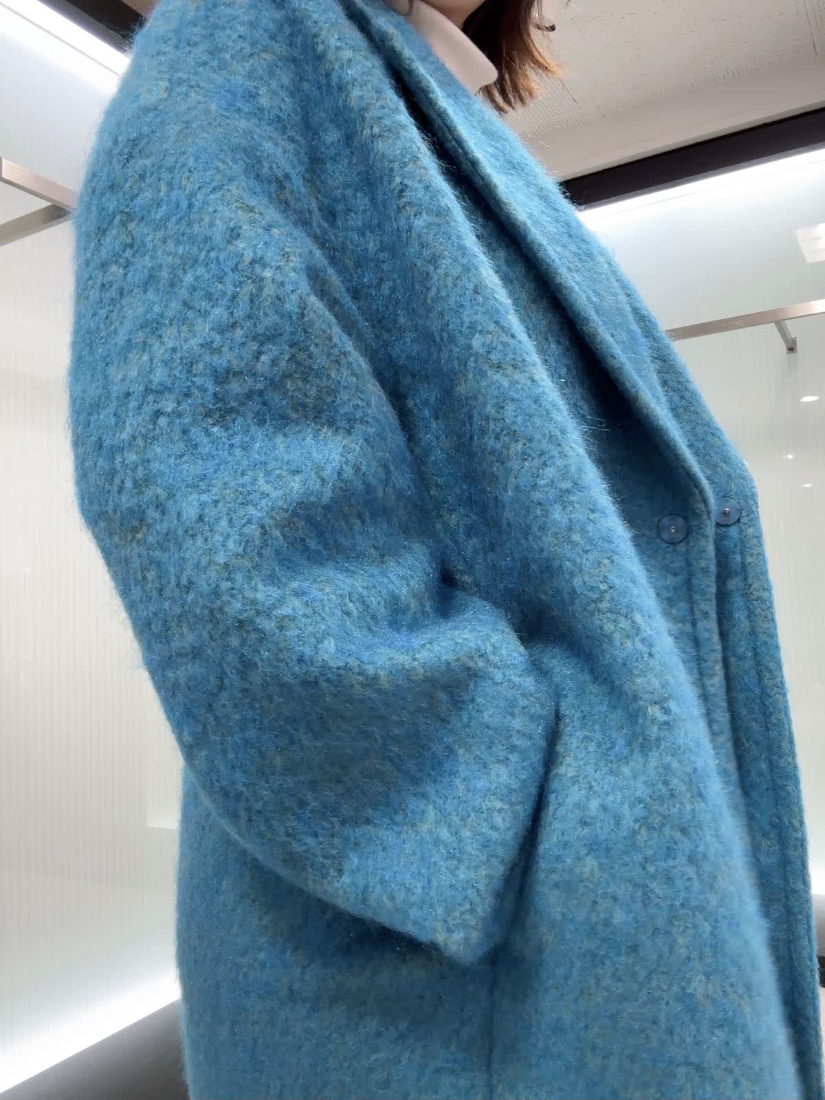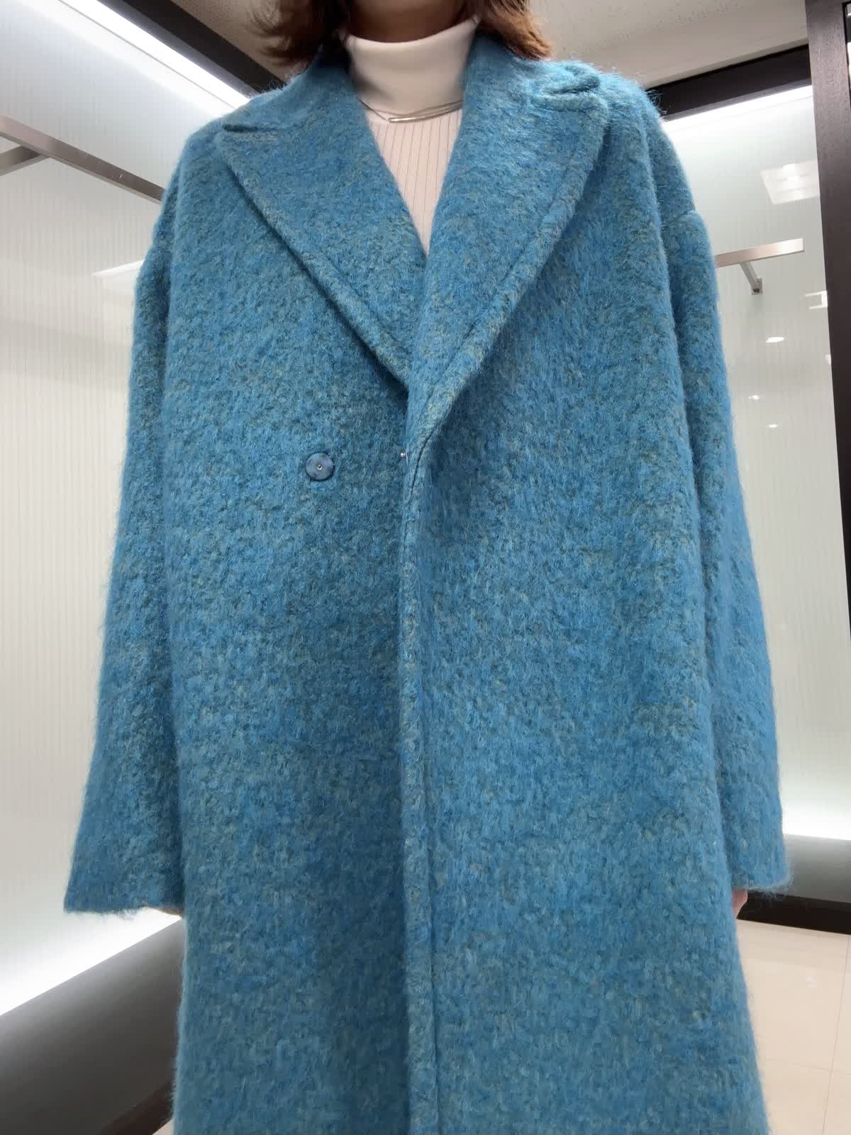 【着用サイズ】コート:フリー ニット、パンツ:9号 【着用カラー】コート:ブルー モヘアの風合いと奥行きのあるカラーが印象的なコート素材です。 ストレスフリーな着心地です♪