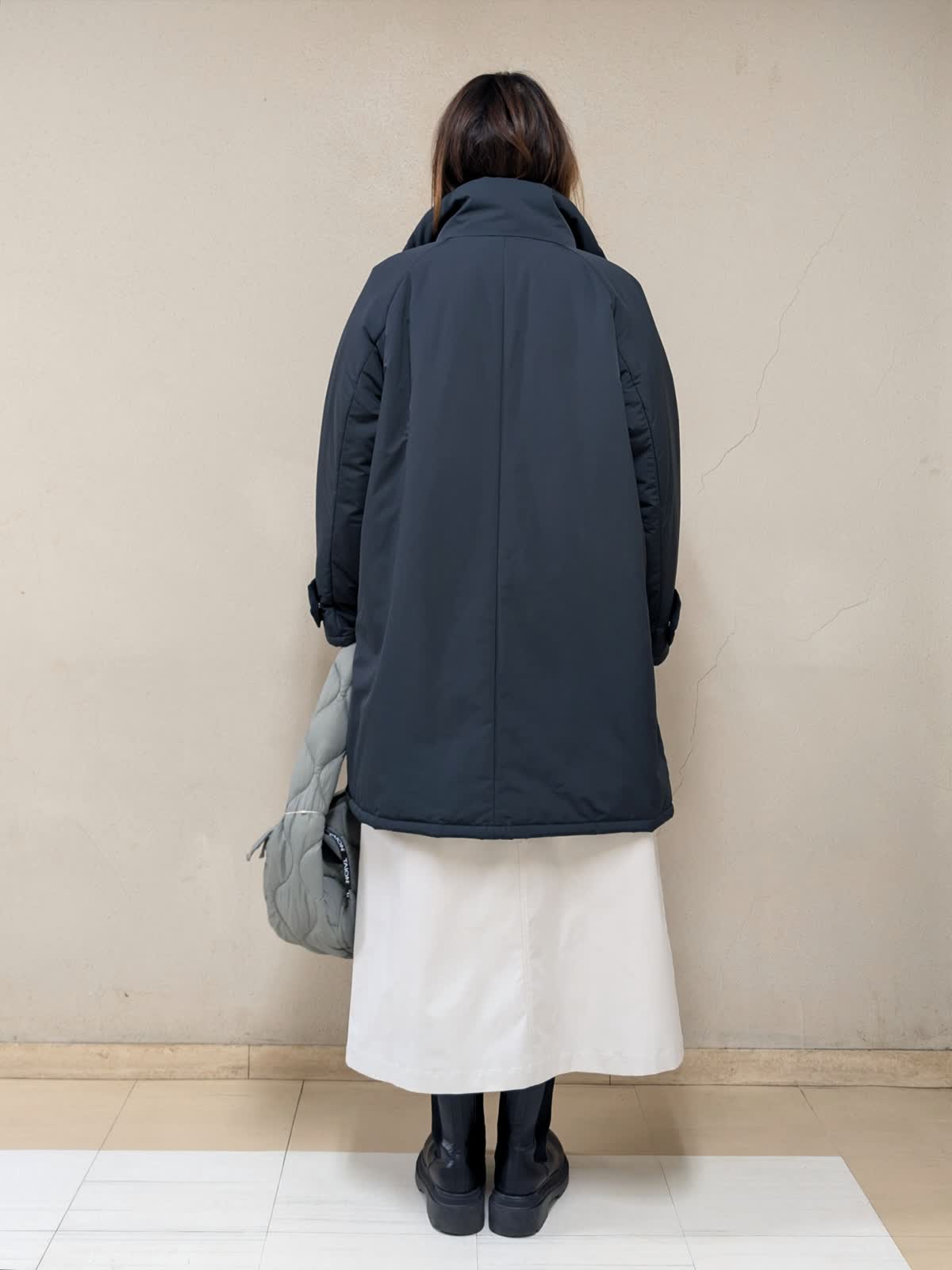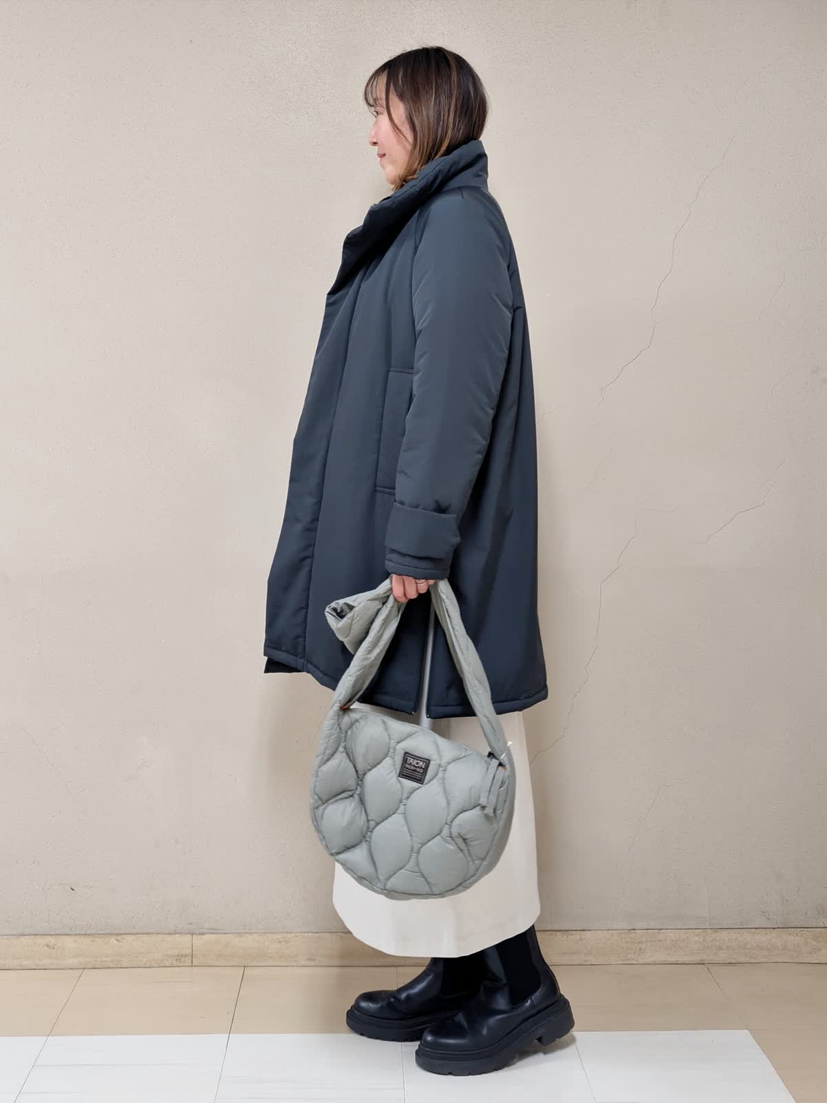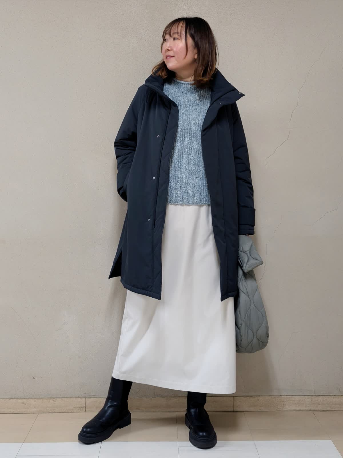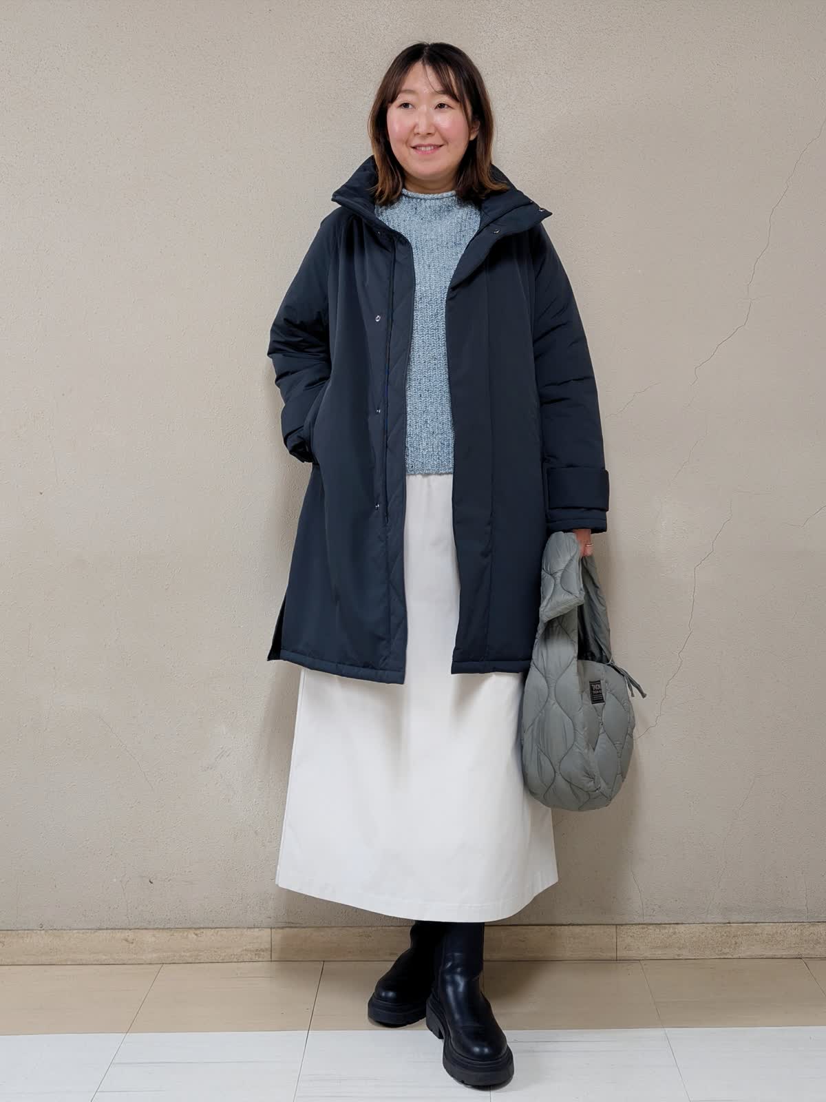 【着用サイズ】コート、ニット:フリー スカート:11号【着用カラー】コート:ブラック ニット:ブルーグリーン スカート:ベージュ バッグ:グリーン 年末年始の帰省にオススメのコーディネートです。中綿のコートは軽くて暖かいです。スタンドカラー&シームレスで、シンプルで着回ししやすいデザイン。両サイド裾にファスナーが付いているのが機能性もあり見た目にもオシャレです。インナーにはカラーネップのニットを合わせてカジュアルさと華やかさをプラスしました。スカートはつるっとした生地で程よいハリ感があります。ウエストが総ゴムなので、穿き心地も楽です。TAIONのバッグは中もたくさん入るのでオススメです。