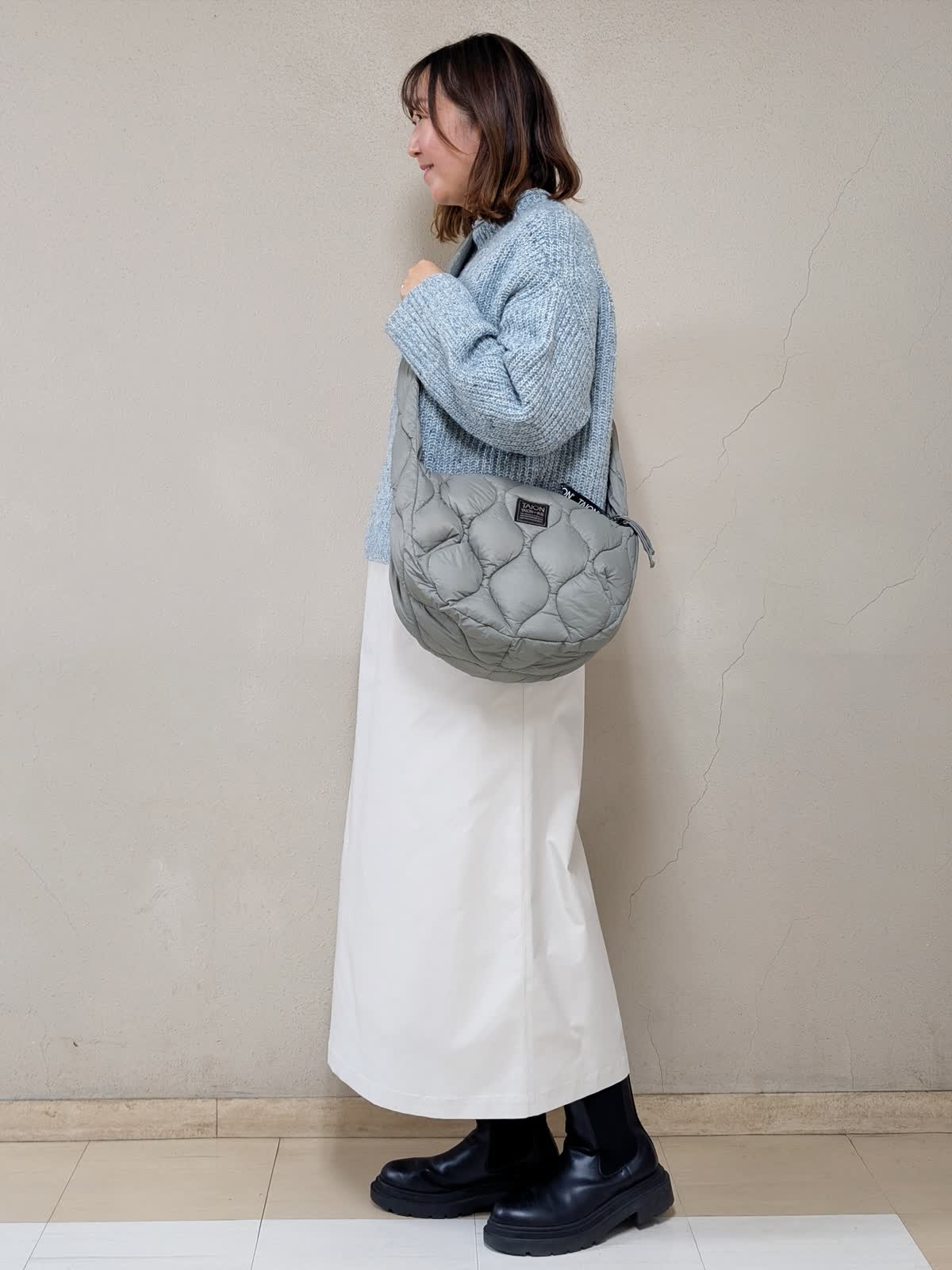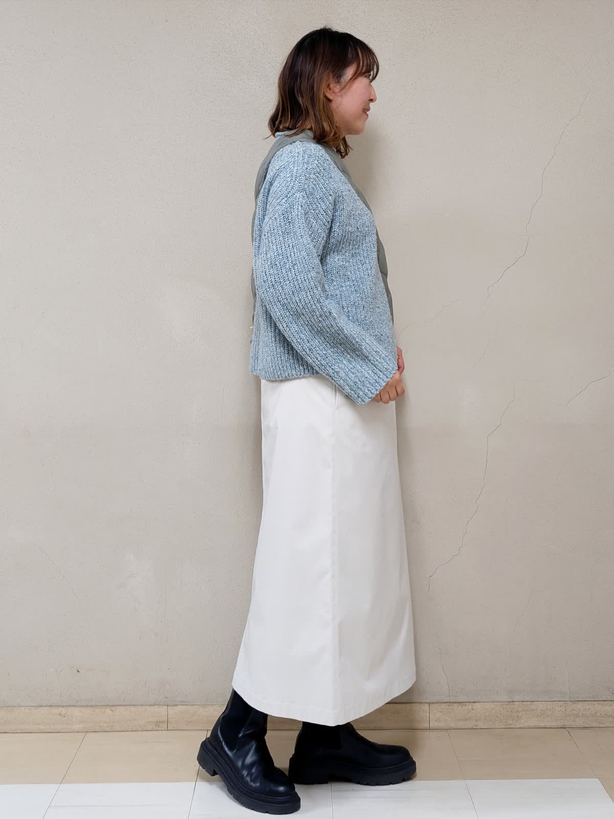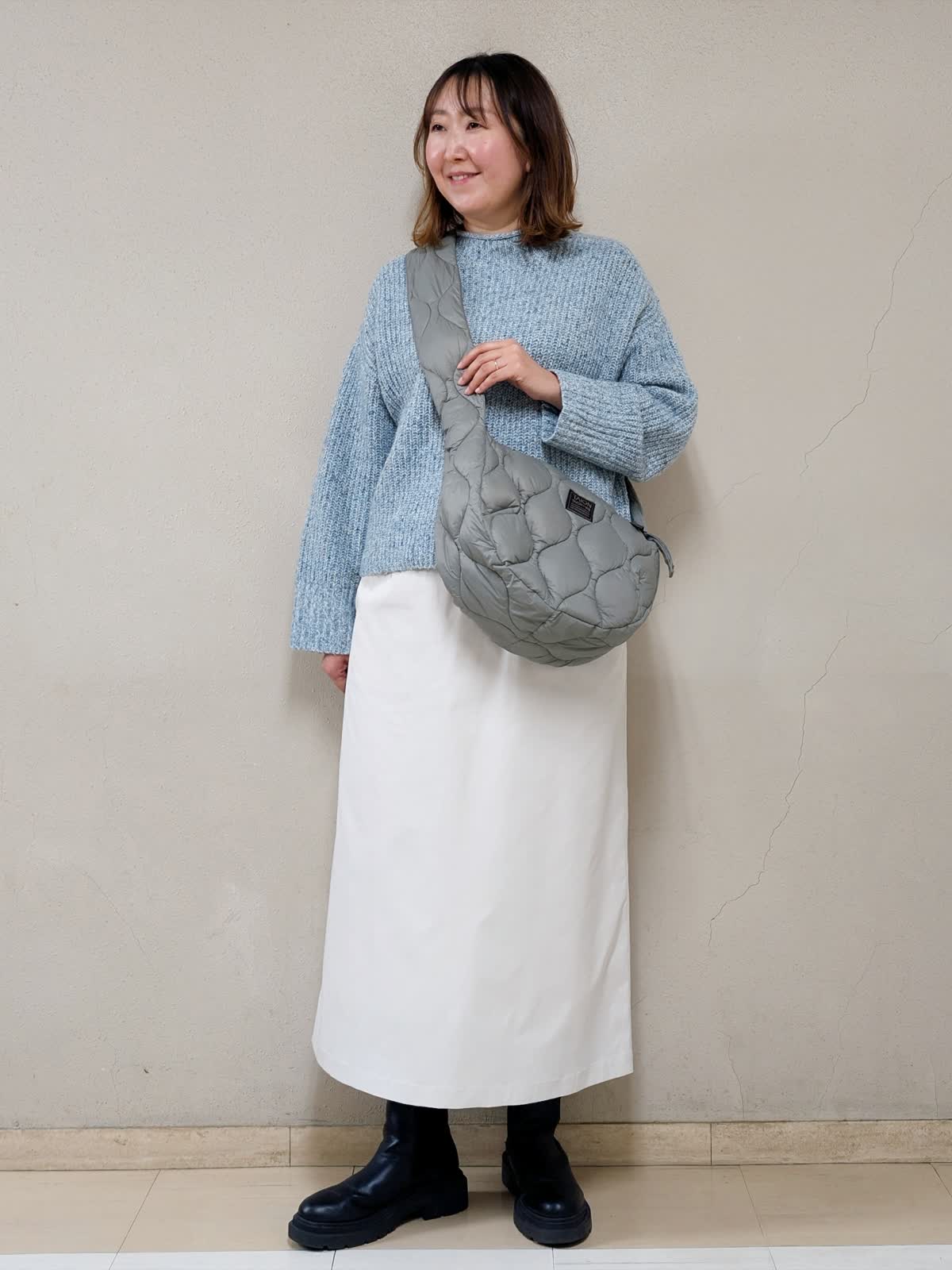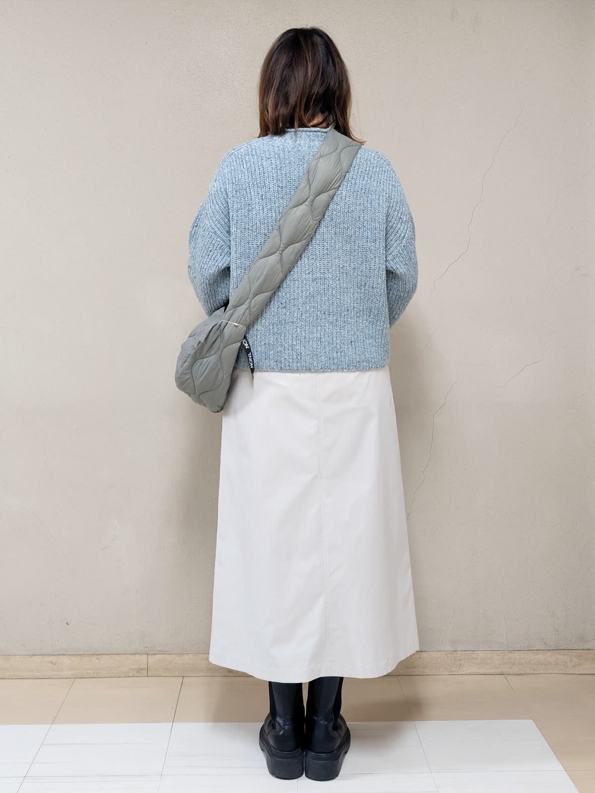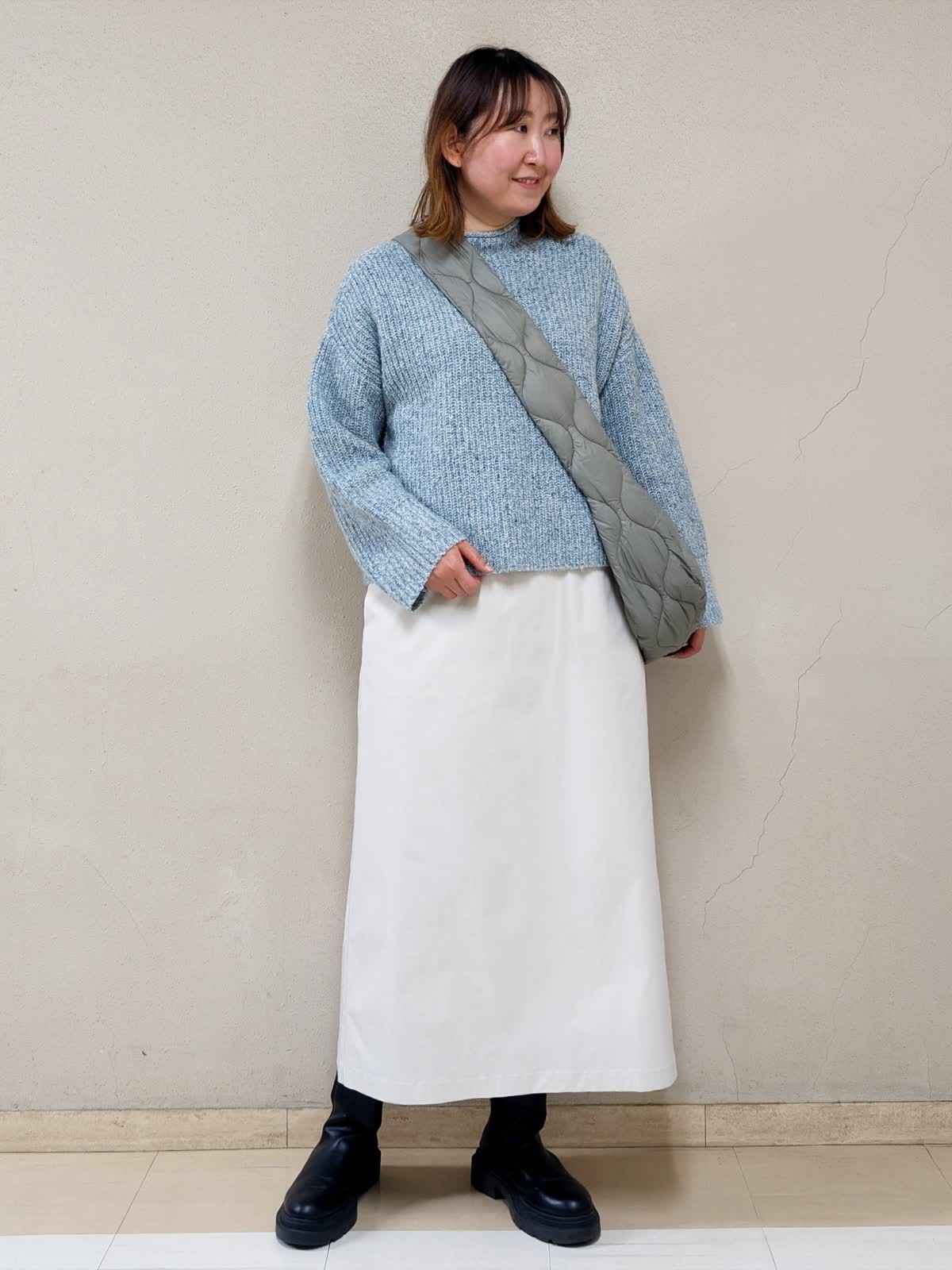 【着用サイズ】コート、ニット:フリー スカート:11号【着用カラー】コート:ブラック ニット:ブルーグリーン スカート:ベージュ バッグ:グリーン 年末年始の帰省にオススメのコーディネートです。中綿のコートは軽くて暖かいです。スタンドカラー&シームレスで、シンプルで着回ししやすいデザイン。両サイド裾にファスナーが付いているのが機能性もあり見た目にもオシャレです。インナーにはカラーネップのニットを合わせてカジュアルさと華やかさをプラスしました。スカートはつるっとした生地で程よいハリ感があります。ウエストが総ゴムなので、穿き心地も楽です。TAIONのバッグは中もたくさん入るのでオススメです。