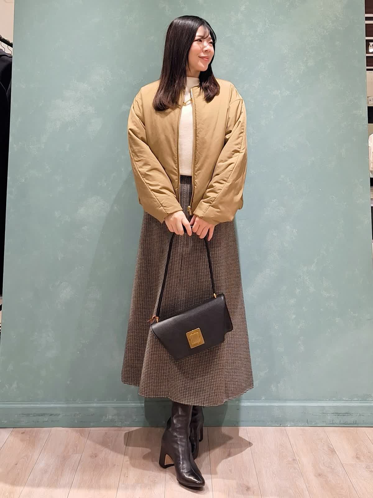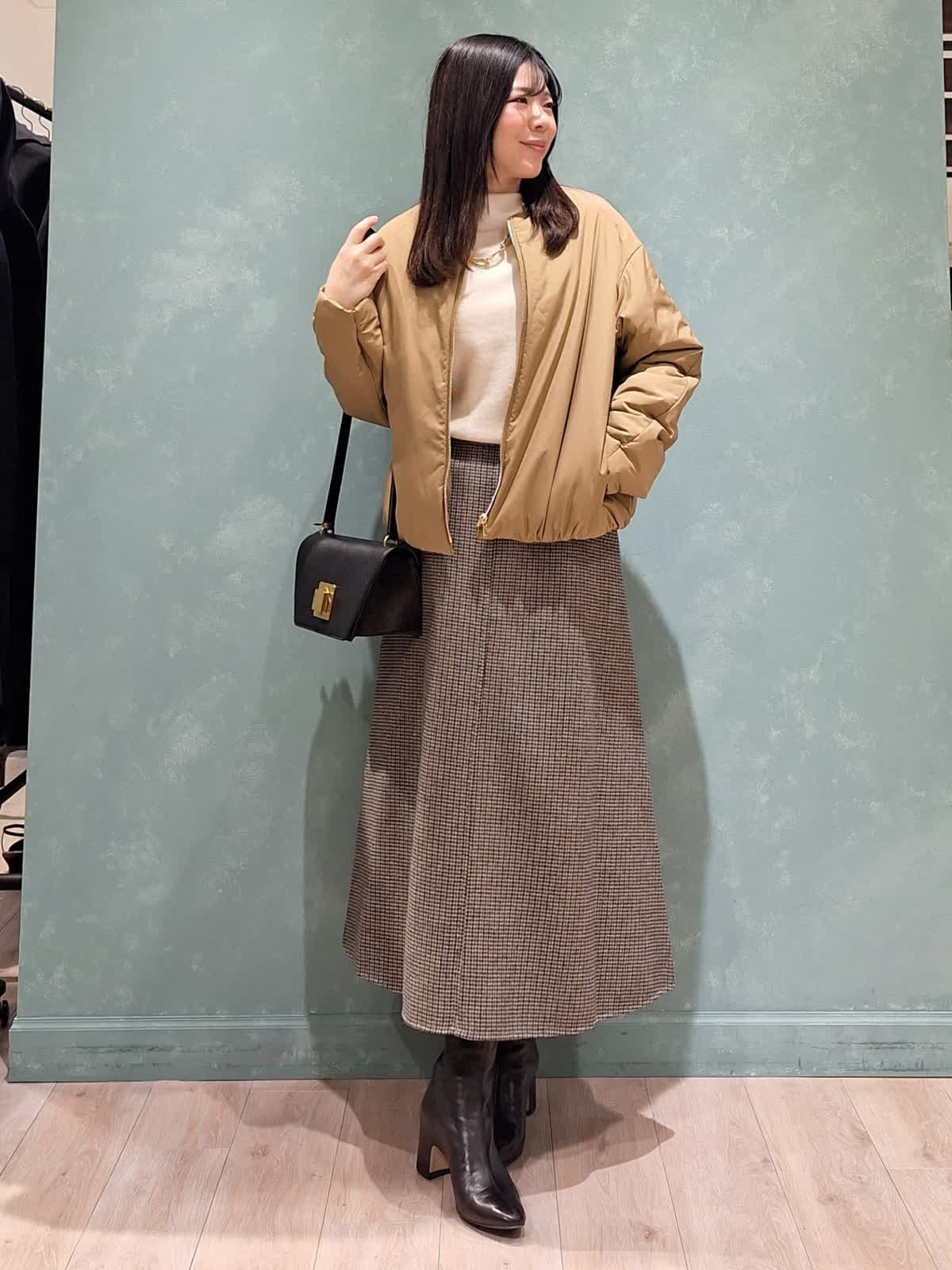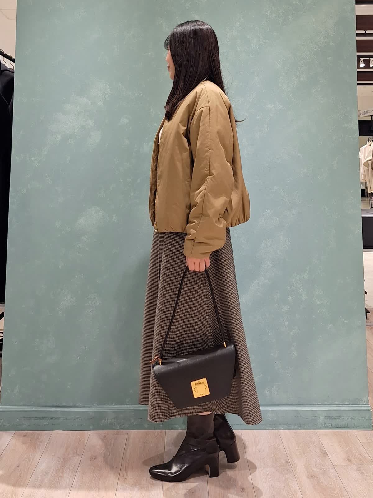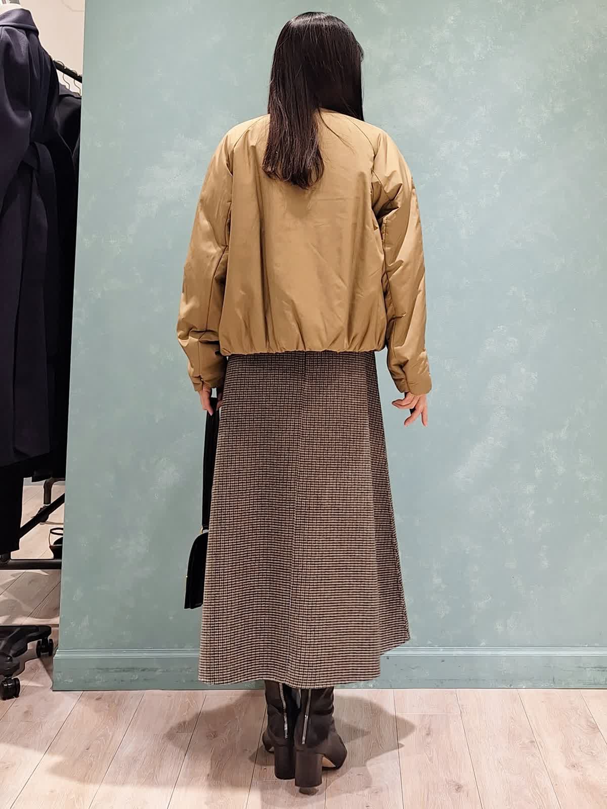 【着用サイズ、カラー】ブルゾン:7号、キャメル ニット:9号、オフホワイト スカート:7号、柄小 フワッと軽くて暖かい中綿ブルゾン。ボリューム感のあるデザインで、裾はグログランゴム付き、袖口は2つボタンでキュっと絞れて冷気も防げます。撥水タイプで機能性もあり◎比較的短めな着丈で、ワイドパンツやワンピース合わせもお勧めです。今回はモックネックニット×フレアスカートに合わせて、フェミニン&カジュアルにコーディネート。デートやお友達とのお出掛けなどお召しいただけます♪