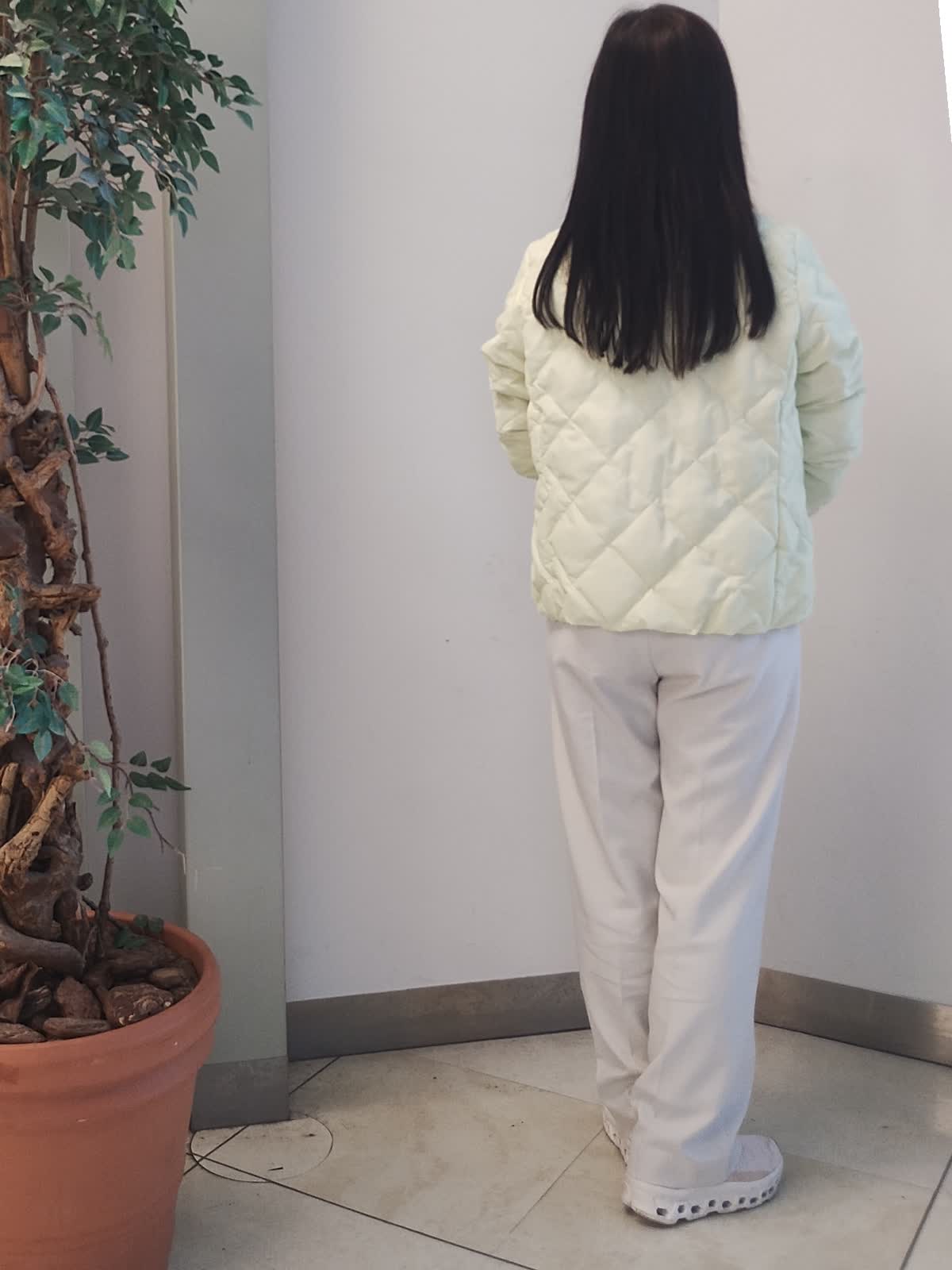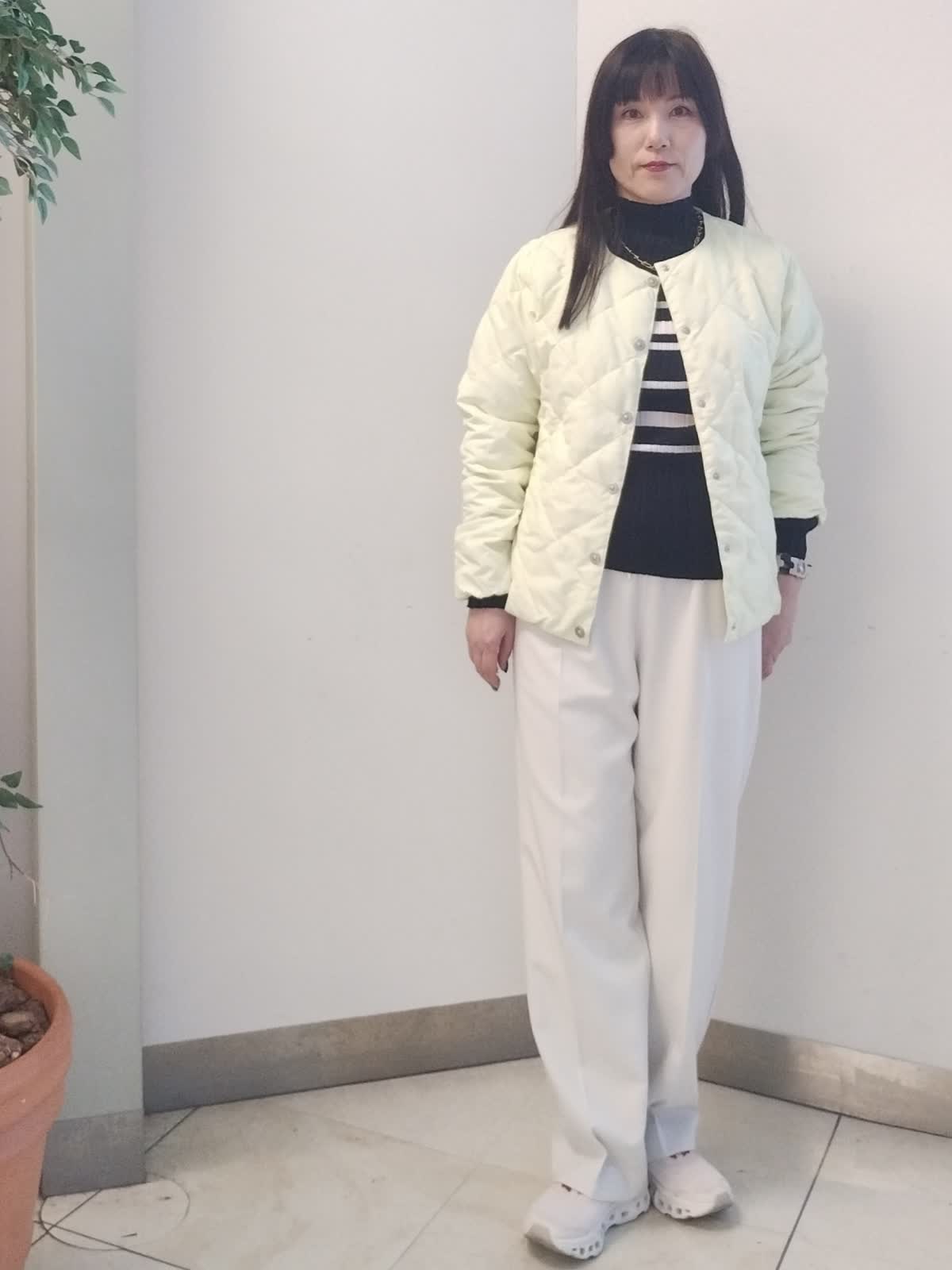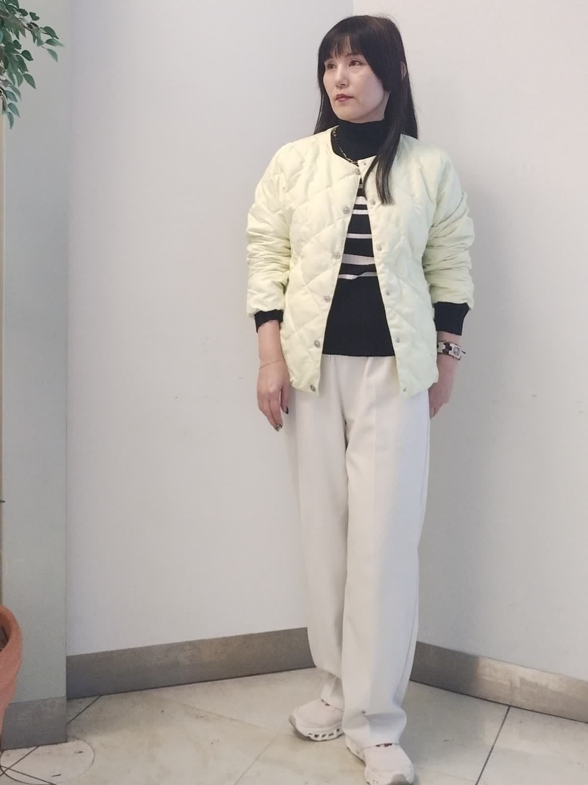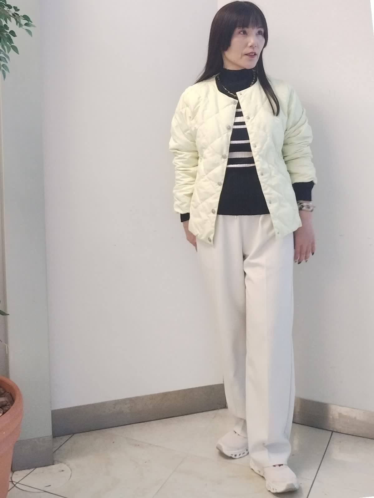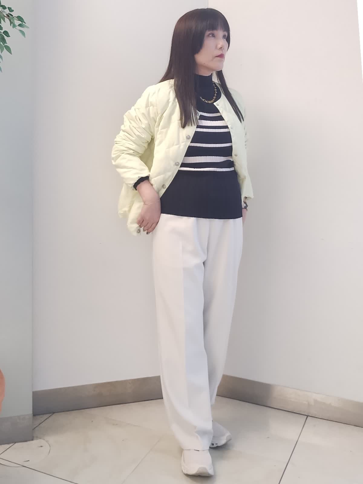 【着用サイズ】ダウン ジャケット イエロー:9号 ニット ボーダー:9号 パンツ オフホワイト:9号 お車での移動の方の軽アウターコーデ。 軽くて持ち運びに便利なダウンジャケットは、太陽光を取り入れ発熱し、生地を温める優れた機能がついており、抜群野保温効果があります。モコモコせずスタイリッシュにコーデが決まります。 こちらのダウンジャケットの上に、薄手のコートをはおると、真冬にもお使いいただけます。