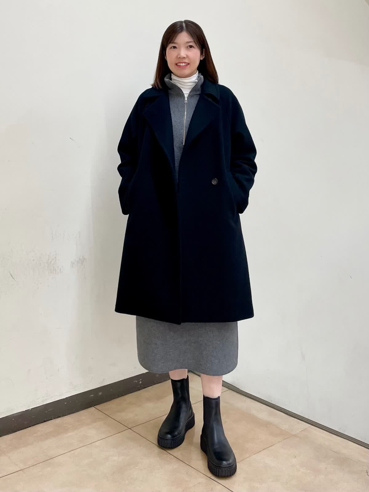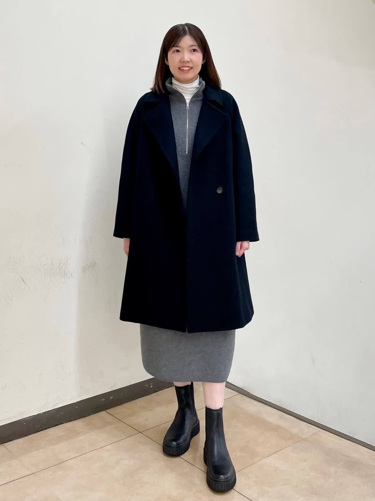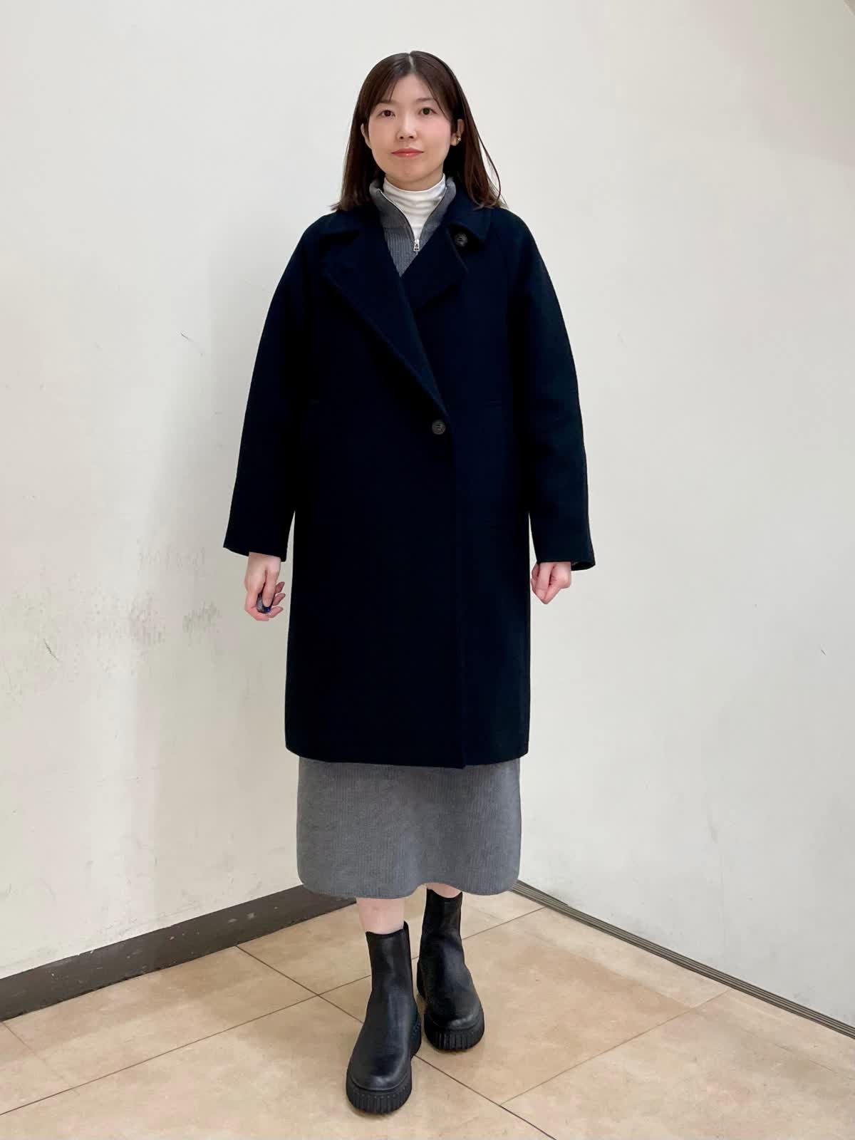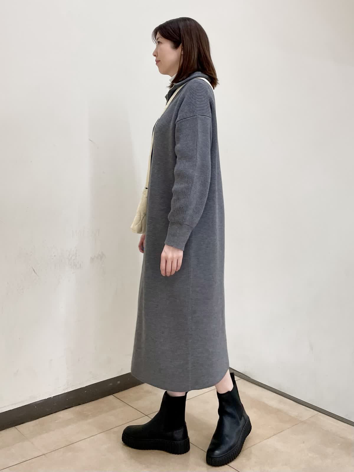 【着用サイズ】コート:フリー ワンピース:フリー カットソー:9号 ステンカラーコートは襟元がタブ付きでスタンド、ステン、チェスターなど、3パターン楽しめるコートになっています。