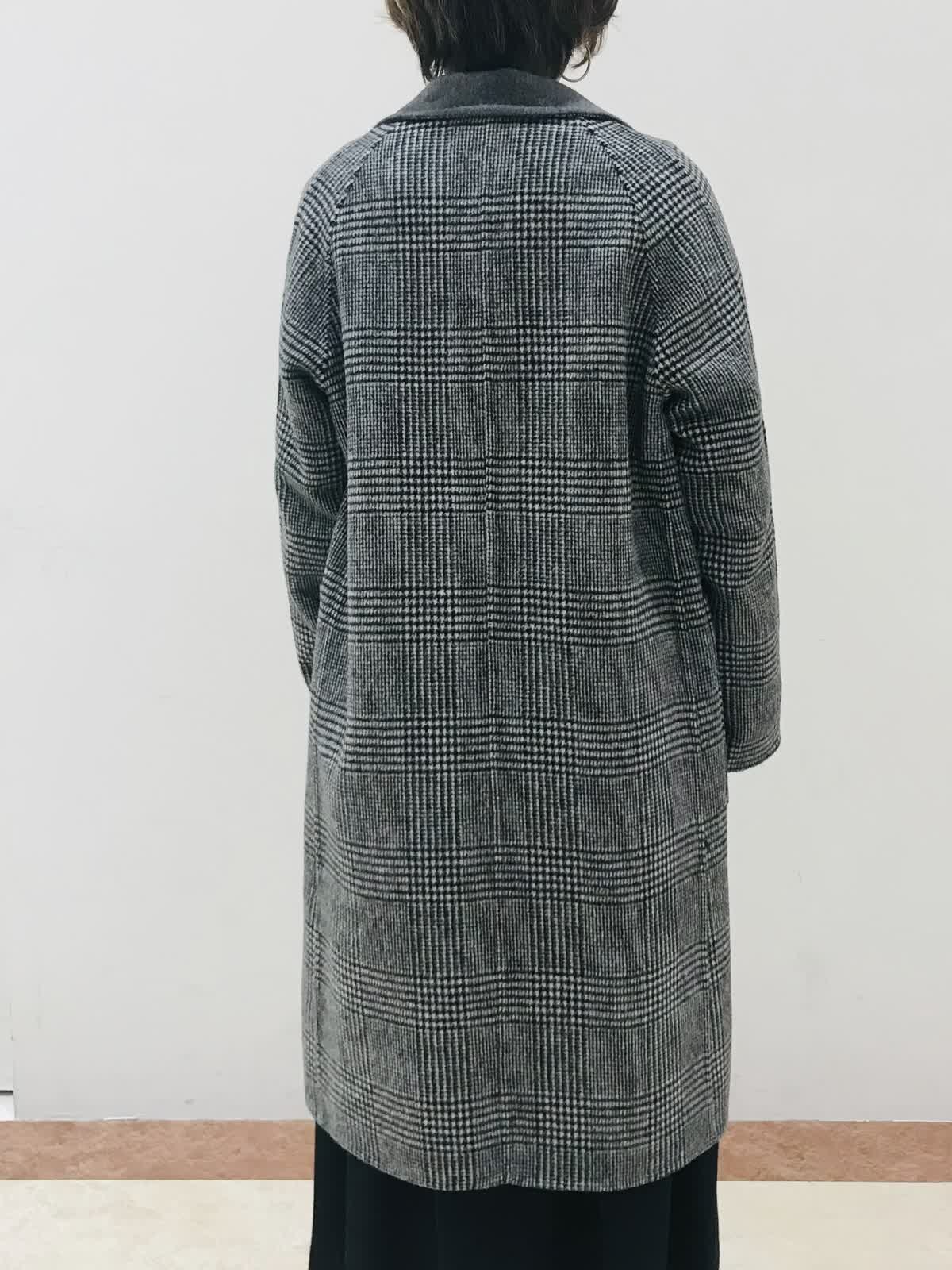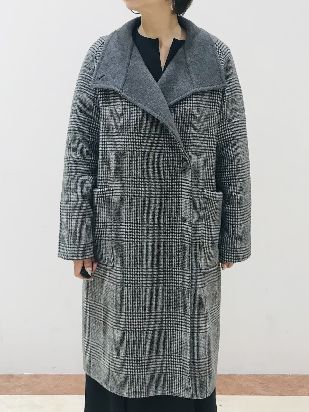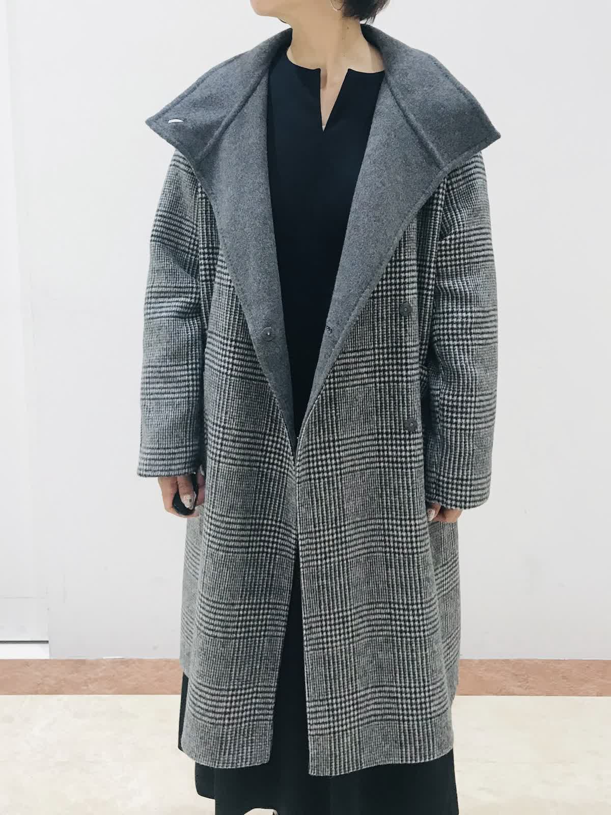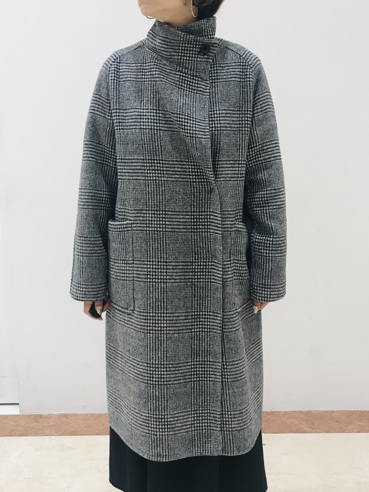 開けて着用してもボタンを閉じてスタンドカラーとしても着用出来るコートです。ゆとりのあるラグランスリーブなので中に着込めますし、動きやすい。軽量感あるコートがおすすめポイントです。
