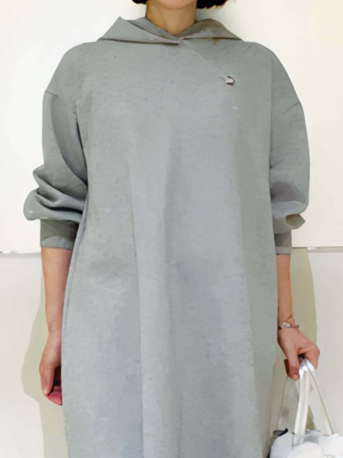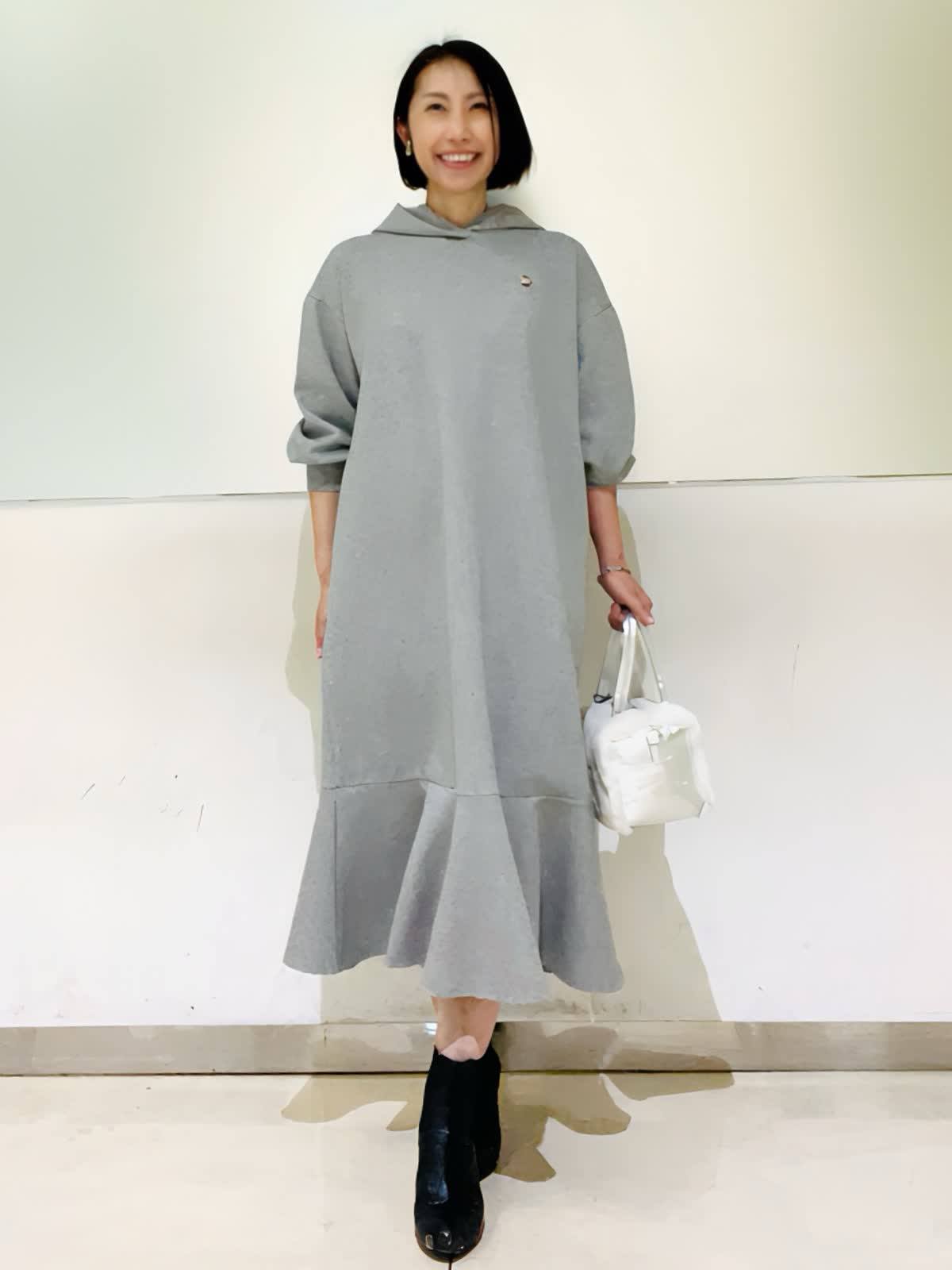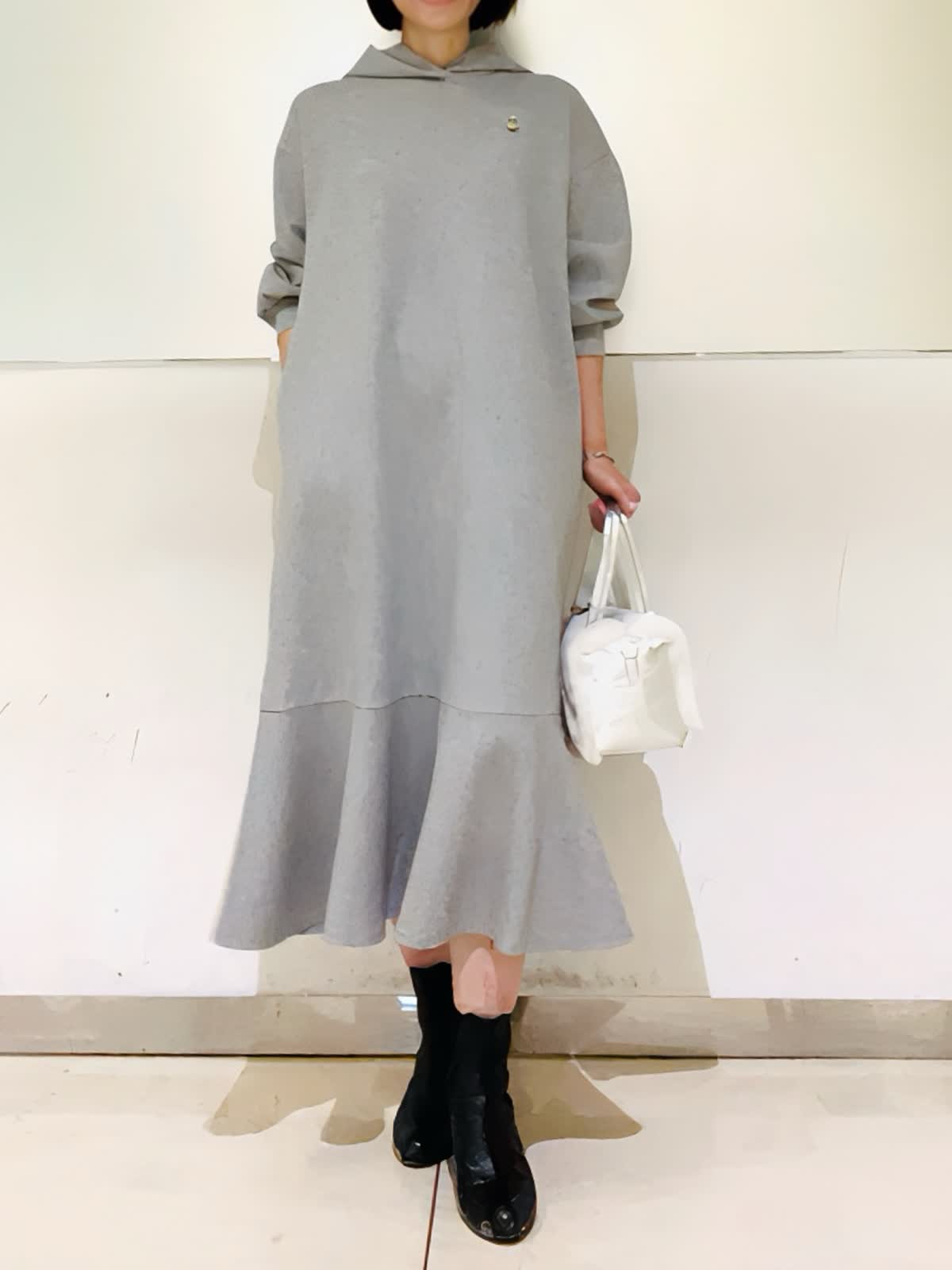 【着用アイテム】すべて9号 【着用カラー】ワンピース:グレー コート:ブラック 楽ちんで可愛いフーディワンピース。スポーティになりがちななフーディワンピースをマーリエらしくフェミニンなデザインに。ダンボール素材で体のラインが出にくく、楽ちんな着心地なのに可愛いが叶う優秀ワンピース。コートからフードを出して着るとより可愛いです。