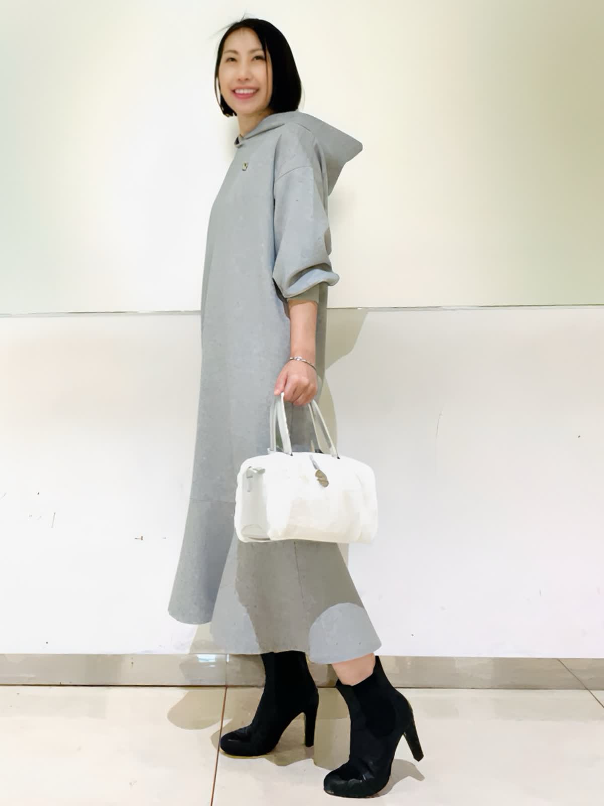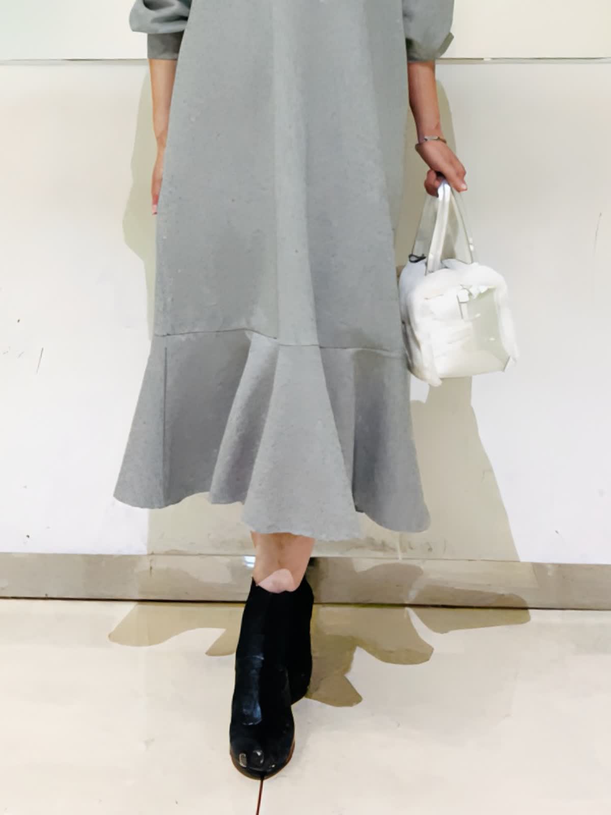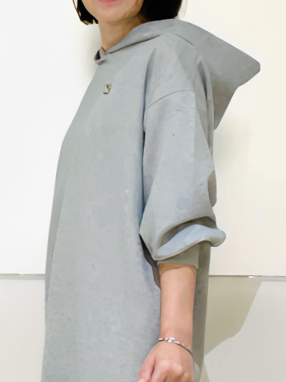 【着用アイテム】すべて9号 【着用カラー】ワンピース:グレー コート:ブラック 楽ちんで可愛いフーディワンピース。スポーティになりがちななフーディワンピースをマーリエらしくフェミニンなデザインに。ダンボール素材で体のラインが出にくく、楽ちんな着心地なのに可愛いが叶う優秀ワンピース。コートからフードを出して着るとより可愛いです。