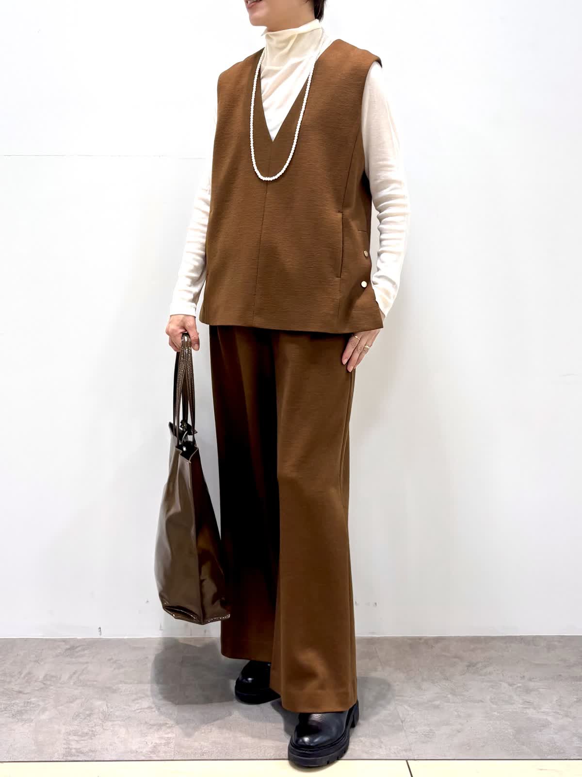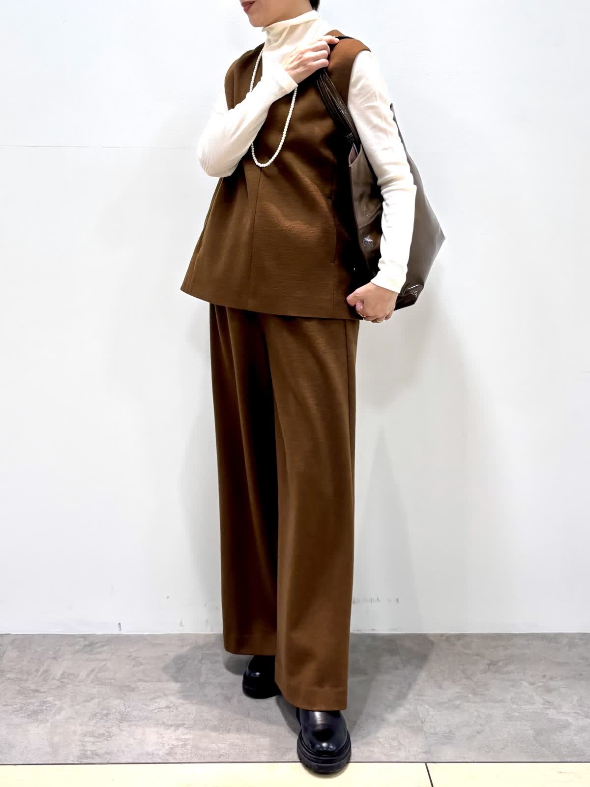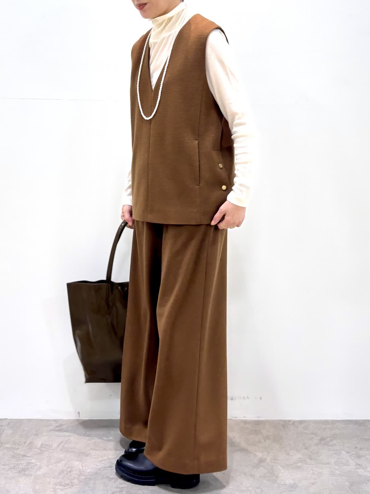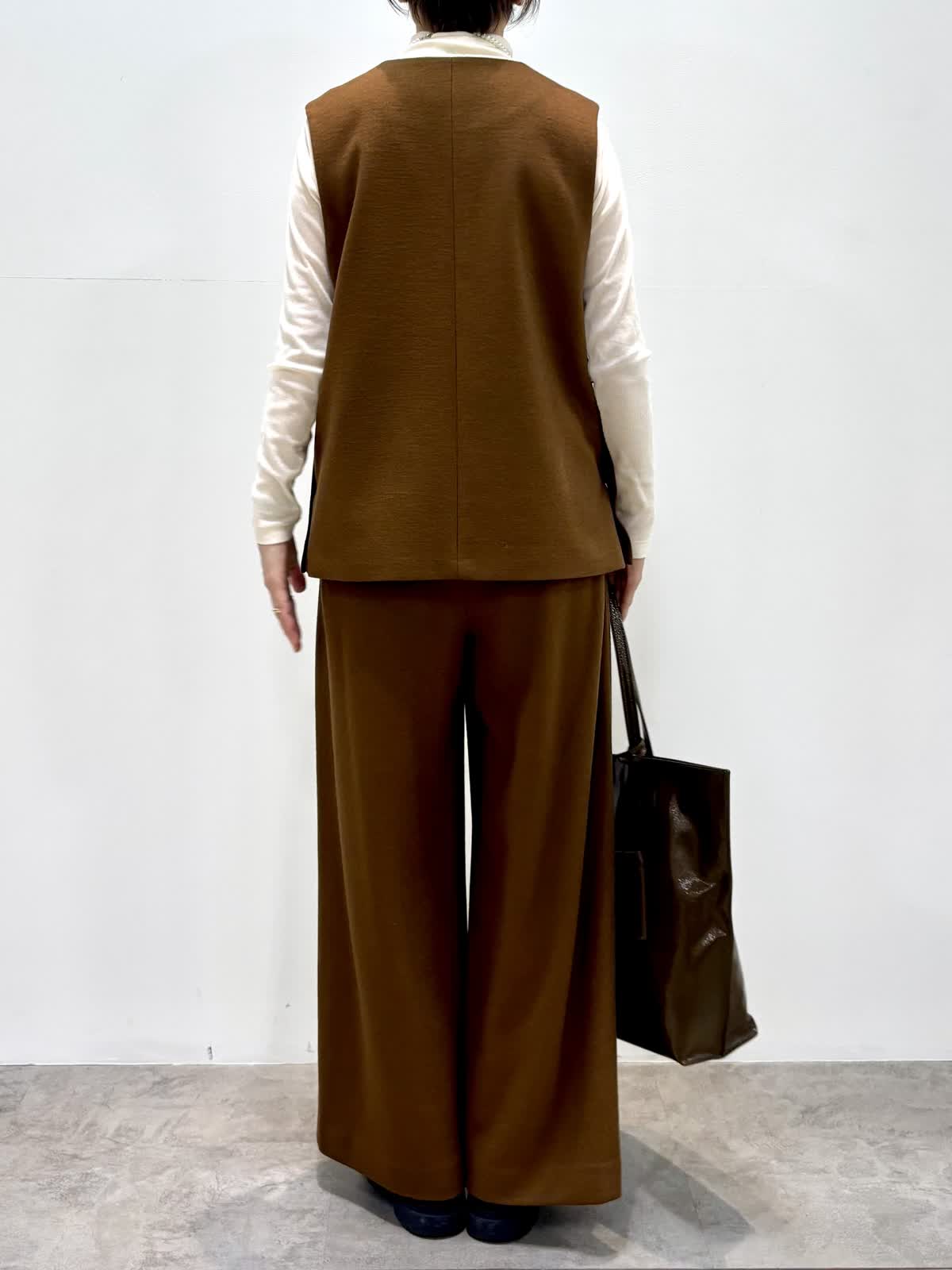 [着用サイズ]ベスト:9号 カットソー:9号 パンツ:9号 [着用カラー]ベスト:キンチャ カットソー:ホワイト パンツ:キンチャ 尾州のウールを使ったジャージウールは起毛感もあり温かいです。 セットアップでも単品でも着回しができるアイテムです。 パンツもドロストでノンストレスな履き心地です。