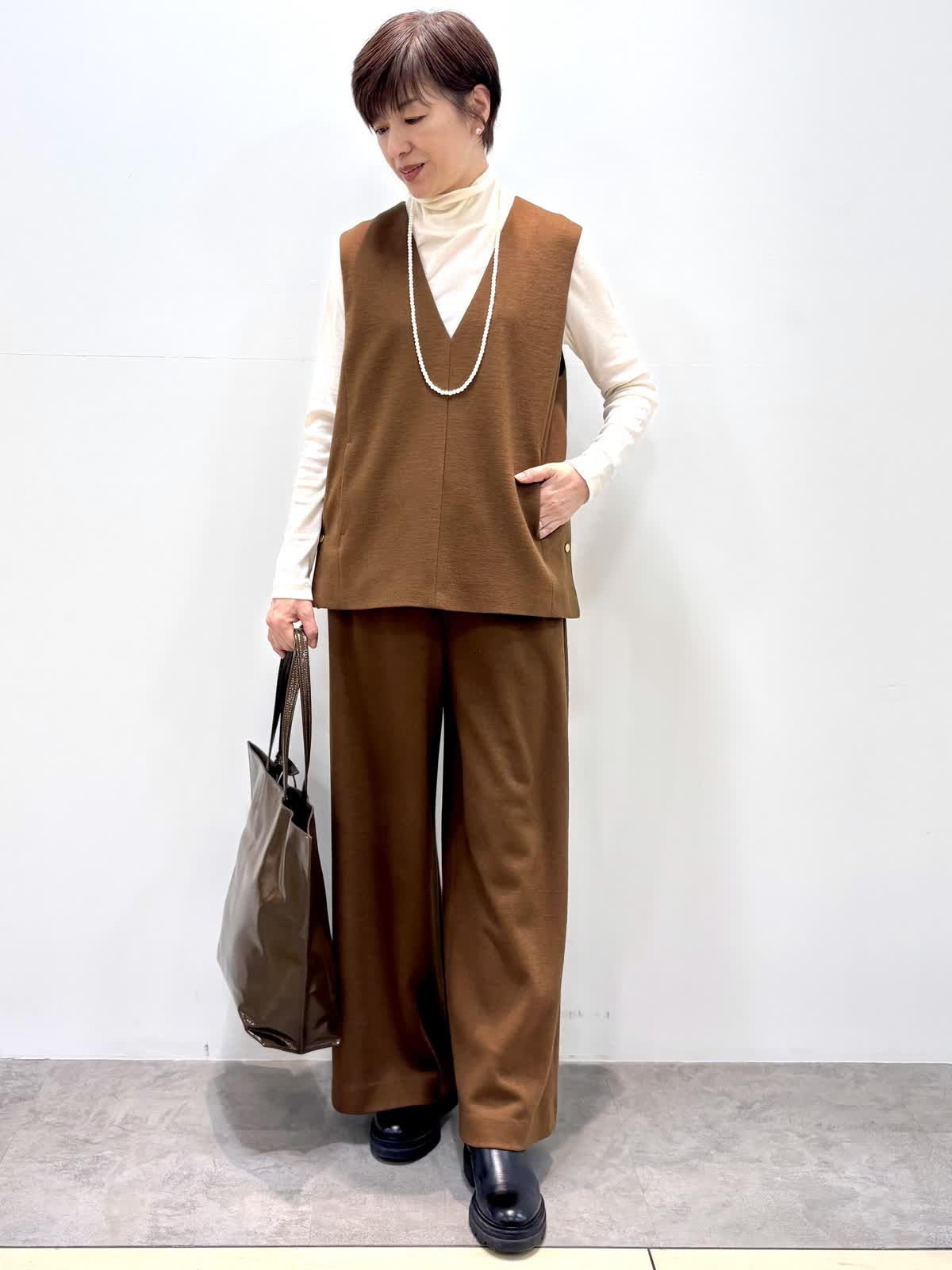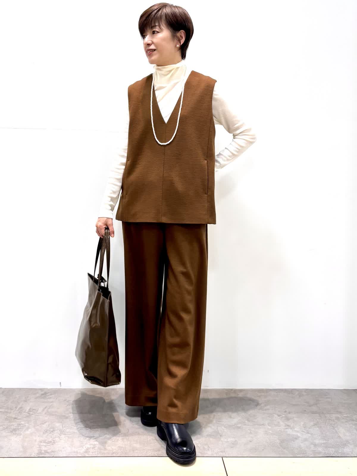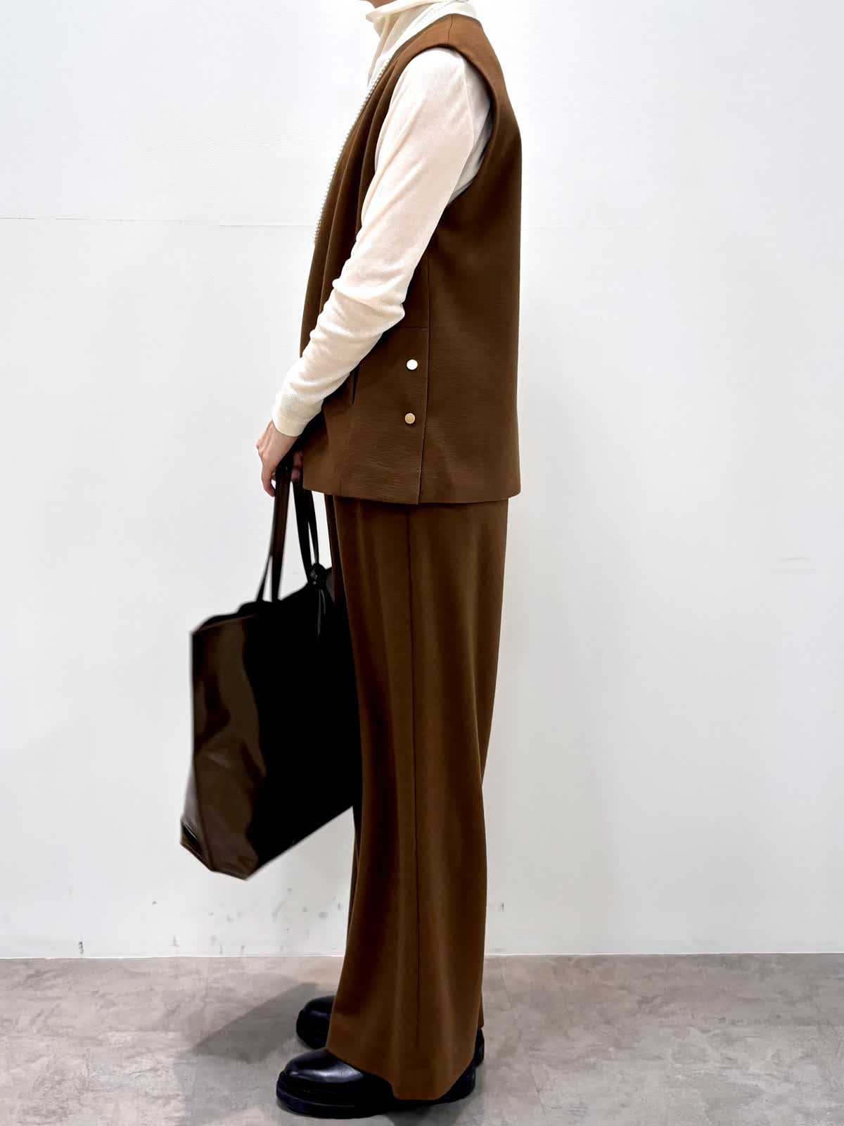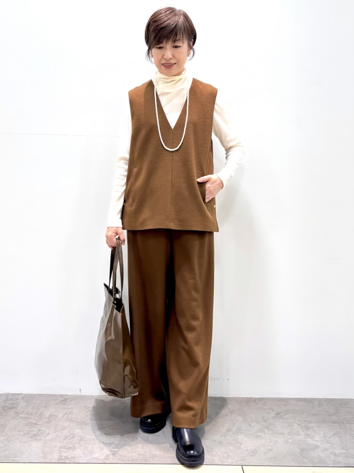 [着用サイズ]ベスト:9号 カットソー:9号 パンツ:9号 [着用カラー]ベスト:キンチャ カットソー:ホワイト パンツ:キンチャ 尾州のウールを使ったジャージウールは起毛感もあり温かいです。 セットアップでも単品でも着回しができるアイテムです。 パンツもドロストでノンストレスな履き心地です。