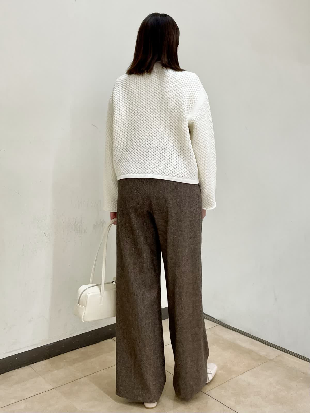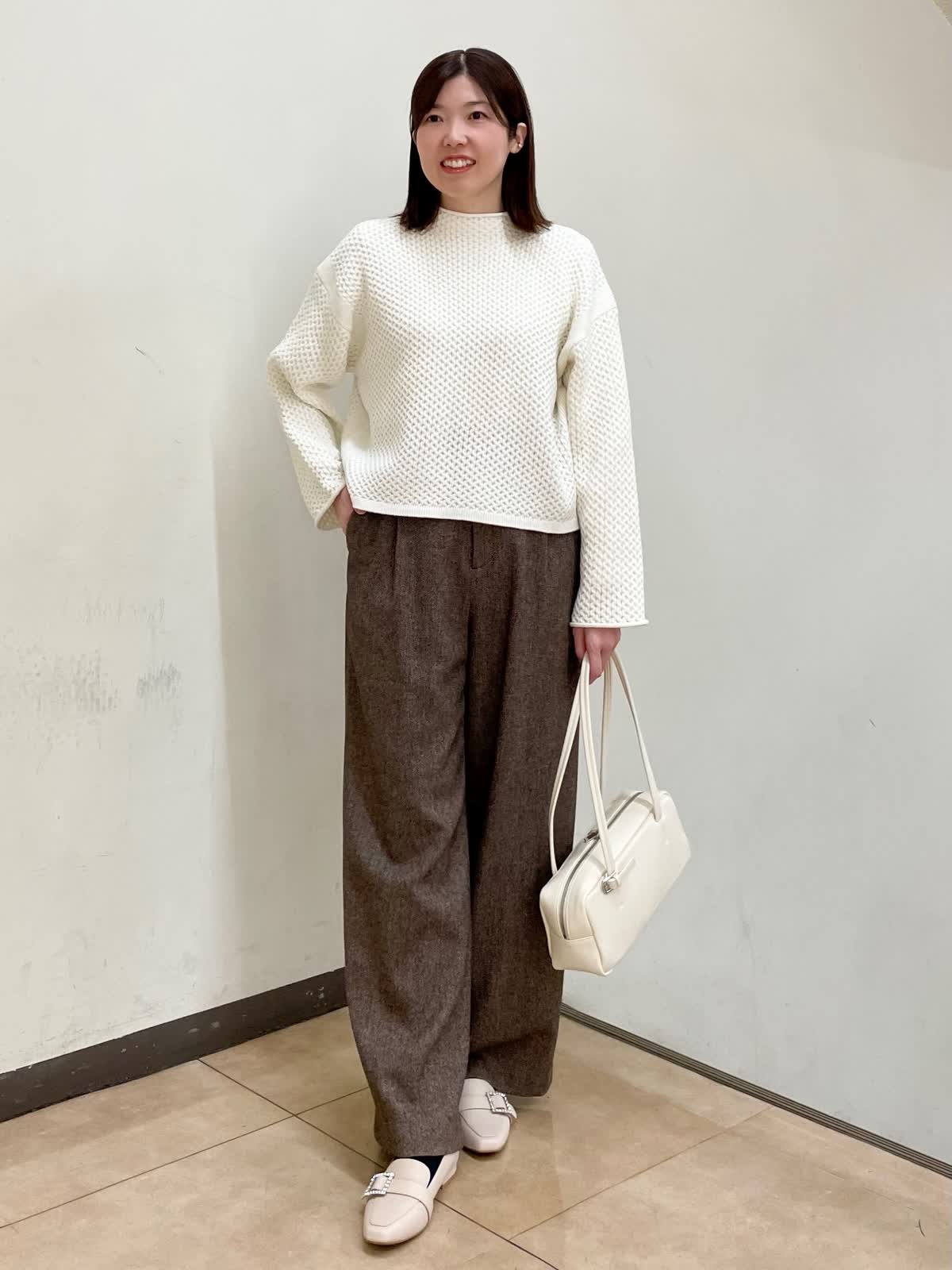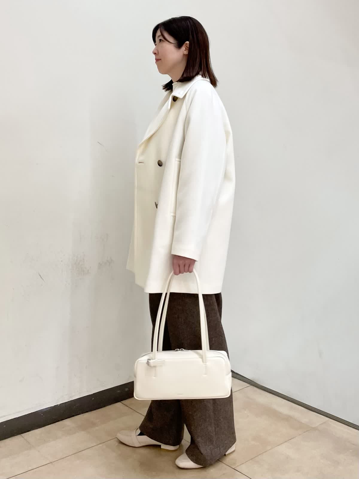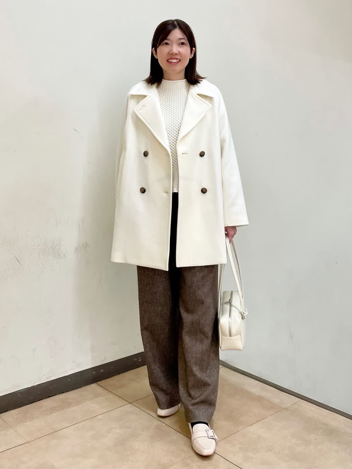 【着用サイズ】コート:フリー ニット:フリー パンツ:11号 ミドル丈のPコートはヒップが隠れる丈でパンツスタイルにもピッタリ。リラックス感のあるサイジングなので厚手のインナーも着用していただけます。