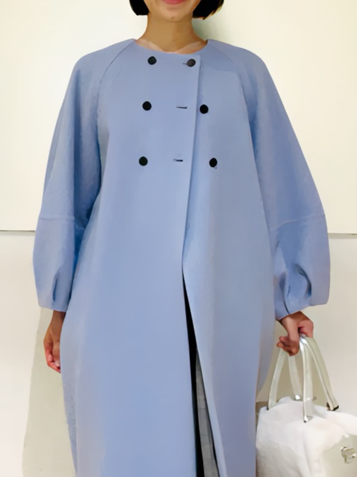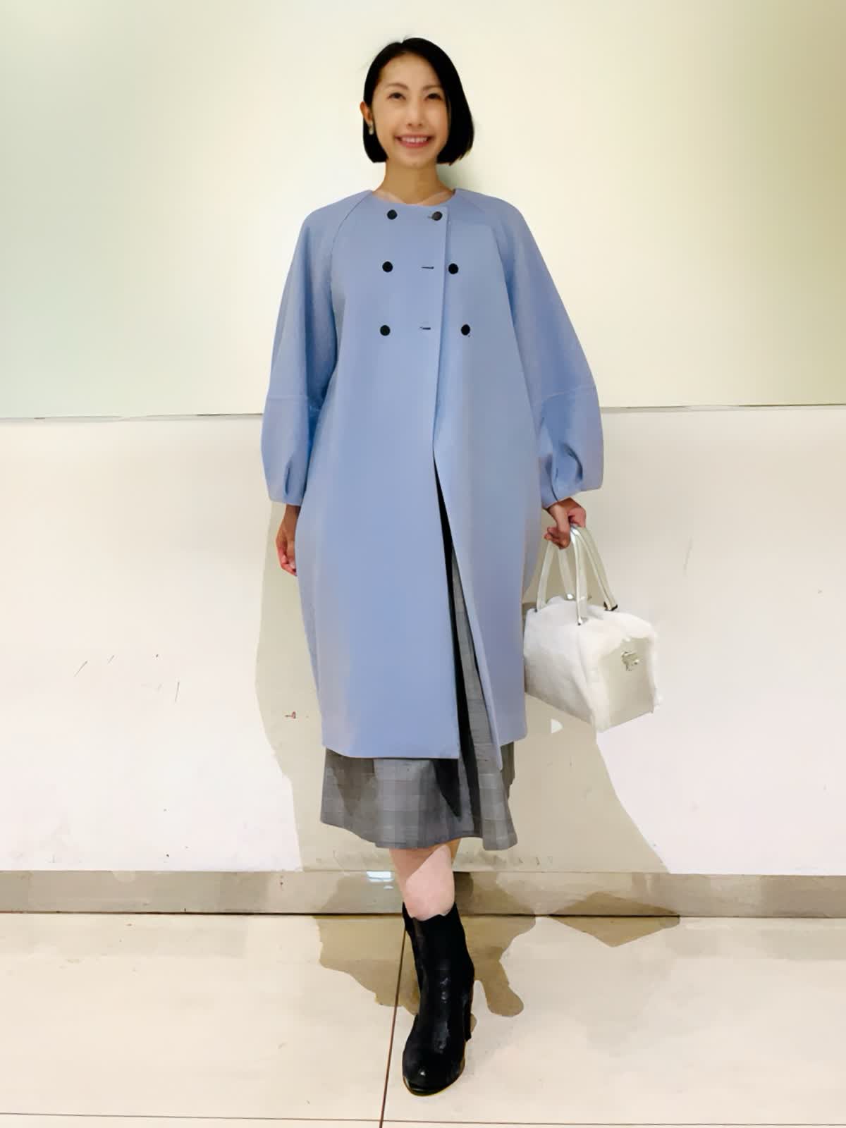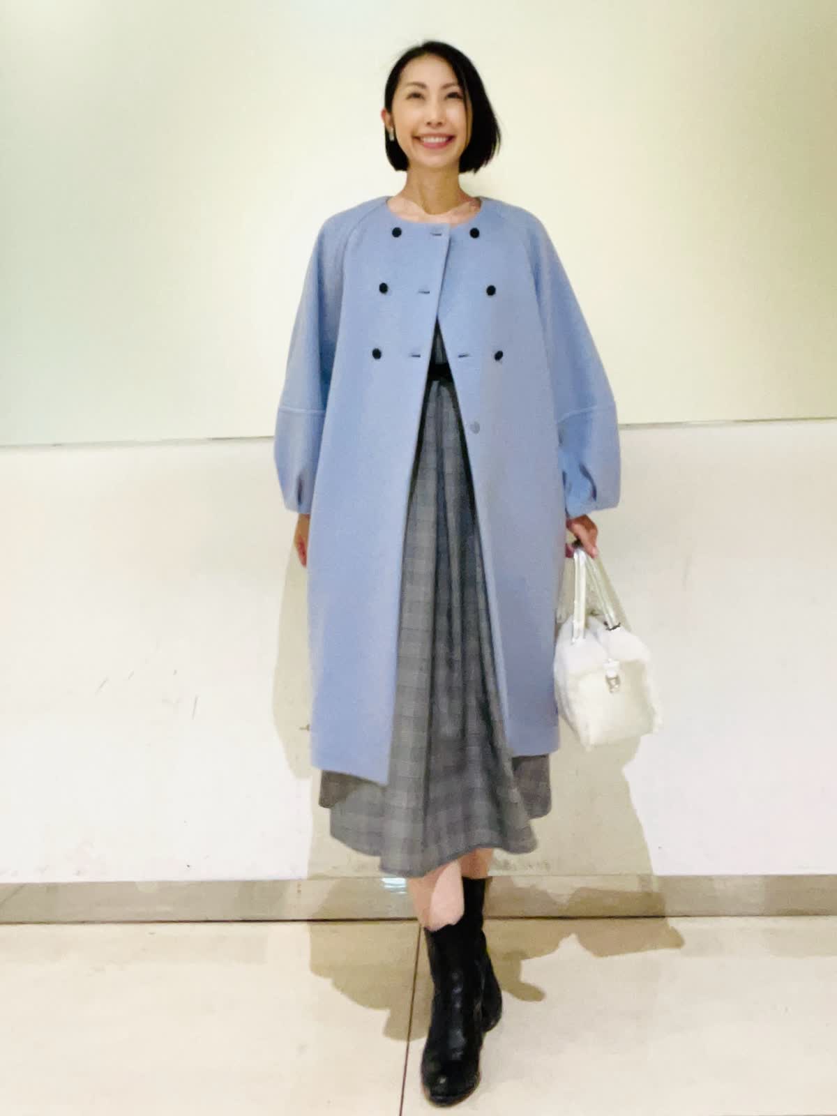 【着用アイテム】すべて9号 【着用カラー】コート:サックス ワンピース:グレンチェック 冬の装いを華やかにしてくれるサックスカラーのコートをコクーンシルエットとふんわり袖が可愛いデザイン。胸元のブラウスのボタンがポイントです。年末年始のイベントにもおすすめなコーディネートです。