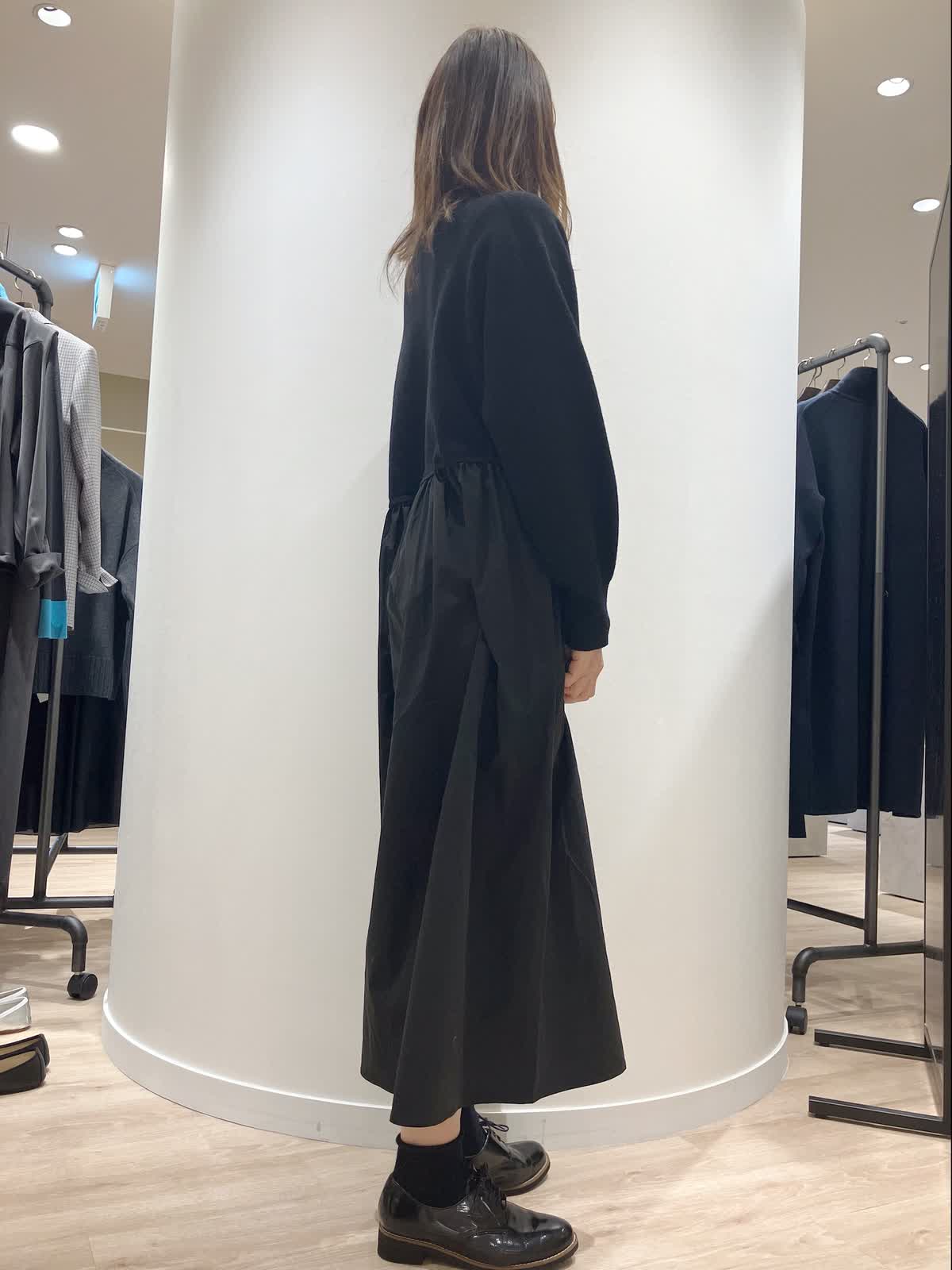 【着用サイズ】ワンピース:9号【着用カラー】ワンピース:ブラック コーディネートのテーマはクリスマスのお出かけスタイリングです。 ドッキングワンピースは、タフタ素材のスカート部分がふんわりとして女性らしいデザイン。ボトルネックの首元も上品です。バッグと靴をエナメルにして、オールブラックでもおしゃれ感漂うスタイリングに。クリスマスなど、冬のお出かけにおすすめのコーディネートです。